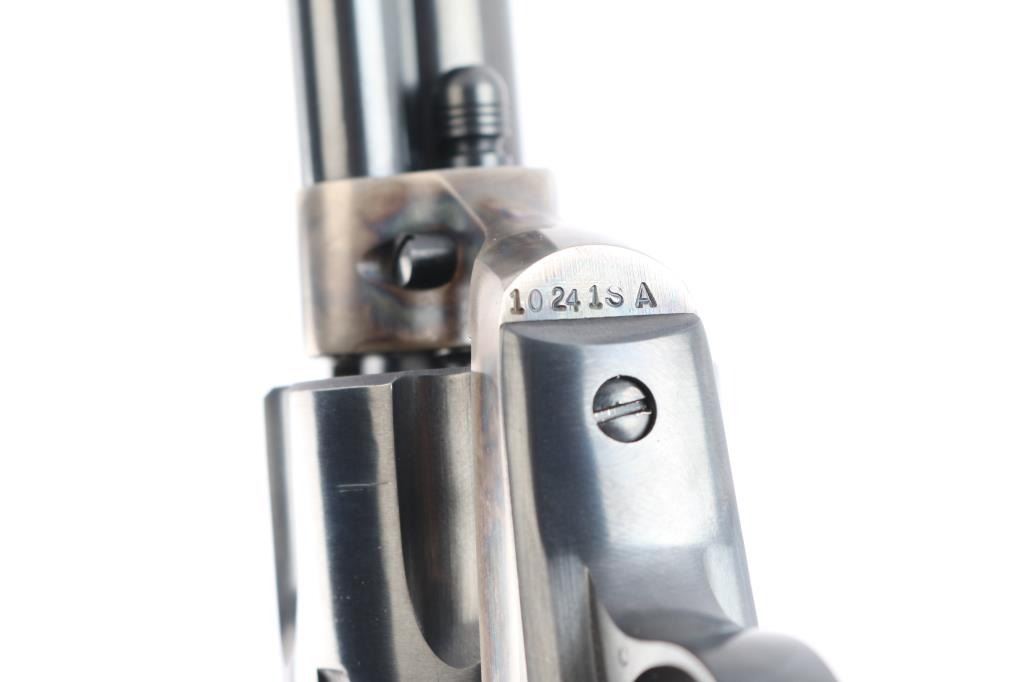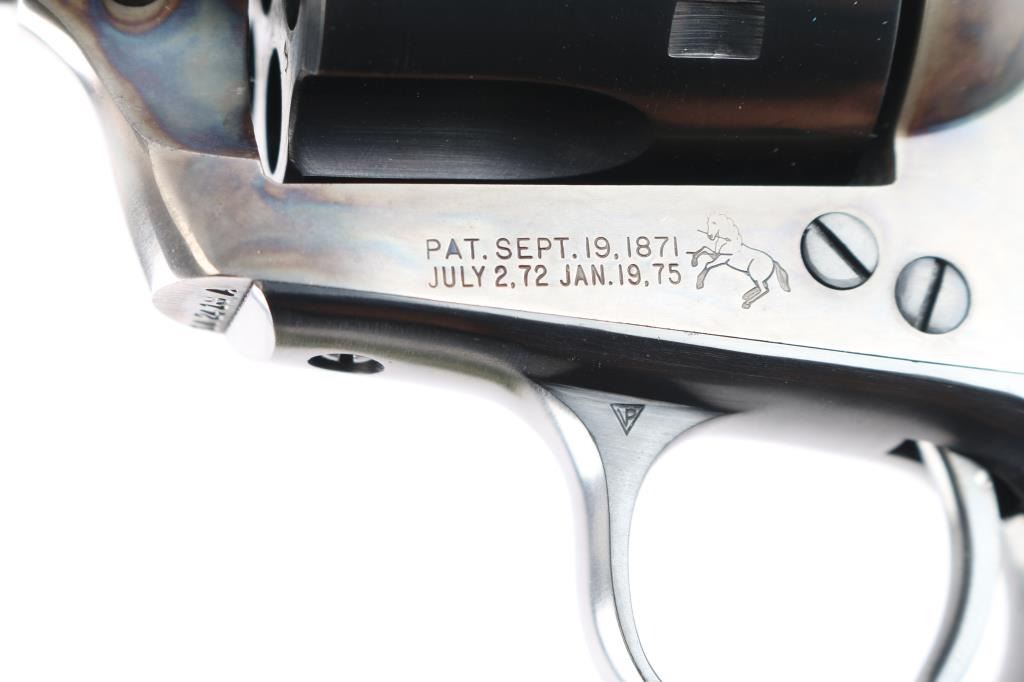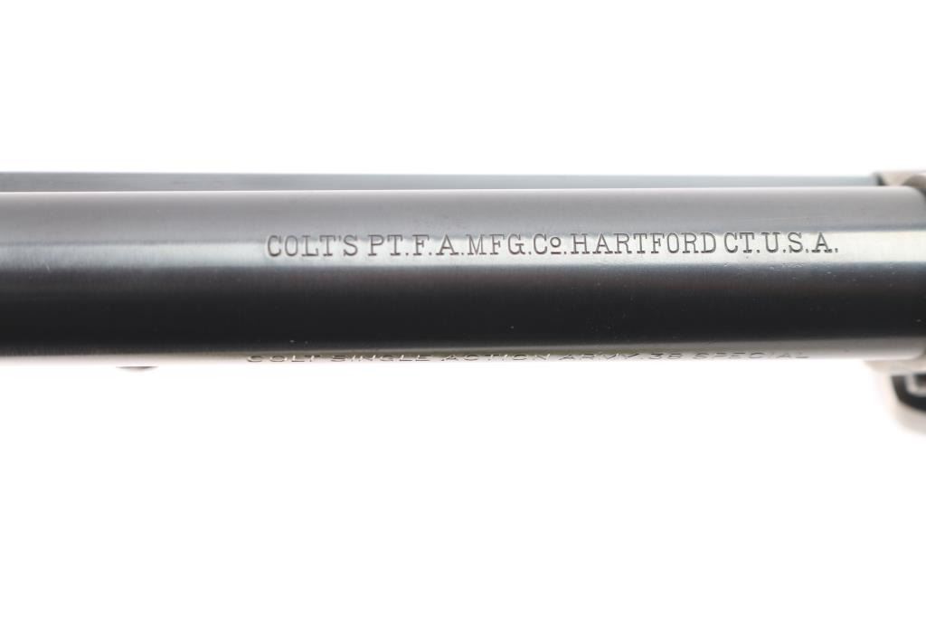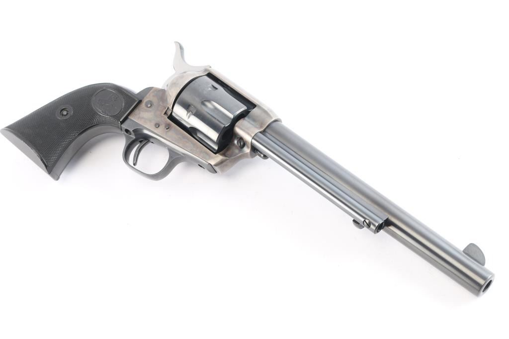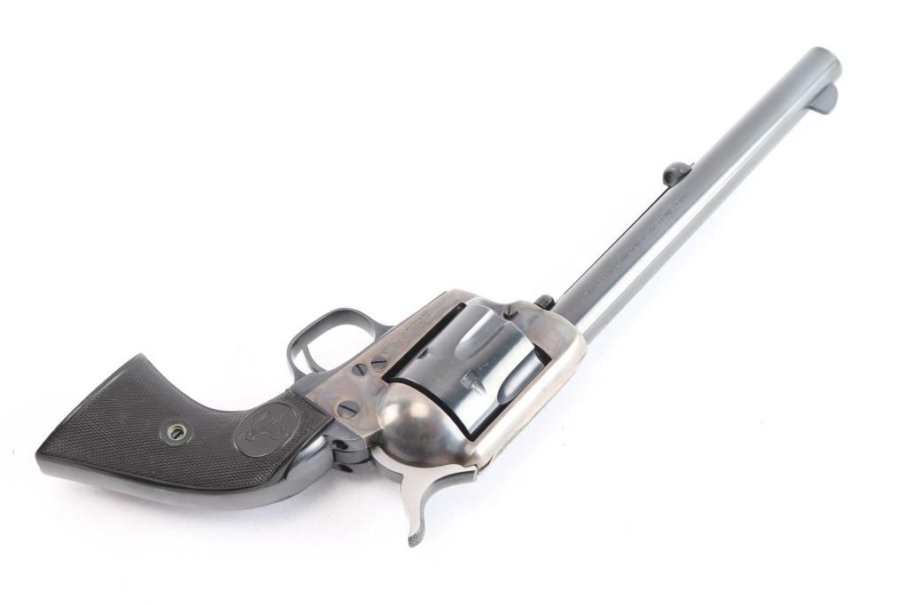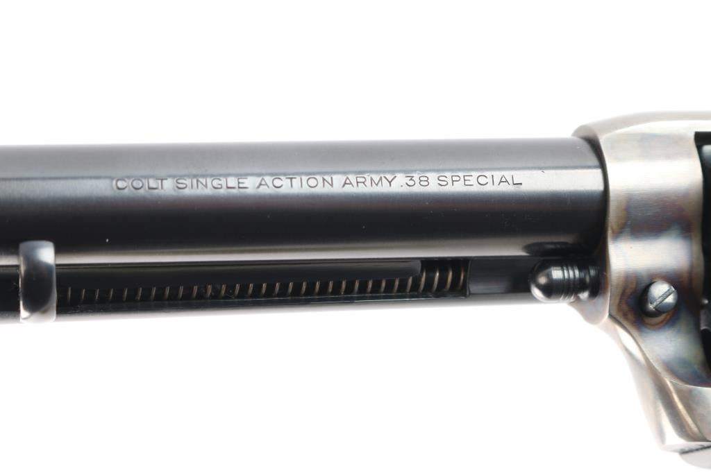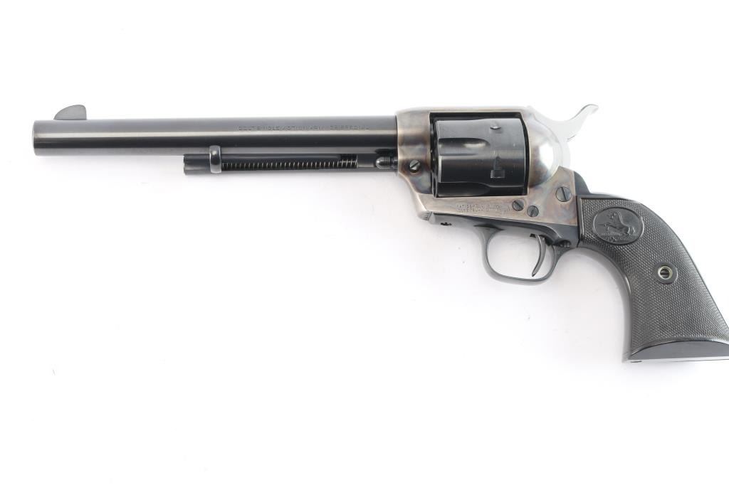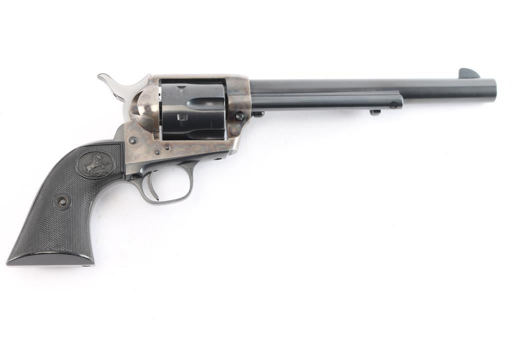 Vintage Colt Single-Action. 2nd Generation SAA manufactured 1957. Produced 1956-1974. 7.5" barrel with blade/notch sights, 6 round fluted cylinder. Blued finish with case-hardened frame. Smooth thin trigger, hammer has polished sides, factory black checkered grips with 'Rampant Colt' motifs. One-line Colt address on top of barrel. "Colt Single Action Army .38 Special" on left side of barrel. Two-line patent dates and "Rampant Colt" on left frame. Left triggerguard has triangle proof, and "J". Right triggerguard has "C". Assembly # 132" on loading gate and cylinder. Cylinder face has small 'Rampant Colt'. Action is crisp/tight, bore is excellent/bright, grips are excellent. Blued finish is about 98% with minor edge wear/scratches.