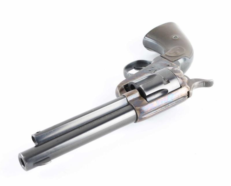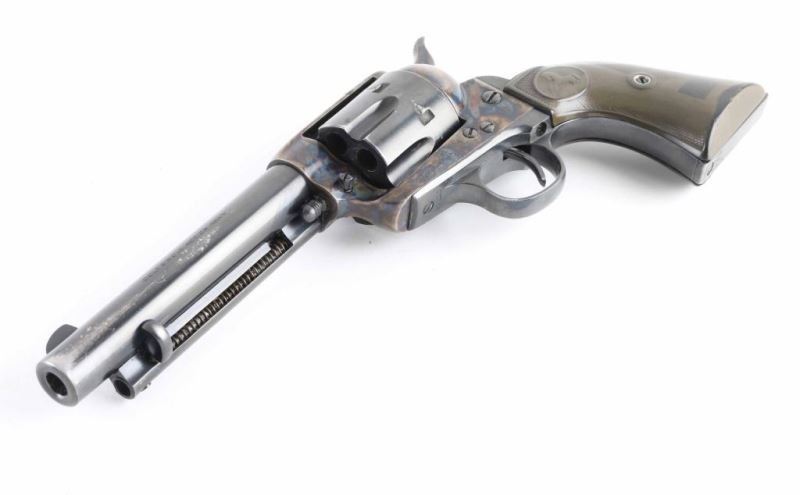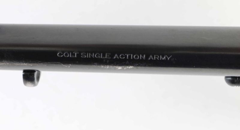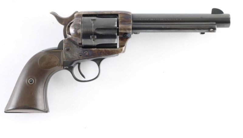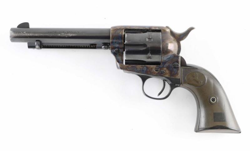 Revolver. Single-Action. 6 rd capacity. This Revolver has been reworked-re-barreled, and re-finished. Cylinder possibly replaced. 1st Generation. Manufactured 1902. 4.75 barrel with front blade, and top strap notched rear sight. Assembly # 94 on loading gate. Blued metal metal finish. One line Colts address on right barrel above ejector housing. Side stamped "Colt Single Action Army". (Newer barrel) 2 line patent dates, with Rampant Colt on left frame. Black checkered Rampant Colt grips. Cylinder indexes properly, and hammer locks up tight. Old re-blue/Case-hardening is about 80% with edge wear, cylinder tracking lines, scuffs/scratches. There is some minor rust spots on the cylinder. Cylinders are good, but dirty. Bore appears excellent/bright. Grips are worn smooth, and are a green/brown color (Paint?) Matching Serial # 's. NRA Condition-Good/Re-Worked. Modern Firearm.