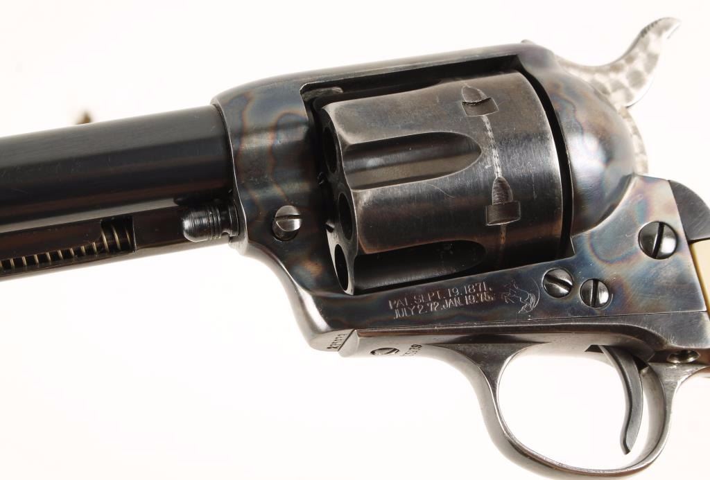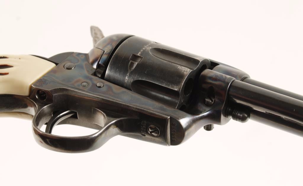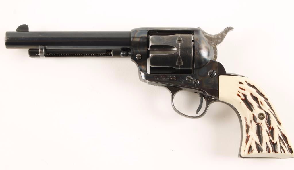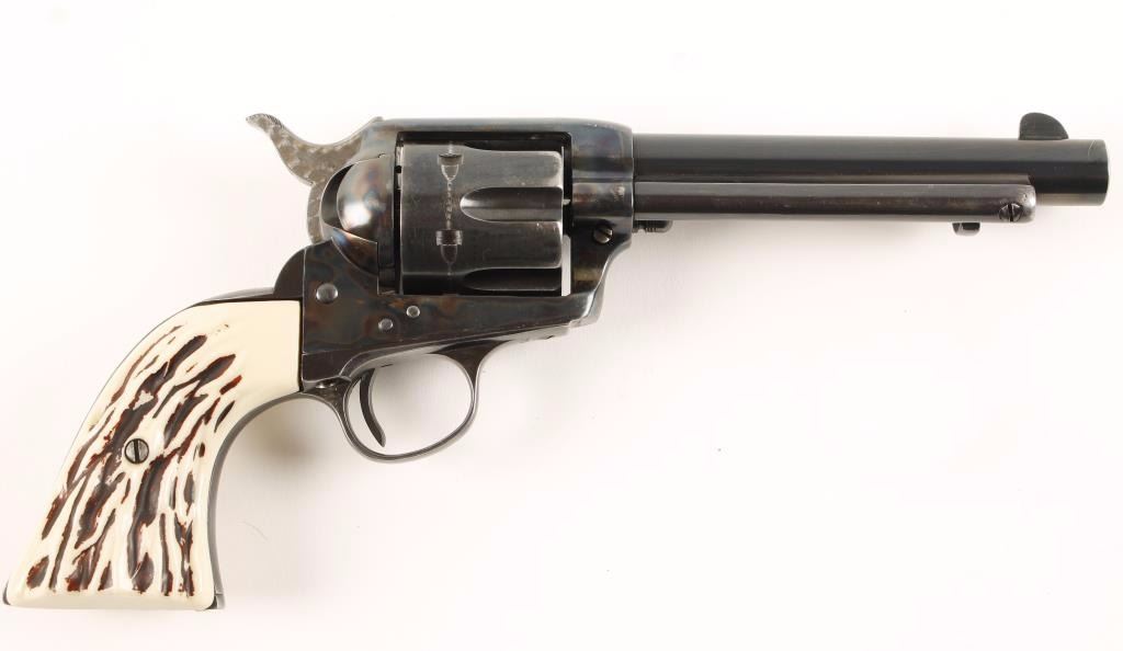 'First Generation' Customized and refinished single action revolver rechambered in .38 Special, manufactured 1901. Features a blued 5.5" sleeved barrel, ejector rod, blade front sight. v-notched rear sight, case hardened frame, jeweled hammer with checkered spur, sleeved six shot fluted cylinder and two piece Great Western faux stag grips. Finish on barrel is bright with only minor muzzle wear, case colors on frame are good and cylinder retains 70% bluing with a moderate/heavy drag line & edge wear. Markings on frame are good and there is a crisp"+ 38 Special +" stamped on top of barrel with no other markings. Action is very strong, lockup is tight, bore is bright and grips are fine. Condition is very good as refurbished. ***C&R Firearm*** ***Modern Firearm***