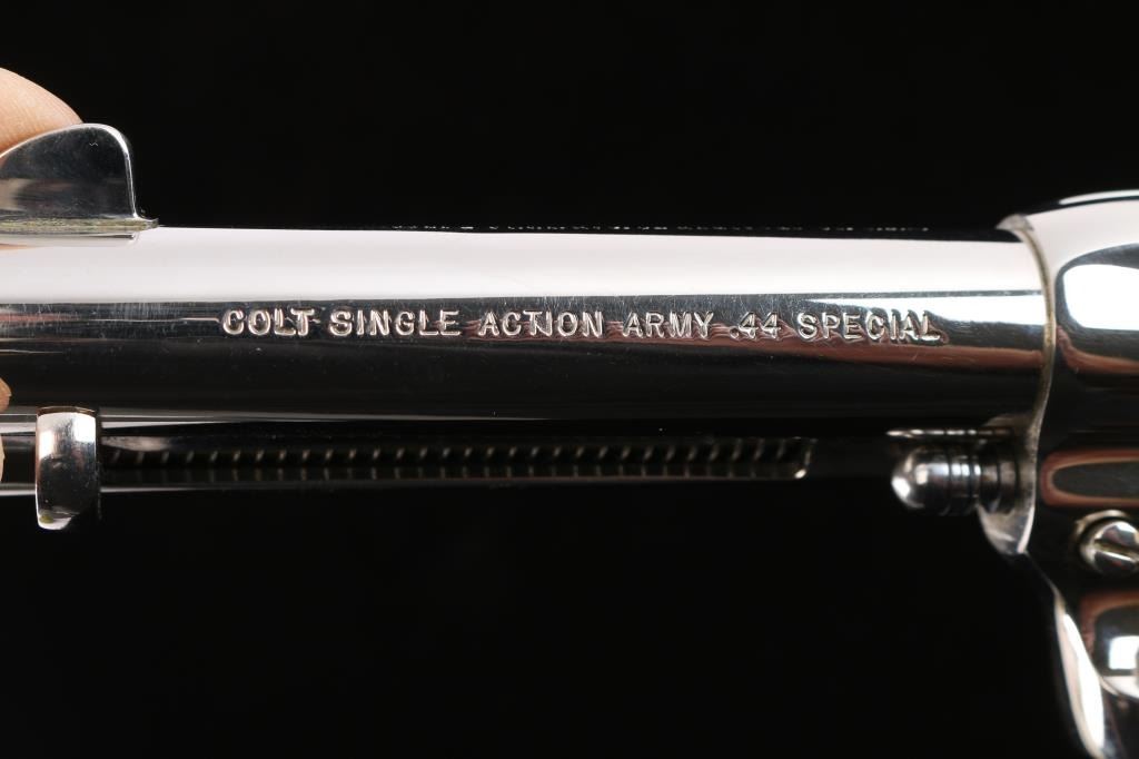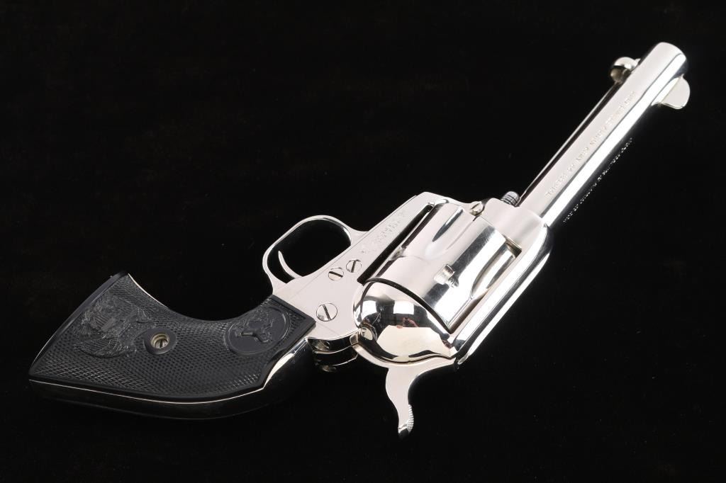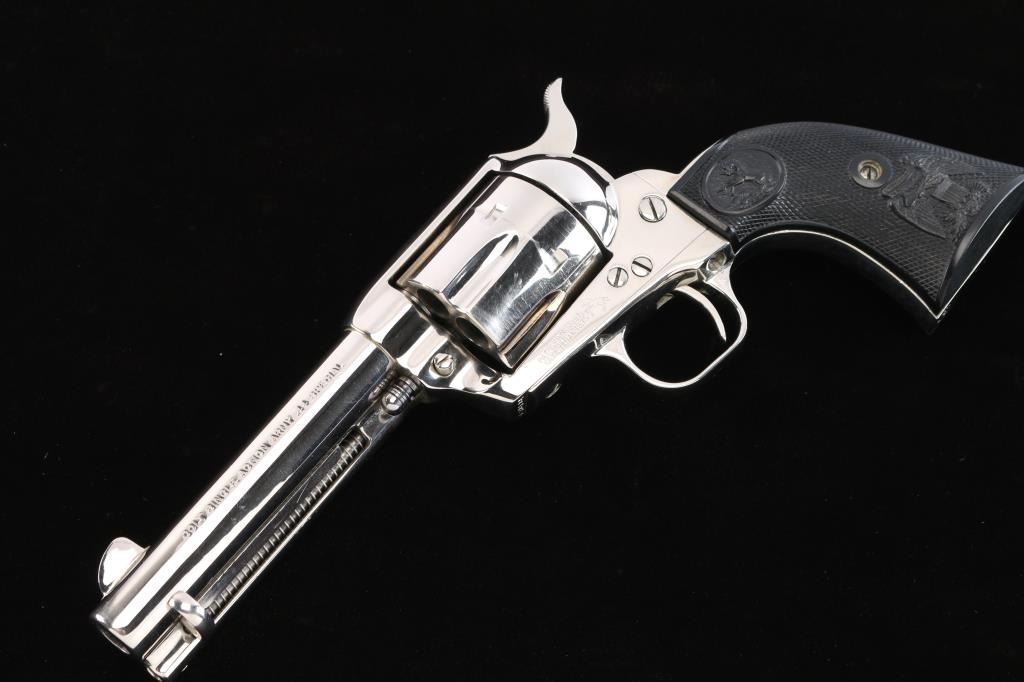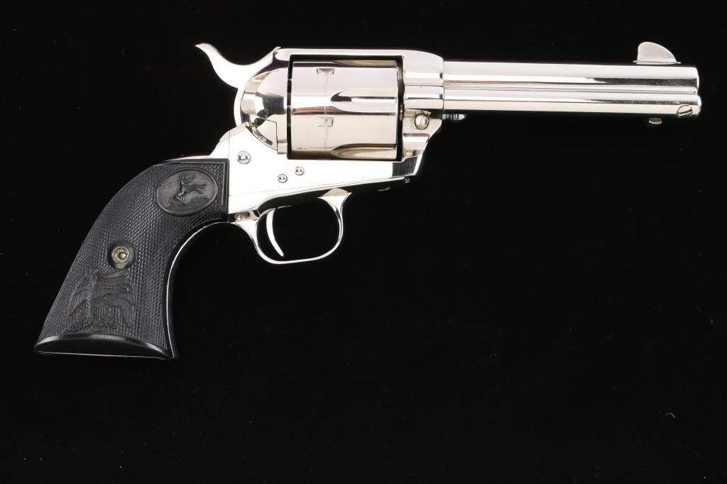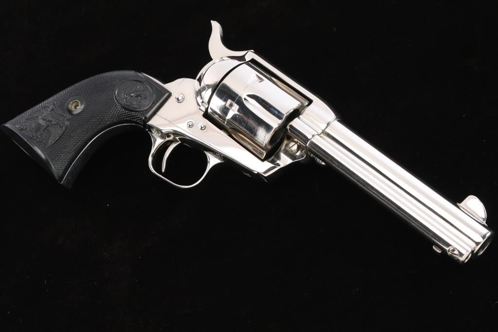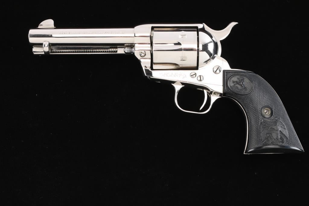 'Third Generation' of the classic Single Action Army revolver, 'Model of 1873,' chambered for .44 Special, manufactured circa 1984 in Hartford, CT. Featuring a high luster nickel finish, 4-3/4" barrel, checkered hammer spur, fixed blade front sight, notched frame rear sight, firing pin on hammer nose, fluted six-round cylinder, collard cylinder pin head, bird's head style ejector, and black plastic checkered "eagle" grips with embossed eagle and Rampant Colt logo. There is a two-line patent date marking on the left side of the frame. The original nickel finish retained is approximately 99% with only superficial scratches and blemishes. Metal displays no rust or deformation. Bore is bright with strong rifling, and the cylinder chambers are also excellent. Grips are excellent, and the action is smooth and crisp with a good lock-up. The front sight is loose.