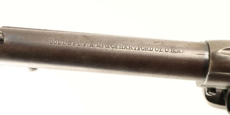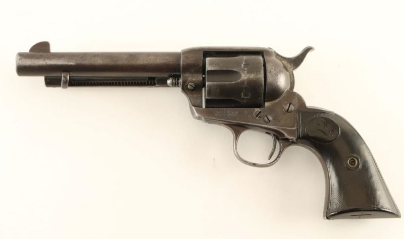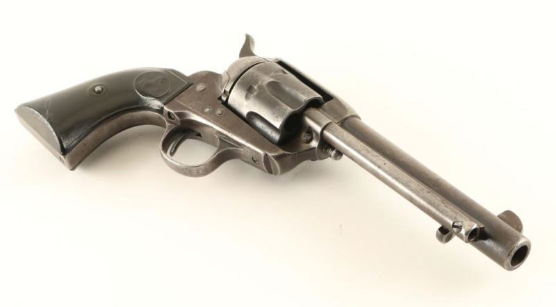 'First Generation' Vintage single action six-shot revolver chambered in .45 Colt, circa 1915. Features a blued & case hardened finish, 5 1/2" bbl with single line address, ejector rod, blade front sight, 'v' notched rear sight, fluted cylinder, knurled hammer spur and checkered two-piece black hard rubber grips w/ Rampant Colt decor. Revolver retains less than 10% of it's original finish showing a small amount of strong finish retained in the protected areas and the balance comprised of a nicely aged brown patina. Action is strong with three clicks, bore is good showing some light scattered pitting and the hard rubber grips are good+ as worn smooth. Condition is NRA good++. ***C&R Firearm***