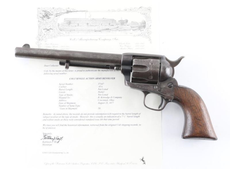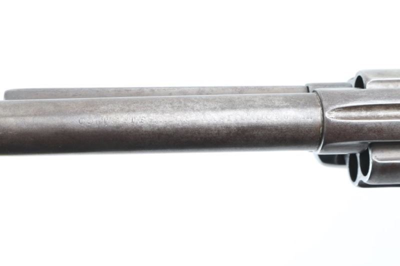 '1st Generation' Single action revolver manufactured circa 1877. Features 7-1/2" barrel, fixed sights, single piece walnut grip, center pin held by screw, bull's eye ejector rod head. Bore is good condition, several pitted areas, some strong rifling present. Charge holes are dark and show some roughness. Metal surfaces are a slightly mottled brown with some gray color, darker in protected areas, some bare metal on edges. Wood grip is good condition, showing slight shrinkage, dents and scratches. Markings are eroded, with single line barrel address difficult to read with portions missing. Serial number repeated on triggerguard & back strap. No caliber marking observed. Action is smooth with fair lock-up. Includes Colt letter which indicates original finish was nickel (some tiny traces observed in rear sighting channel). Condition is NRA Good *** Antique Firearm *** [From the Jim Sigmon Collection]