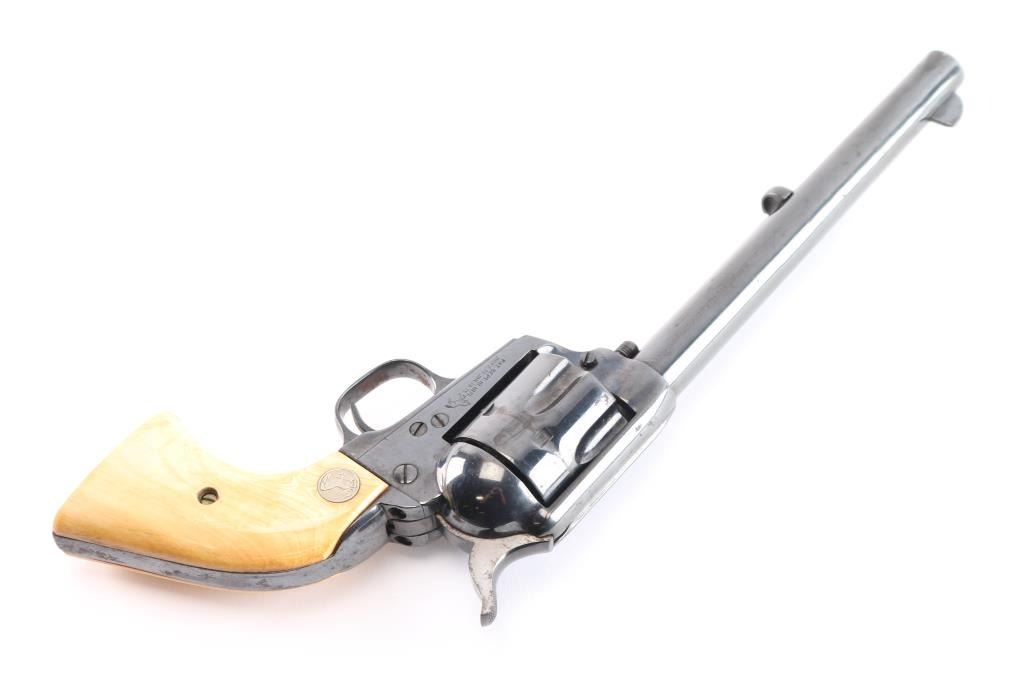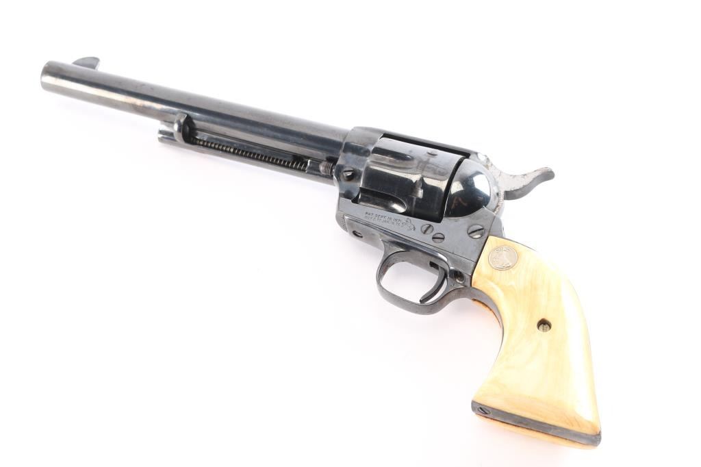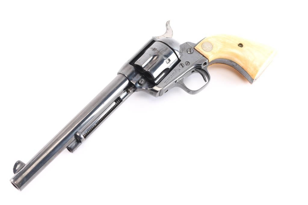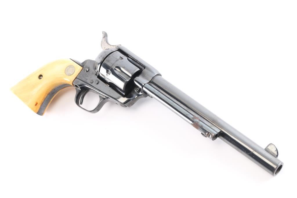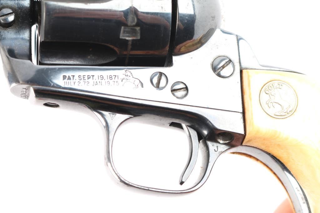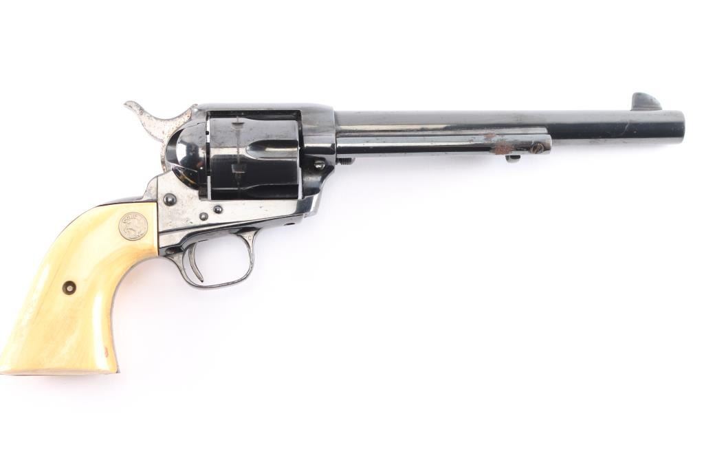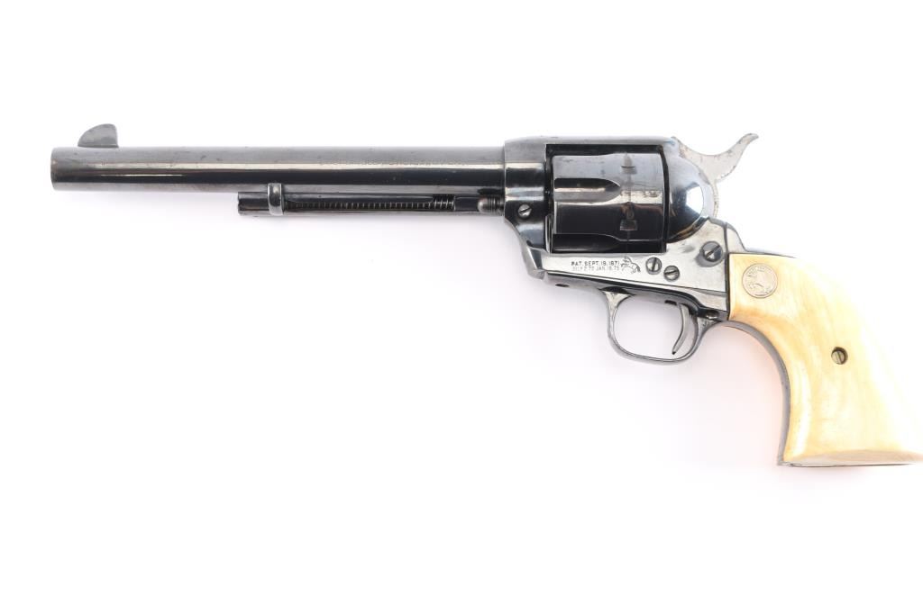 Vintage Colt Single-Action. 2nd Generation SAA manufactured 1957. 7.5" barrel with blade/notch sights, 6 round fluted cylinder. Blued finish barrel and frame. Smooth thin trigger, hammer has polished sides, ivory grips showing age with caramel coloring with silver Colt medallions. One-line Colt address on top of barrel. "Colt Single Action Army .45" on left side of barrel. Two-line patent dates and "Rampant Colt" on left frame. Left trigger guard has triangle proof, and "J". Right trigger guard has "C". Cylinder face has small 'Rampant Colt'. Action is crisp/tight, bore is excellent/bright, grips are excellent. Re-blued finish is about 90% with minor edge wear/scratches and scattered surface rust.