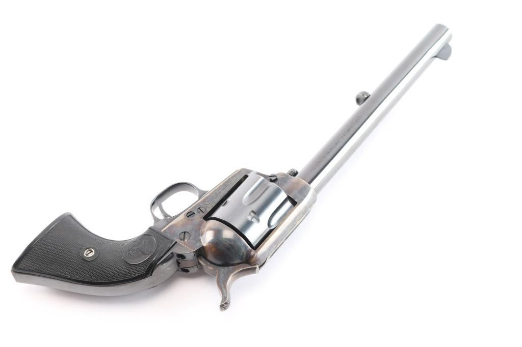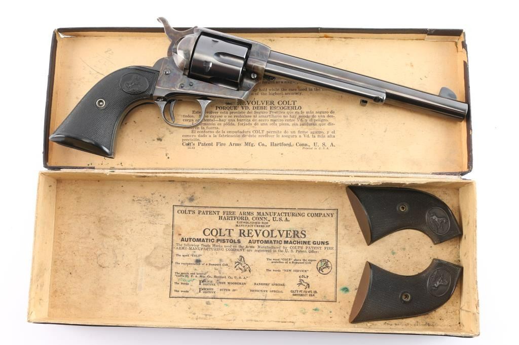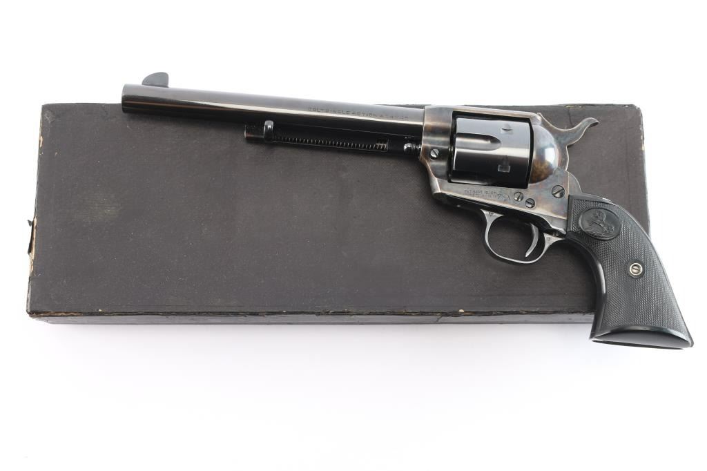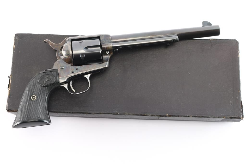 Vintage Colt Single-Action Army chambered in .45 Colt. This is a late 1st Generation revolver manufactured in 1932 in Hartford, CT. It features a 7.5" barrel with a blade front sight, notch sight in the rear, smooth curved thin trigger, checkered hammer spur, factory black checkered grips with 'Rampant Colt' motifs, and a six round fluted cylinder. Most of the firearm has a blued finish with a case-color hardened frame, loading gate, and hammer. There is a one-line Colt address on top of the barrel. "Colt Single Action Army .45" is stamped on left side of barrel, and a two-line stamping displays the patent dates and "Rampant Colt" on left of the frame. The left triggerguard has triangle proof, and a "J". The right triggerguard has what looks to be an "F". The action is crisp/tight, the bore is excellent and bright, and the grips are excellent. This pistol has been factory quality refinished. The blued refinish is about 98% with minor edge wear and blemishes. The color-case parts of this revolver are also excellent. This revolver comes with a period factory box, and an extra set of hard rubber grips.
