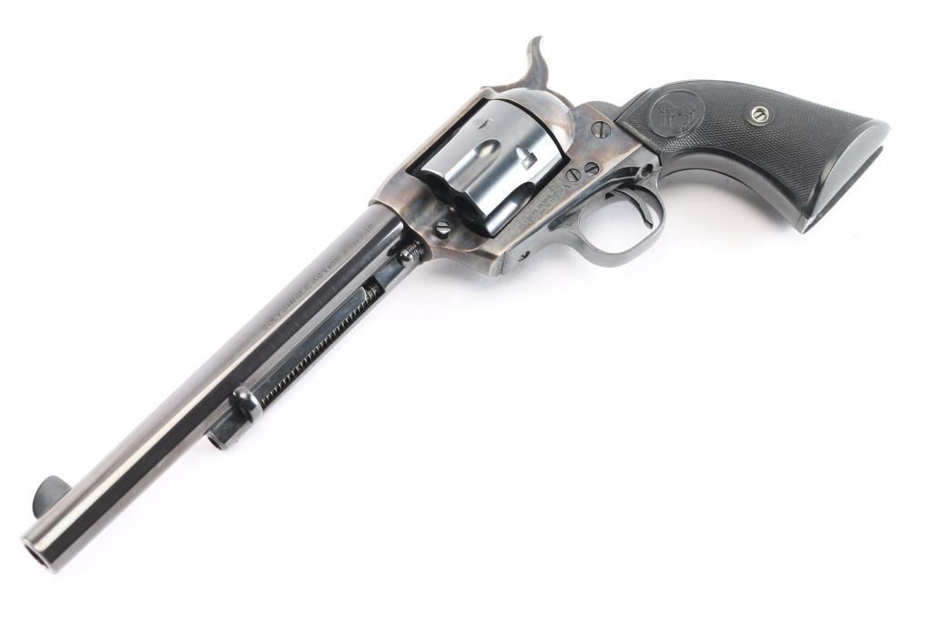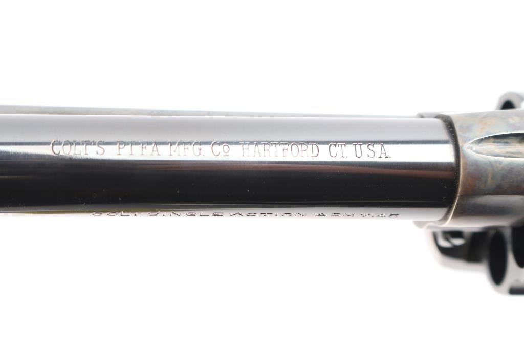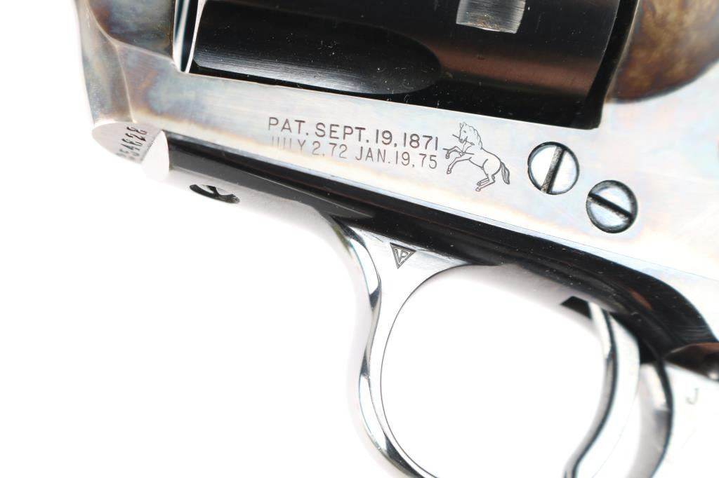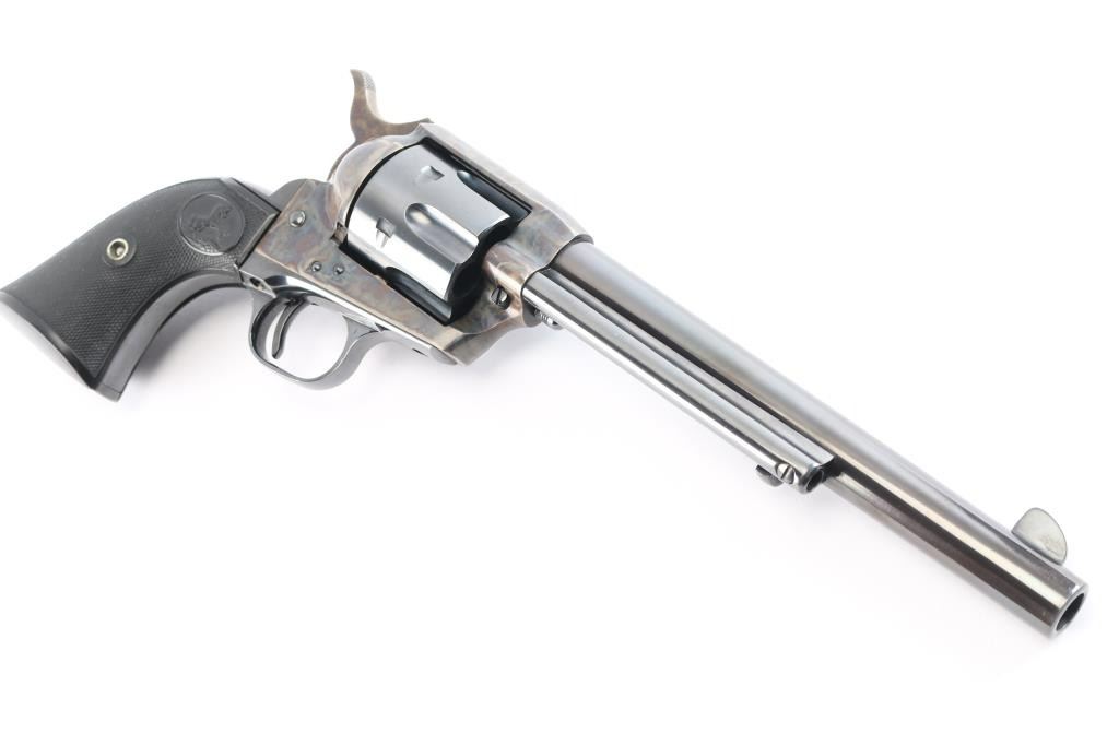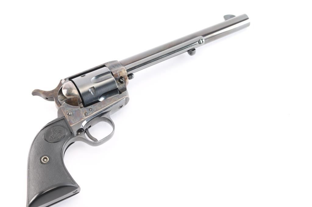 Vintage Colt Single-Action Army chambered in .45 Colt. This is a late 1st Generation revolver manufactured in 1932 in Hartford, CT. It features a 7.5" barrel with a blade front sight, notch sight in the rear, smooth curved thin trigger, checkered hammer spur, factory black checkered grips with 'Rampant Colt' motifs, and a six round fluted cylinder. Most of the firearm has a blued finish with a case-color hardened frame, loading gate, and hammer. There is a one-line Colt address on top of the barrel. "Colt Single Action Army .45" is stamped on left side of barrel, and a two-line stamping displays the patent dates and "Rampant Colt" on left of the frame. The left triggerguard has triangle proof, and a "J". The right triggerguard has what looks to be an "F". The action is crisp/tight, the bore is excellent and bright, and the grips are excellent. This pistol has been factory quality refinished. The blued refinish is about 98% with minor edge wear and blemishes. The color-case parts of this revolver are also excellent. This revolver comes with a period factory box, and an extra set of hard rubber grips.