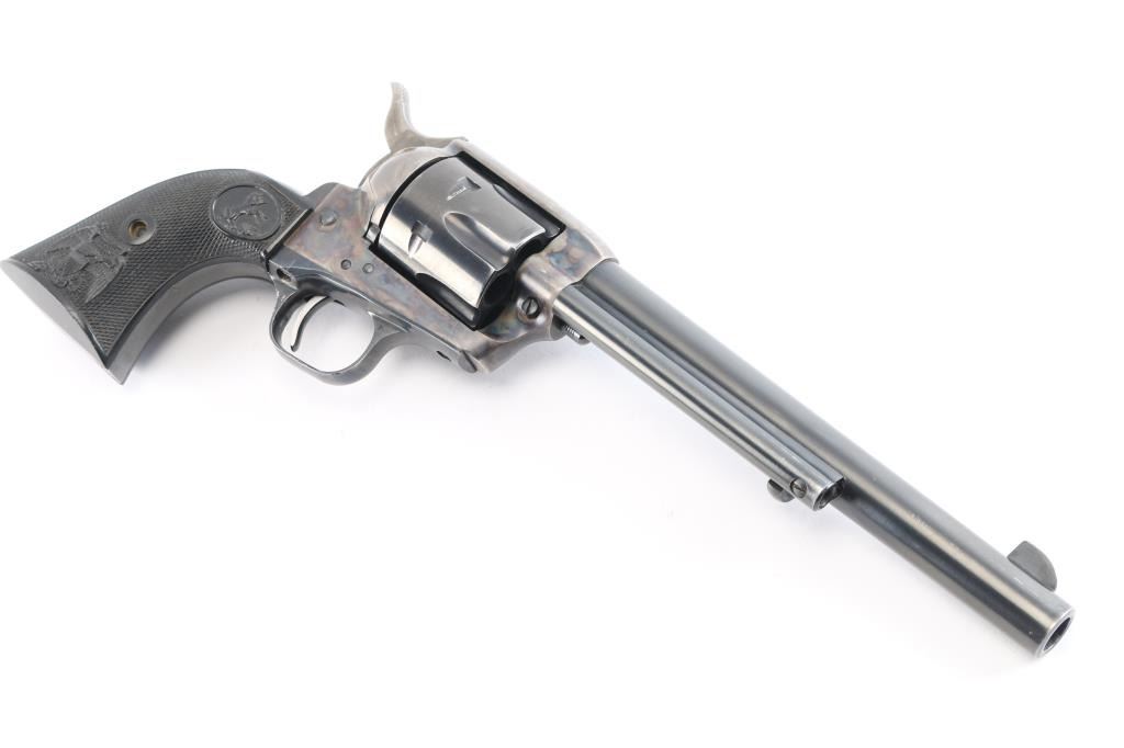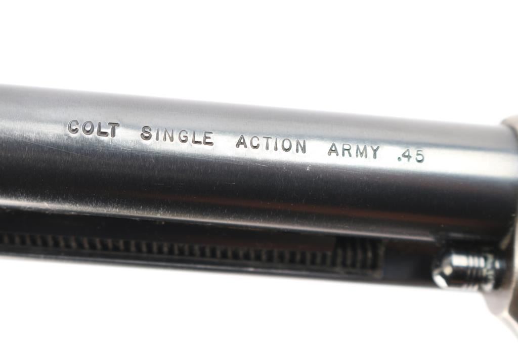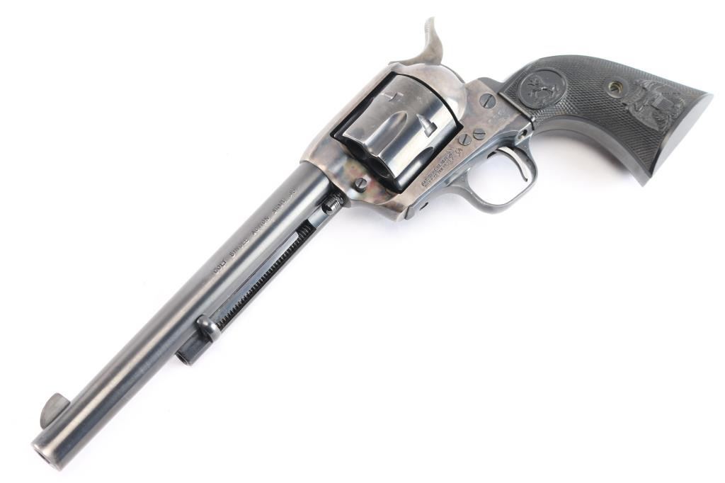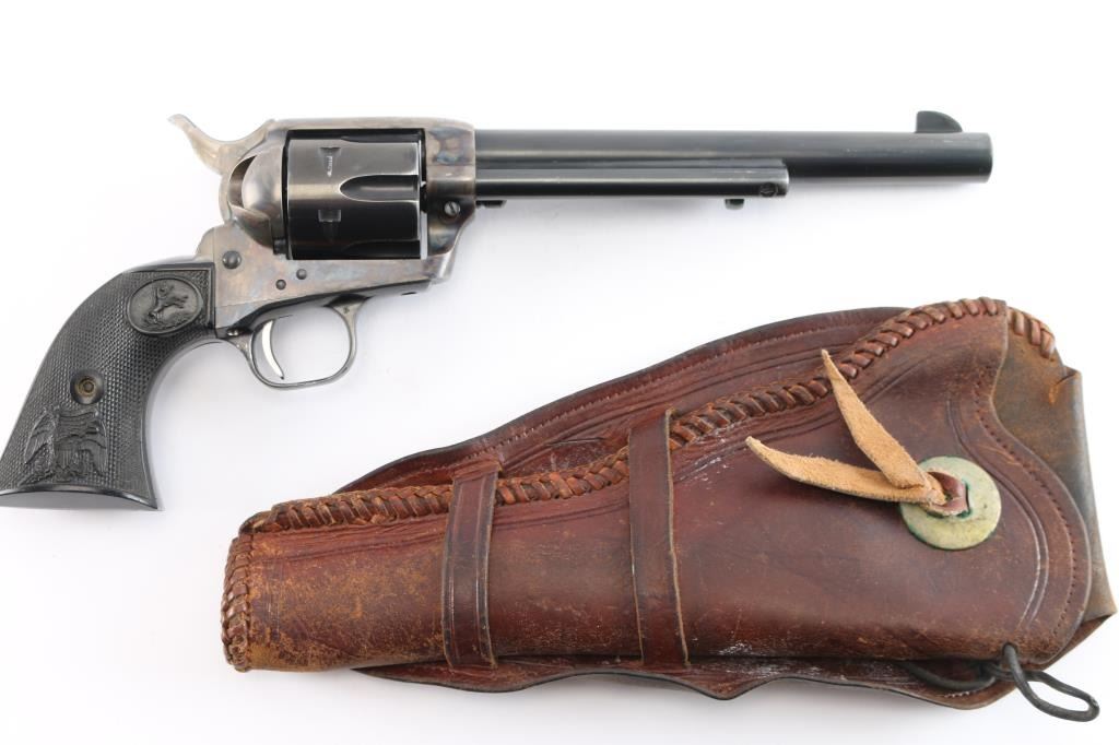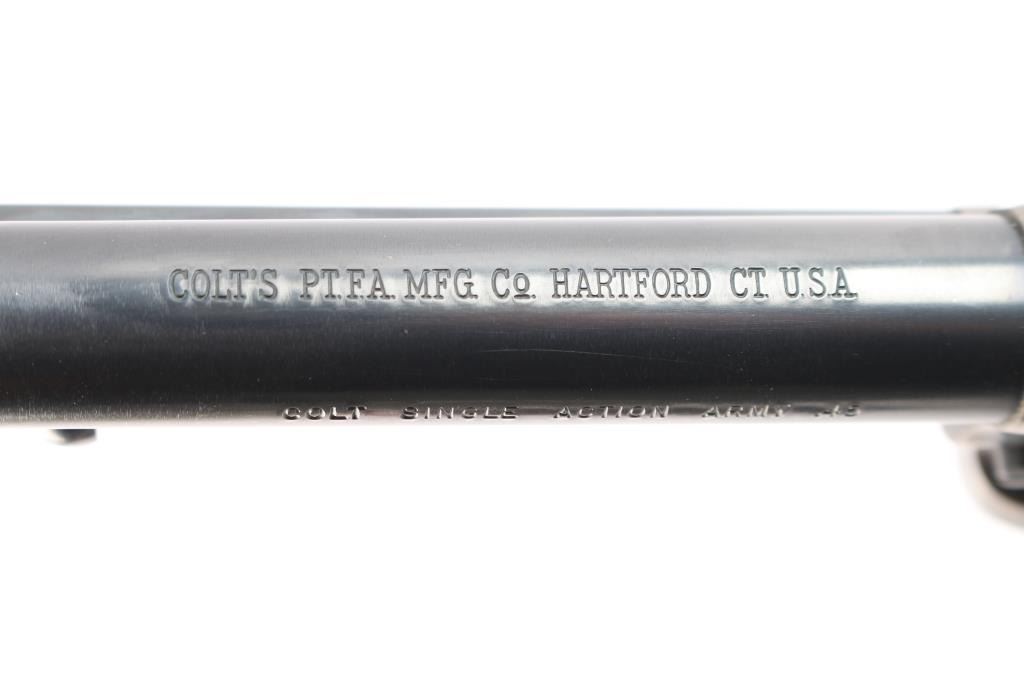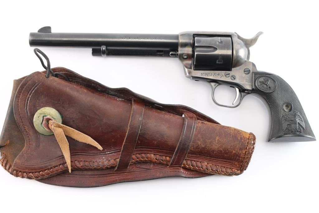 American made, Colt 2nd Generation Single-Action Army revolver chambered in .45 Long Colt, manufactured circa 1973 in Hartford, CT. Revolver features a color-case hardened frame, a blued 7-1/2" barrel, two-toned hammer with polished sides, fixed blade front sight, notched frame rear sight, two-toned thin smooth curved trigger, fluted six-round cylinder, collard cylinder pin head, birds head style ejector rod button, smooth grip straps, firing pin on hammer nose, checkered hammer spur, and checkered black hard rubber grips with 'American Eagle' and 'Rampant Colt' motifs. The frame is color-case hardened, the trigger and hammer are two-toned blued with polished sides, and the remaining components and have a blued finish. The original blued finish retained is approximately 90% with edge wear, and scattered scratches (bottom of barrel). The color-case finish is near excellent with superficial scratches. Metal displays no rust or deformation. The action is smooth and crisp with a tight lock-up. Grips are excellent, but dirty. Bore is bright with strong rifling, and the cylinder chambers are also excellent, but dirty. Pistol includes a leather holster.