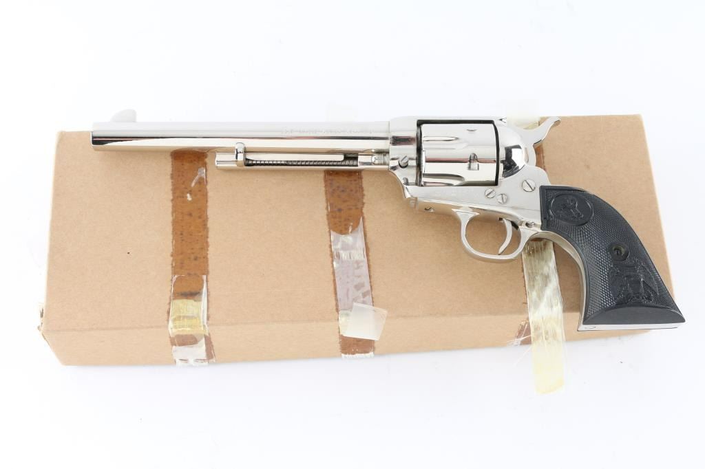 'Second Generation' revolver manufactured circa 1970. Features nickel finish, 7 1/2" barrel and checkered black plastic "eagle" grips. Finish is excellent with no visible blemishes. Action not turned for inspection. Includes simple brown two piece cardboard box. Condition is NRA Excellent - like new *** C&R Firearm ***