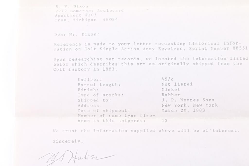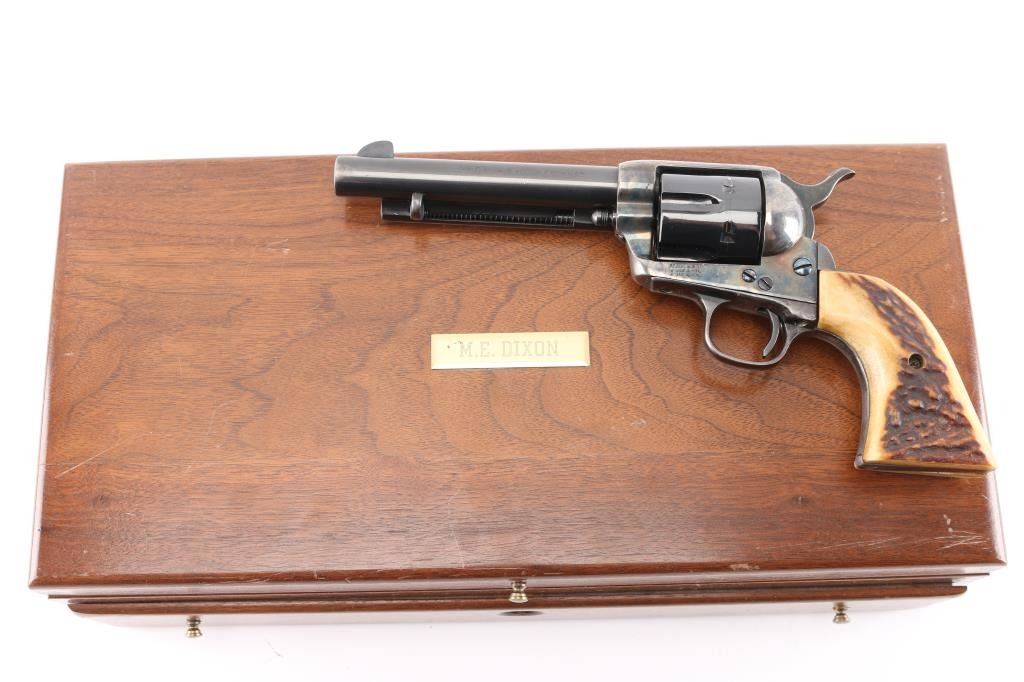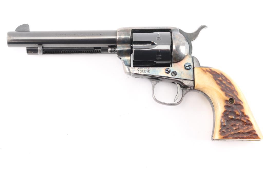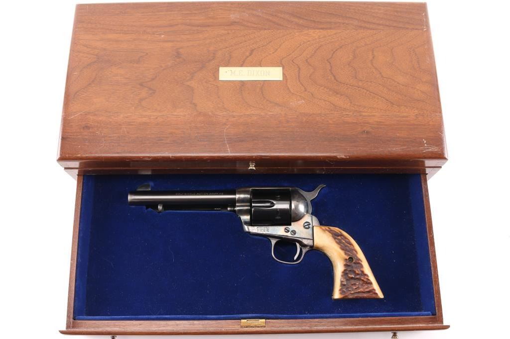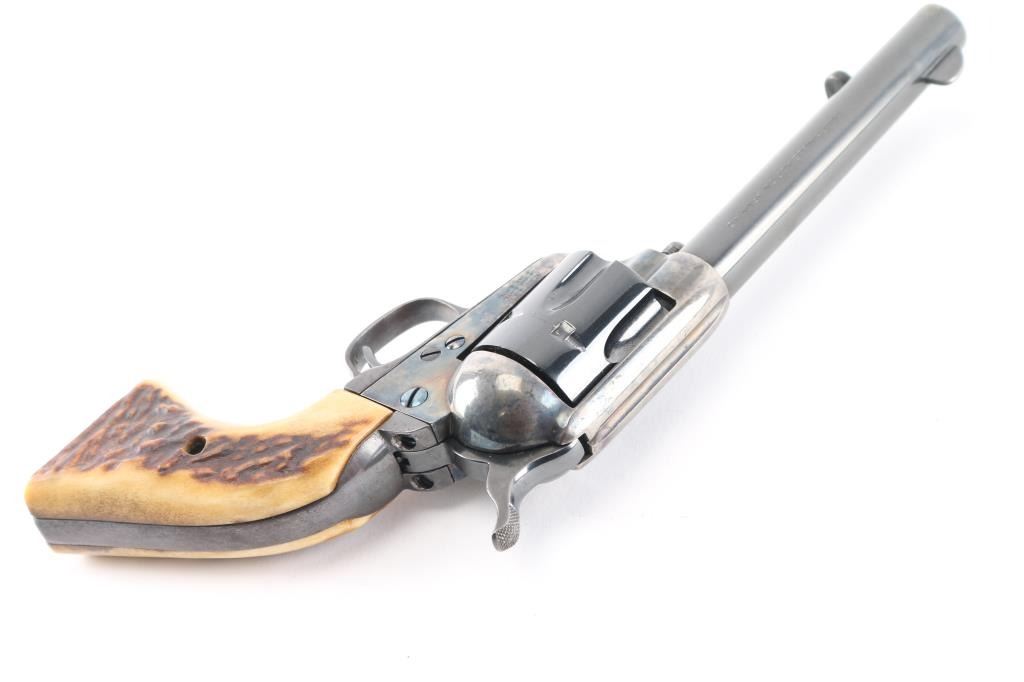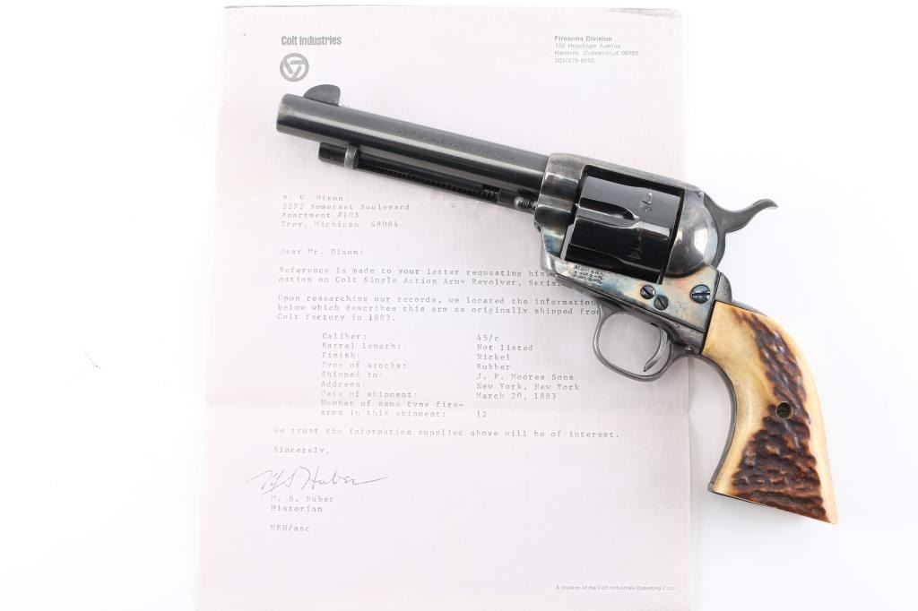 Restored/Rebarreled. Antique1st Generation SAA manufactured 1883. Has a early 1950's Colt factory replacement 5 1/2" barrel with front blade and v-notch rear sights. Right side of barrel stamped "COLT'S MFG. CO HARTFORD CT. U.S.A." in one line block letters. The left barrel is stamped "Colt Single Army .45". Three-line black powder patent dates are on the left frame, along with "45 Cal. on the left triggerguard. The serial number matches on the frame, triggerguard, and backstrap, assembly number '238' on the loading gate, "A.R." is stamped on the heel below the serial number. Frame markings, & serial numbers are crisp/clear. The stag grips are later replacements. Bore is very good/bright with strong rifling. Action is crisp, and hammer locks up tight. The replaced grips are excellent. Reblued finish is overall very good, with minor muzzle wear, tracking, edge wear on the cylinder, holster wear on the ejector rod housing and handling wear with some finish loss on the straps. Case colored frame is very good, minor scratches. Comes in a very nice glass top wood display case with lid, form fitted blue felt, brass plaque on lid with "M.E. Dixon". There is also a Colt 1974 dated factory letter to B.V. Dixon stating the revolver was one of twelve shipped to J.P. Moore NYC on March 20th, 1883. The consigner states the restoration was done by Colt.