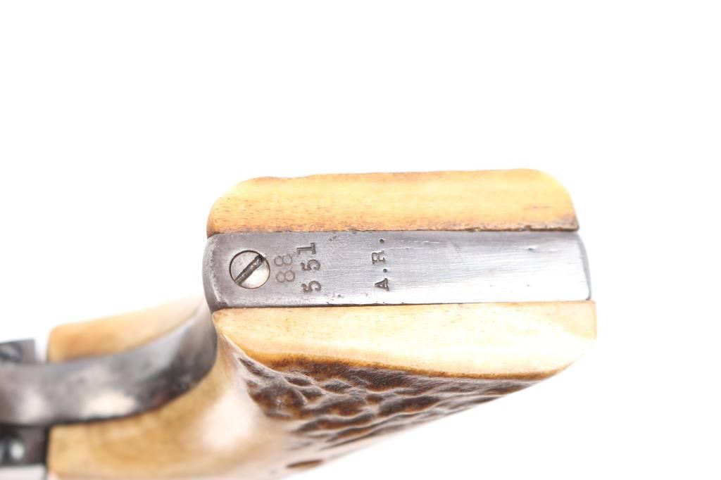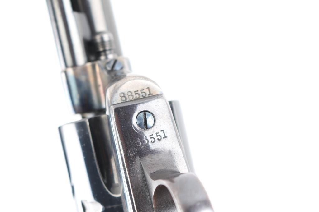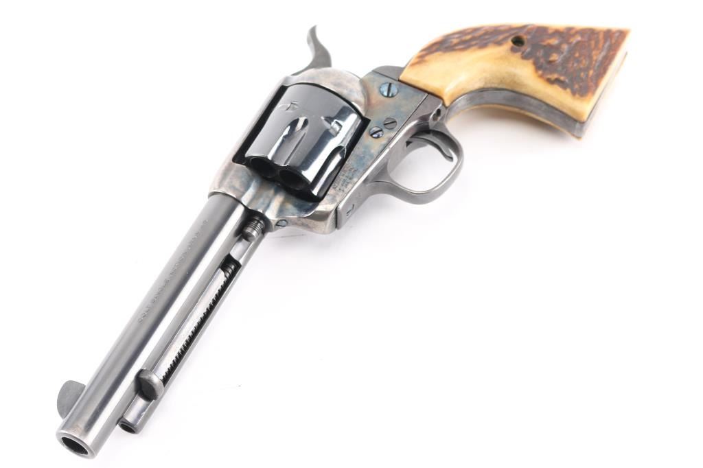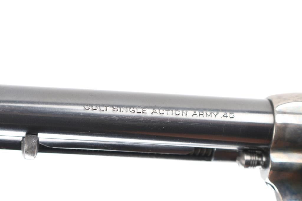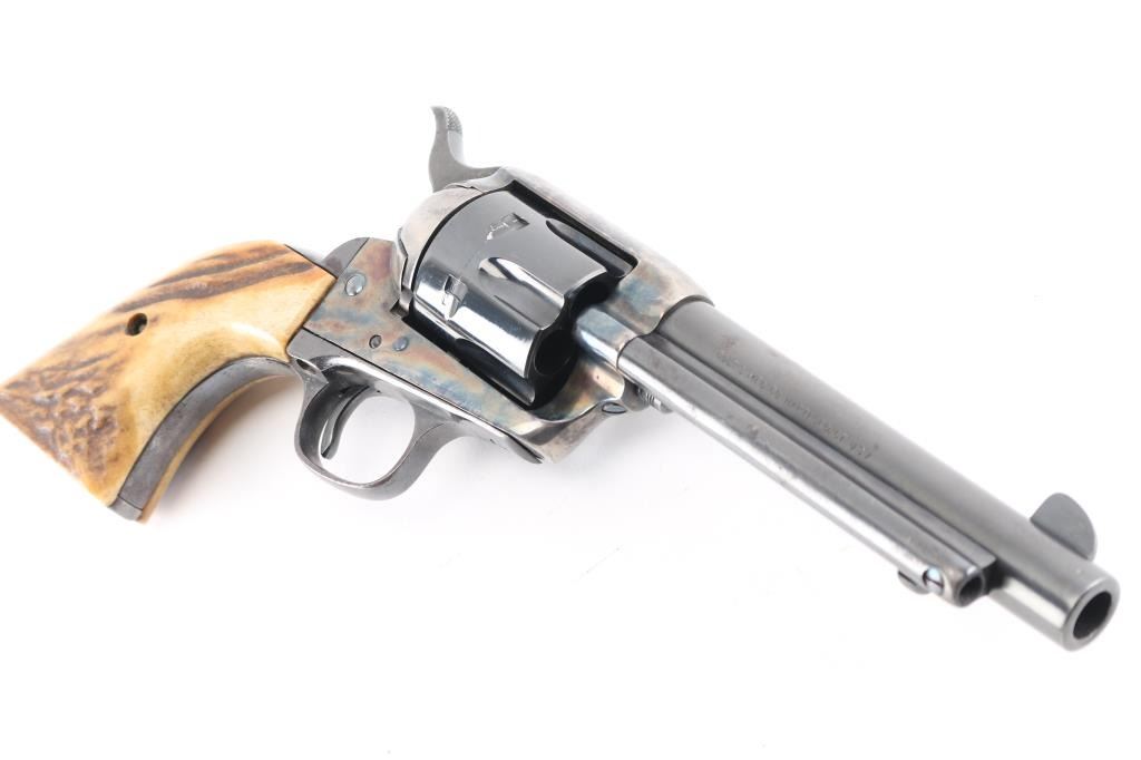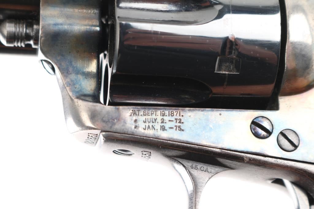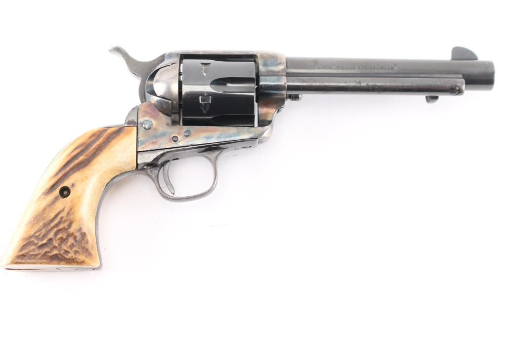 Restored/Rebarreled. Antique1st Generation SAA manufactured 1883. Has a early 1950's Colt factory replacement 5 1/2" barrel with front blade and v-notch rear sights. Right side of barrel stamped "COLT'S MFG. CO HARTFORD CT. U.S.A." in one line block letters. The left barrel is stamped "Colt Single Army .45". Three-line black powder patent dates are on the left frame, along with "45 Cal. on the left triggerguard. The serial number matches on the frame, triggerguard, and backstrap, assembly number '238' on the loading gate, "A.R." is stamped on the heel below the serial number. Frame markings, & serial numbers are crisp/clear. The stag grips are later replacements. Bore is very good/bright with strong rifling. Action is crisp, and hammer locks up tight. The replaced grips are excellent. Reblued finish is overall very good, with minor muzzle wear, tracking, edge wear on the cylinder, holster wear on the ejector rod housing and handling wear with some finish loss on the straps. Case colored frame is very good, minor scratches. Comes in a very nice glass top wood display case with lid, form fitted blue felt, brass plaque on lid with "M.E. Dixon". There is also a Colt 1974 dated factory letter to B.V. Dixon stating the revolver was one of twelve shipped to J.P. Moore NYC on March 20th, 1883. The consigner states the restoration was done by Colt.