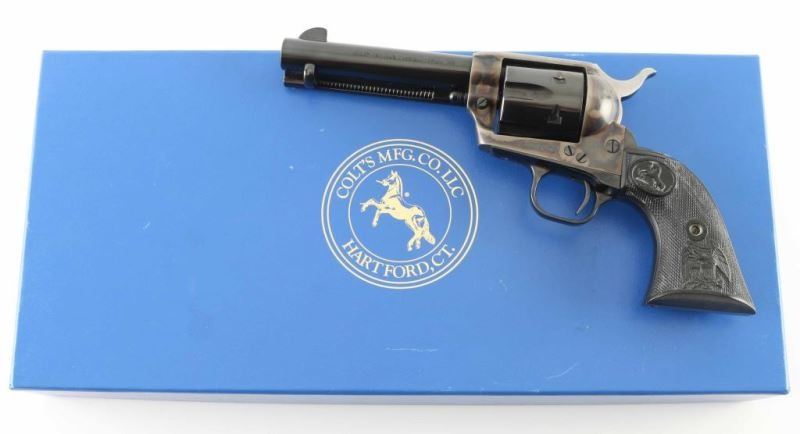 Revolver. Single-Action. 6 rd capacity. 3rd Generation. Manufactured 2004. 4.75" barrel with front blade, and top strap notched rear sight. Blued metal finish, with case-hardened frame. One line Colt Address on top of barrel. Side stamped "Colt Single Action Army .45" 2 line patent dates, with Rampant Colt on left frame. Checkered black hard rubber grips with Rampant Colts, and American Eagles. Cylinder indexes properly, and hammer locks up tight. Metal finish is near excellent. There is some minor edge wear/tracking lines on the cylinder. Cylinders are excellent. Bore is excellent/bright. Grips have a whitish substance in the checkering. Should clean off. There is a very small scratch by the ".45" on the barrel . Comes in the original Colt blue cardboard box with gold lettering. With manual. NRA Condition- Near Excellent. Modern Firearm.