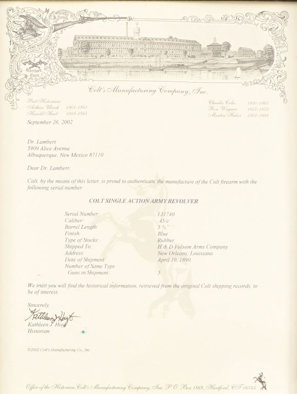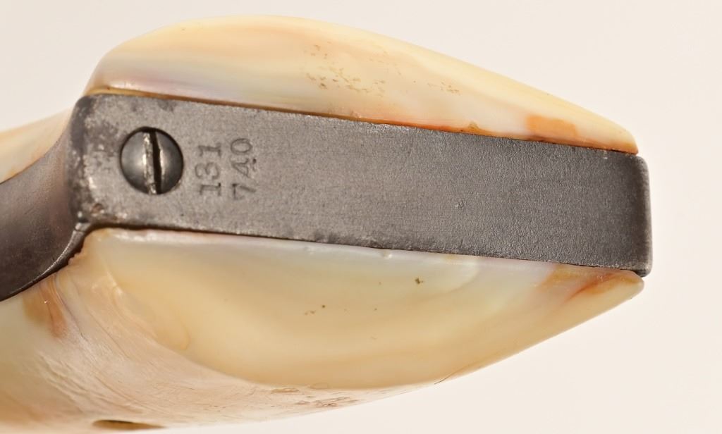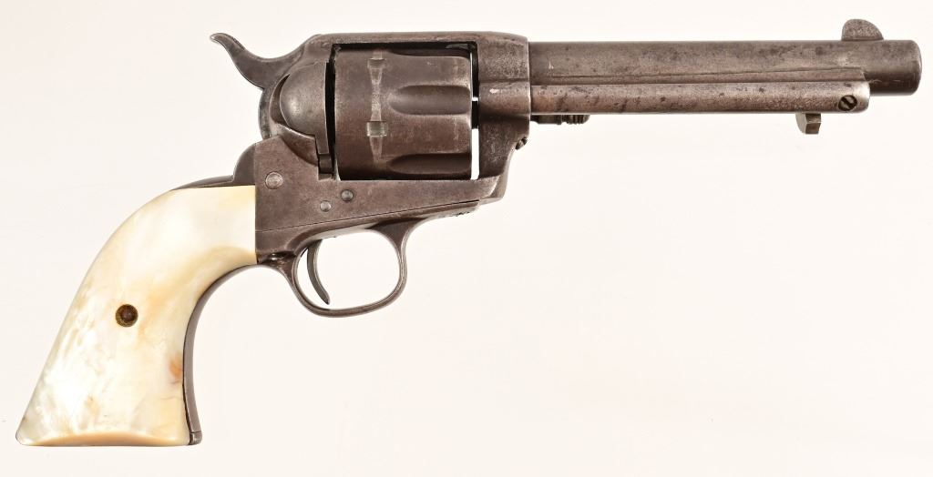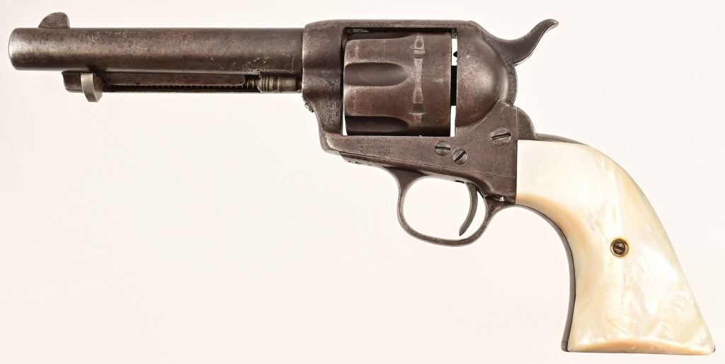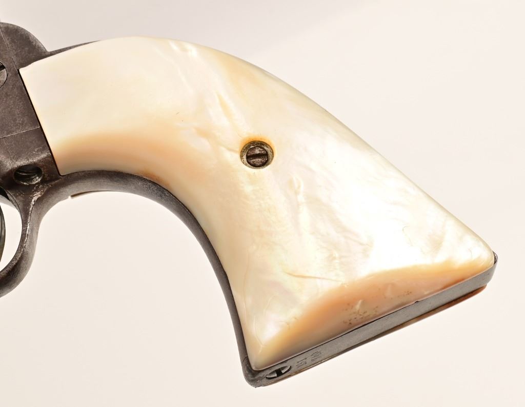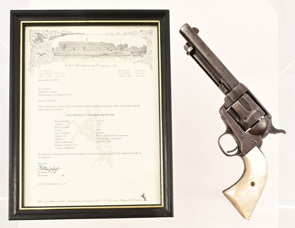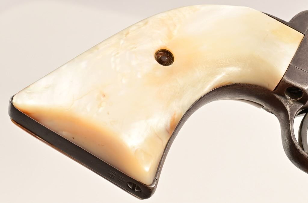 5.5" barrel, blue finish, with mother-of-pearl grips. S/N 131740, Factory letter shows shipment to H&D Folsom Arms Company, New Orleans Louisiana, April 10, 1890 with rubber grips. Antique