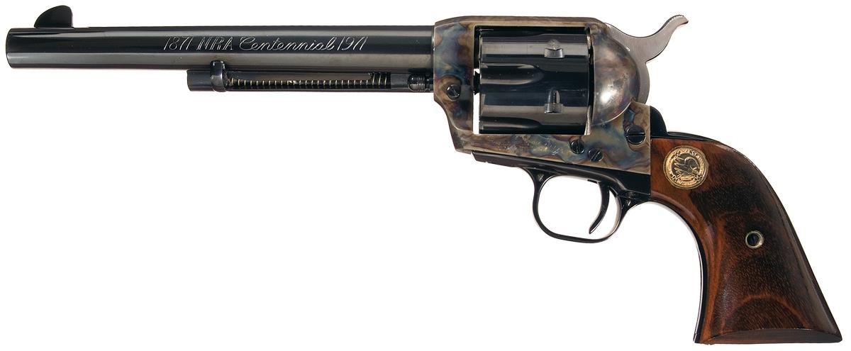 The top of the barrel is marked with the one line address, "1871 NRA Centennial 1971" on the left and "COLT SINGLE ACTION ARMY .45" on the right side. Two line, three patent dates on the left side of the smokeless powder frame followed by the Rampant Colt. The butt is inscribed "A. Howard Williams". Standard blade front and frame notch rear sights and fitted with smooth, nicely figured walnut grips with gold NRA medallions.
