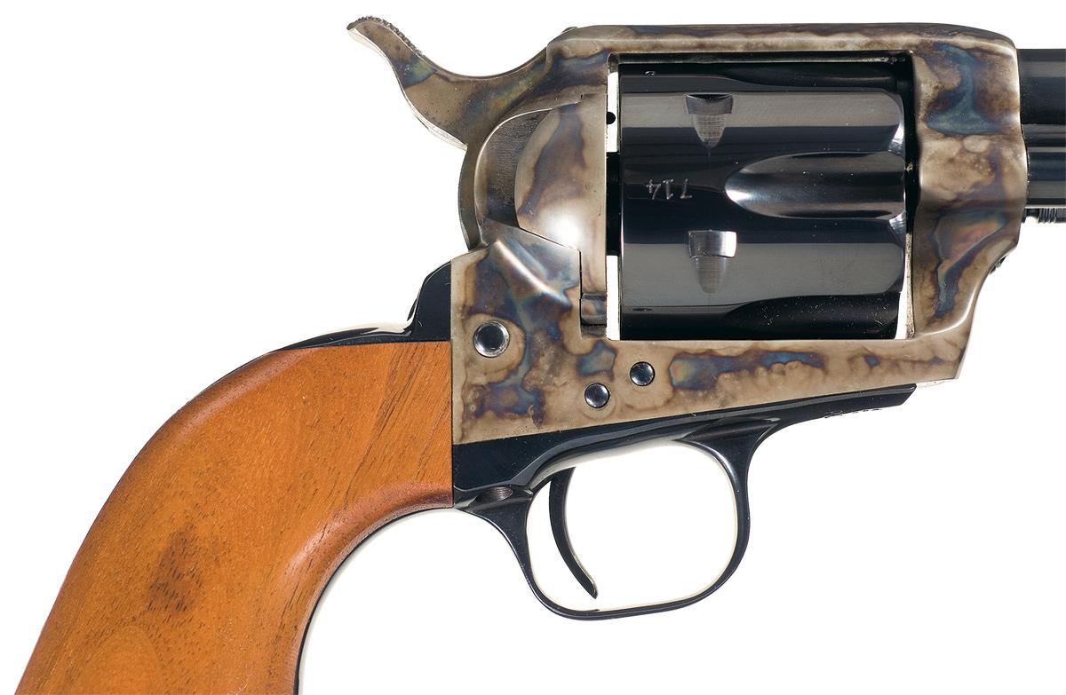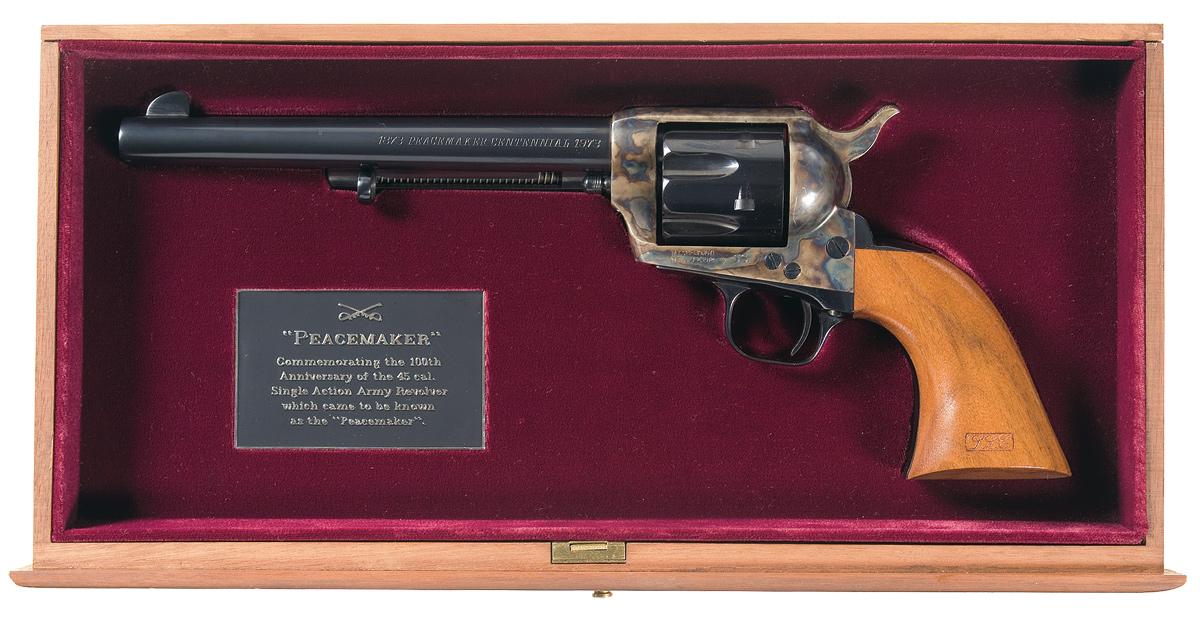 Standard Colt Centennial markings and features including a boxed "LLC" cartouche on the left grip. Complete with the glass top Centennial Commemorative presentation case and plaque. There is a Frontier Six Shooter Peacemaker Centennial serial numbered 714PC in this auction.