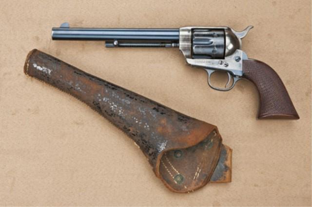 Colt Single Action Army Revolver, .45 caliber, 7-1/2” barrel, US Cavalry series, blue and case hardened finish, cartouche wood grips, soldier checkered during period of use. Serial #137708. The revolver is confirmed by factory letter which mentions caliber and sold to US government inspector at Colt plant, January 1891, 200 guns in shipment. The pistol remains in fine to excellent original condition. The barrel shows 95% blue finish with just some slight loss at the muzzle, good sharp barrel address, and RAC and P proofs on bottom of barrel. The barrel is numbered “7708” beneath the ejector rod housing and shows a “K” inspection by the early type boss. The ejector rod housing is early blackpowder type fitted to this barrel. The frame shows 85-95% original case hardening with just some drifting to silver still very bright rainbow hues, just slight age. The cylinder is an early blackpowder type and is numbered “7708” with “P” proof and RAC stamp. The cylinder shows 60% original blue with some scratches and an index line. The backstrap and triggerguard are serial numbered to match and show approx. 80-90% thinning original blue. The grips have been bunkhouse checkered, probably by the