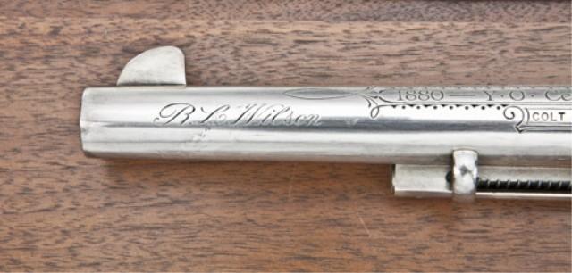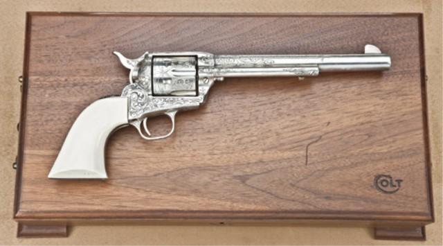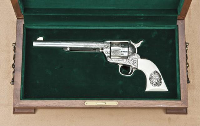 Colt Single Action Army Revolver, .45 caliber 7-1/2” barrel, finely custom engraved in western scrolls, silver plated, showing 1880 YO Centennial 1980, a century of ranching in Texas roll died on barrel. R. L. Wilson on script, hand engraved on left side of barrel. Screwless ivory grips with silver inlay showing YO ranch bran, long horn cattle, and Texas around a Lone Star. Also Lone Star marking on triggerguard and other YO Markings. The triggerguard shows “OF” stamped in a circle, which is probably engraver’s signature. The front of the frame is stamped with a small “YO” brand and number “49”. The pistol shows 98-99% plus silver finish applied at time of engraving. The pistol is serial #7A13689, and is contained within a Colt custom workshop deluxe carrying case with brass handles on each side. The YO ranch was one of the most famous in Texas and Charlie Shriner in 1980 was one of the most recognized firearms collectors. Charlie consulted with R.L. Wilson on a small issue of YO ranch firearms and this is the only one this cataloger has viewed with Wilson’s name on left of barrel and may have been his prototype or “booty” from the deal. Of the Robert Petersen Collection. Est: