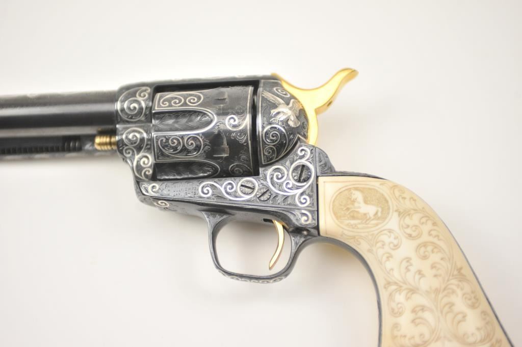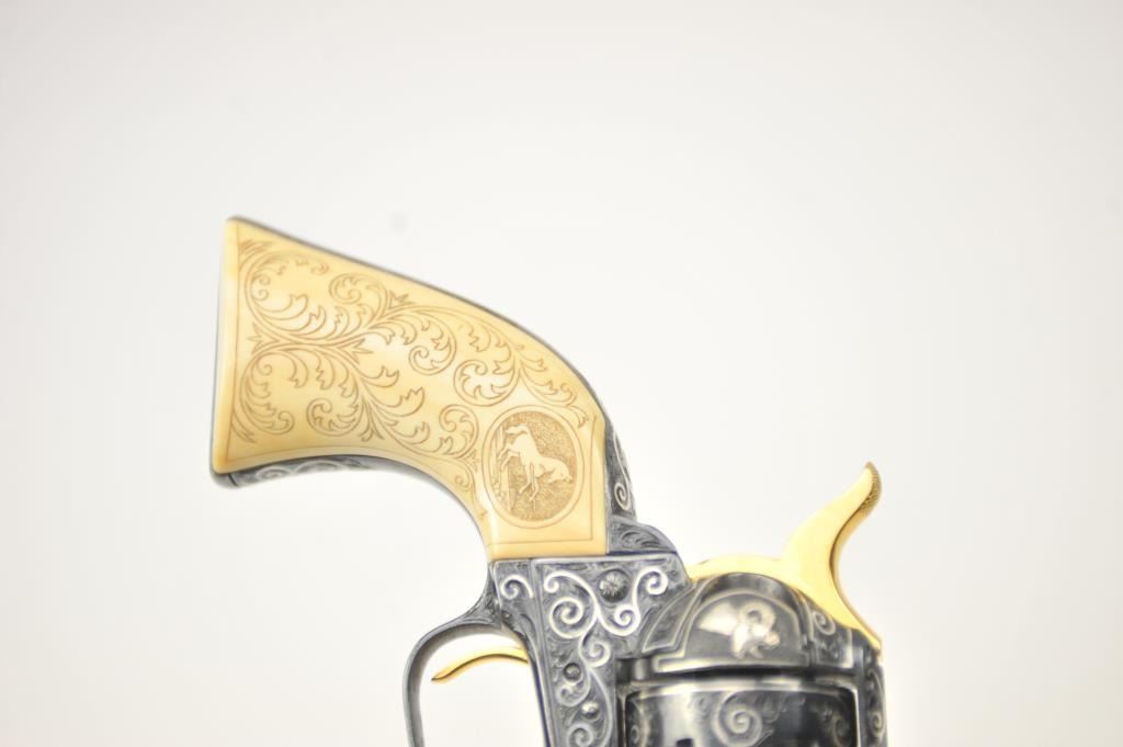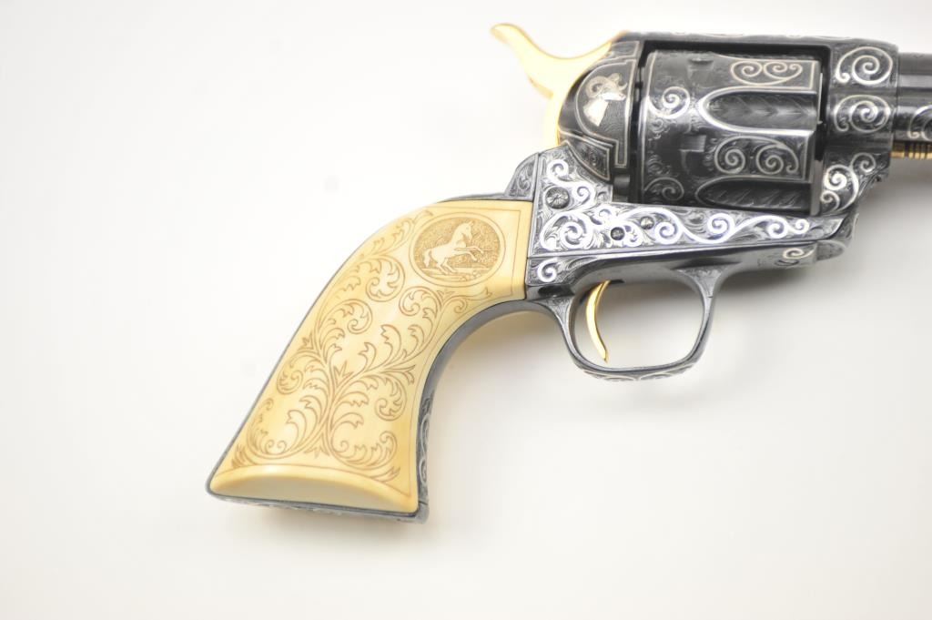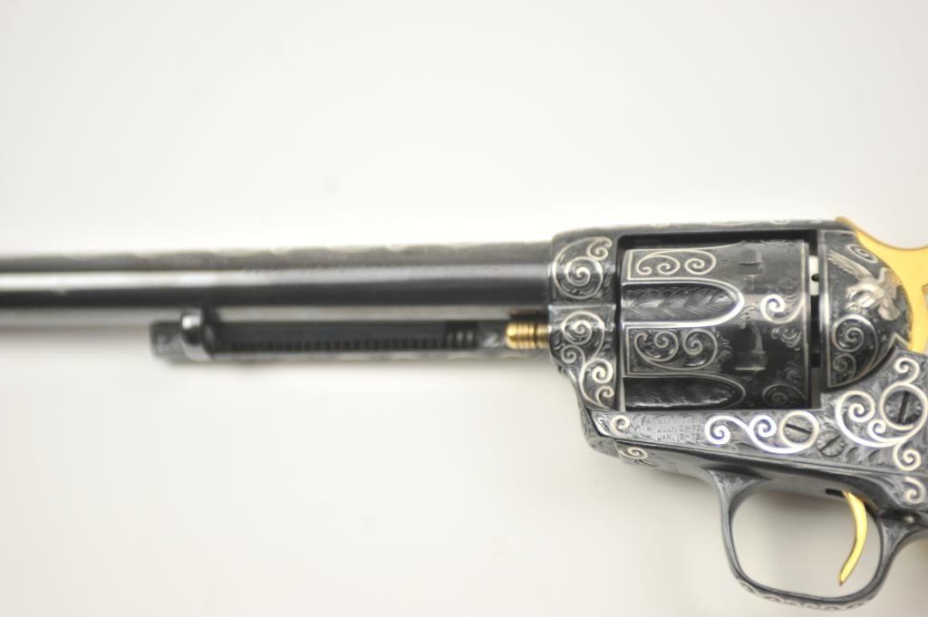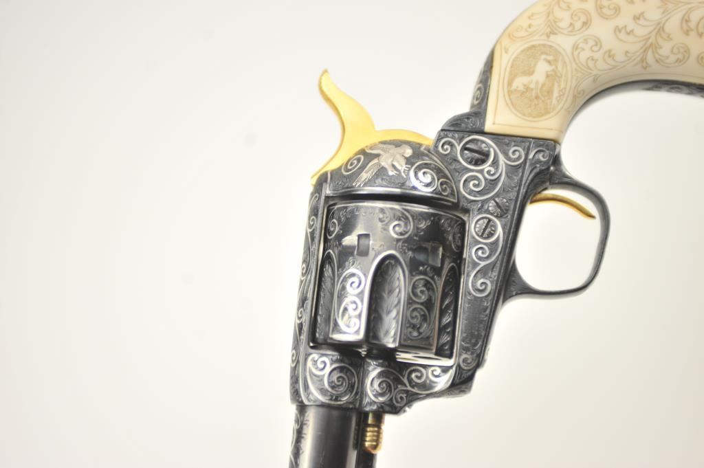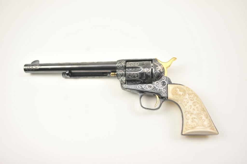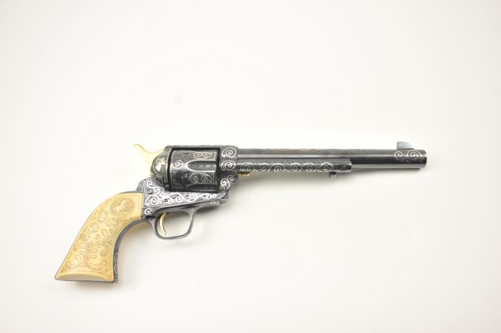 Colt Single Action Army Revolver Exhibition engraved and silver inlaid with incised carved ivory grips in .38 special caliber with 7 ½” barrel, blue finish with gold trim, S/N 121944. Post WWII re-barrel andcylinder. This elaborate Colt shows nicely cut scrolls with flush silver inlay and eagle on the left recoil shield along with ramshead on loading gate. We have seen a couple of similar engraved art works thatwere brokered by Hy Hunter who provided fancy arms to the western movie stars of 1950s and 60s. This colt shows black powder patent dates and matching frame, back strap and trigger guard. Fine as restored with 99% blue finish showing all the gold on front of hammer and trigger and no evidence of firing. The action is tight and the bore is excellent. We would estimate over $10,000 to replicate using early single action and costof extensive engraving, inlay and grips. Includes vintage wood and glass display case. A vintage showpiece in any collection. (Antique) Est.: $5,000-$10,000