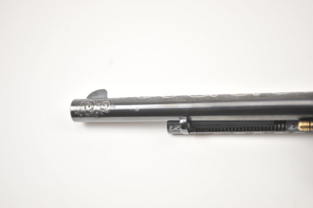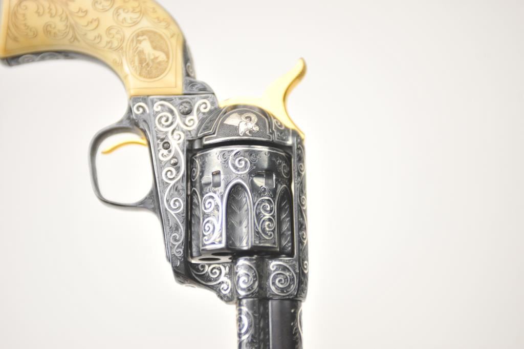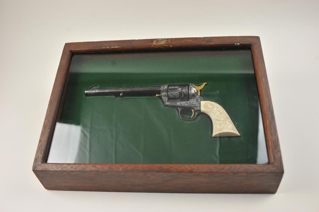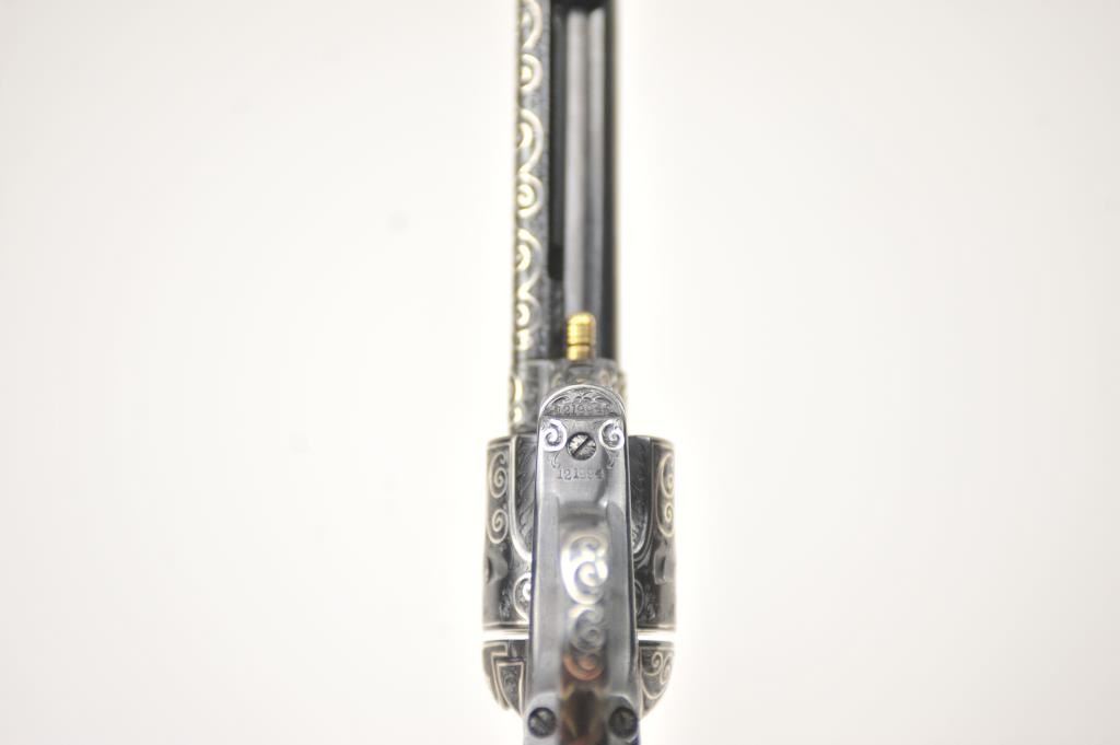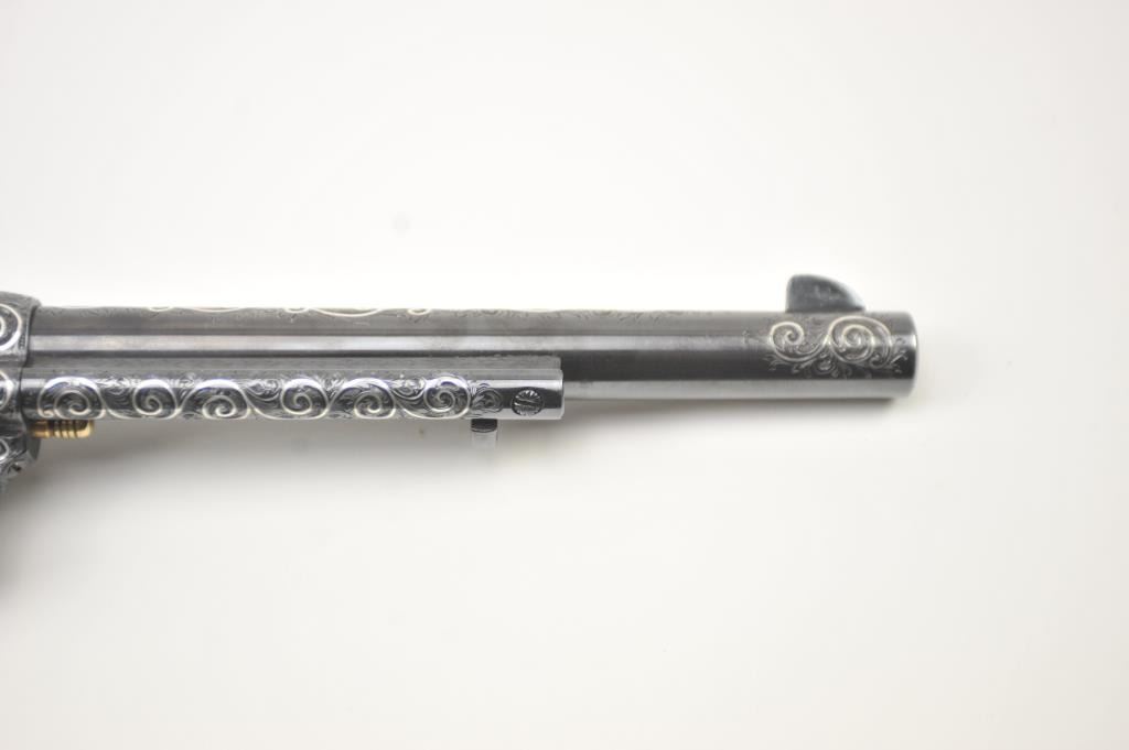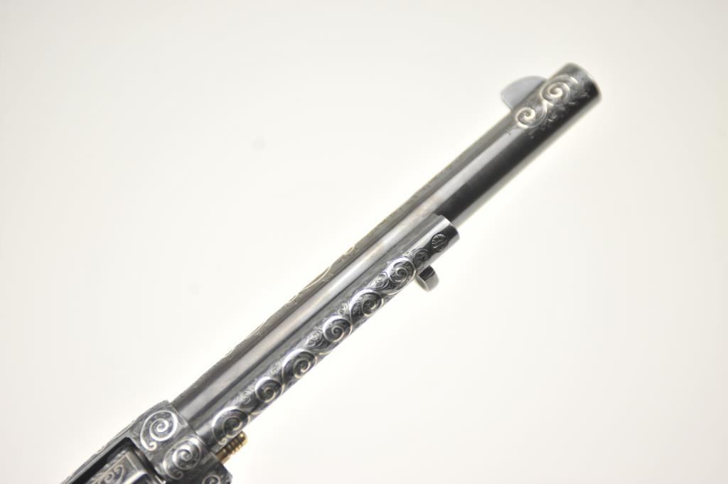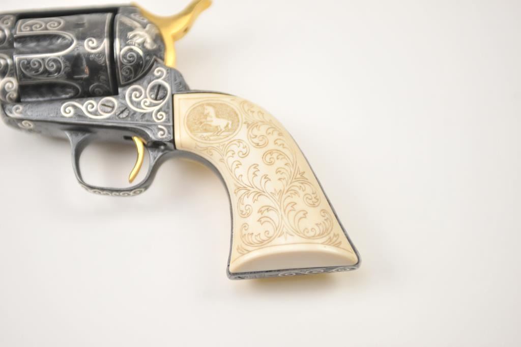 Colt Single Action Army Revolver Exhibition engraved and silver inlaid with incised carved ivory grips in .38 special caliber with 7 ½” barrel, blue finish with gold trim, S/N 121944. Post WWII re-barrel andcylinder. This elaborate Colt shows nicely cut scrolls with flush silver inlay and eagle on the left recoil shield along with ramshead on loading gate. We have seen a couple of similar engraved art works thatwere brokered by Hy Hunter who provided fancy arms to the western movie stars of 1950s and 60s. This colt shows black powder patent dates and matching frame, back strap and trigger guard. Fine as restored with 99% blue finish showing all the gold on front of hammer and trigger and no evidence of firing. The action is tight and the bore is excellent. We would estimate over $10,000 to replicate using early single action and costof extensive engraving, inlay and grips. Includes vintage wood and glass display case. A vintage showpiece in any collection. (Antique) Est.: $5,000-$10,000