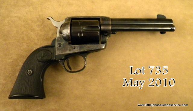 Colt Single Action Army Revolver customized and rechambered to .44 special by addition of post war cylinder, with 4 3/4" original frontier six-shooter marked barrel. Reblued finish, post war hammer, late grips, serial #224481, with heart stamp on butt (gunsmith). Good bore, excellent action, crisp overall with 90-95% restored blue and case hardened finish. Est. $700-1,400