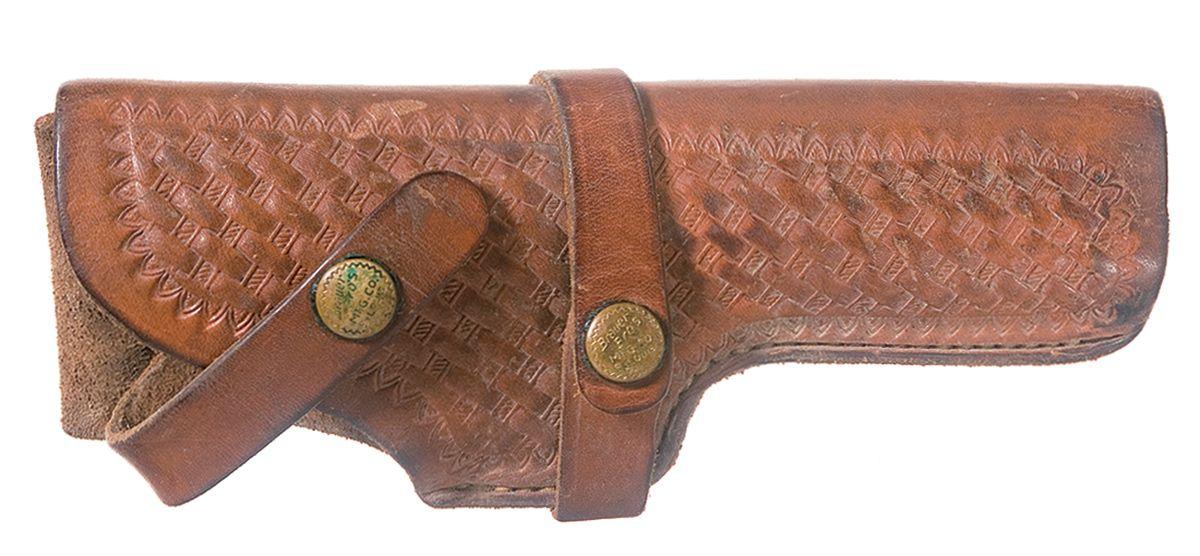 Manufactured in 1909 with standard markings and features with modified trigger guard and backstrap toe screw absent. Complete with Brauer Bros. brown leather basket weave holster.