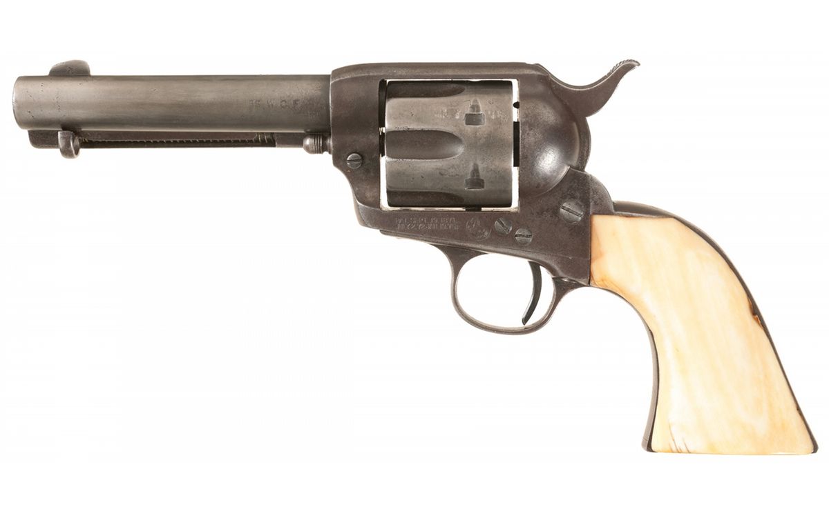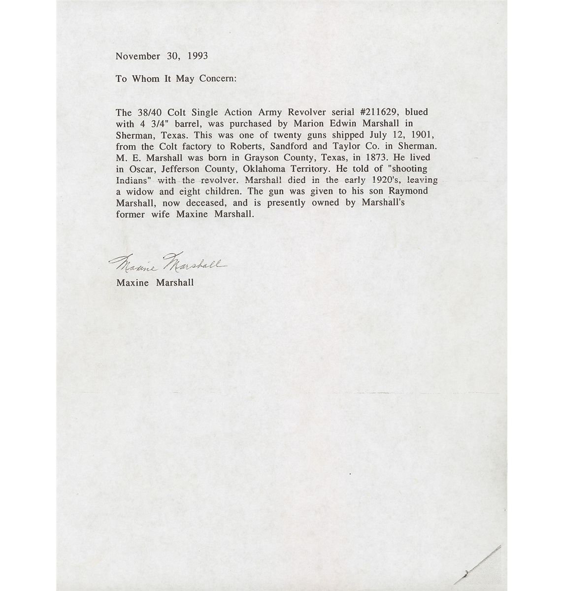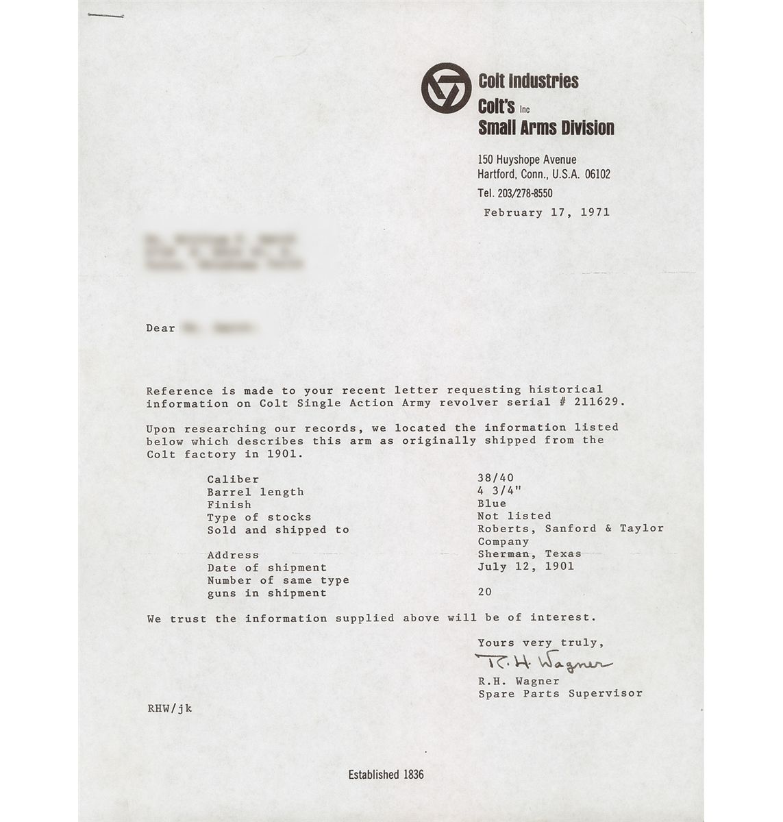 Manufactured in 1901. Factory letter verifies caliber, barrel length blue finish with grips as "Not Listed" and that it was shipped as 1 of 20 to Roberts, Sanford & Taylor Co. in Sherman, Texas on July 12, 1901.