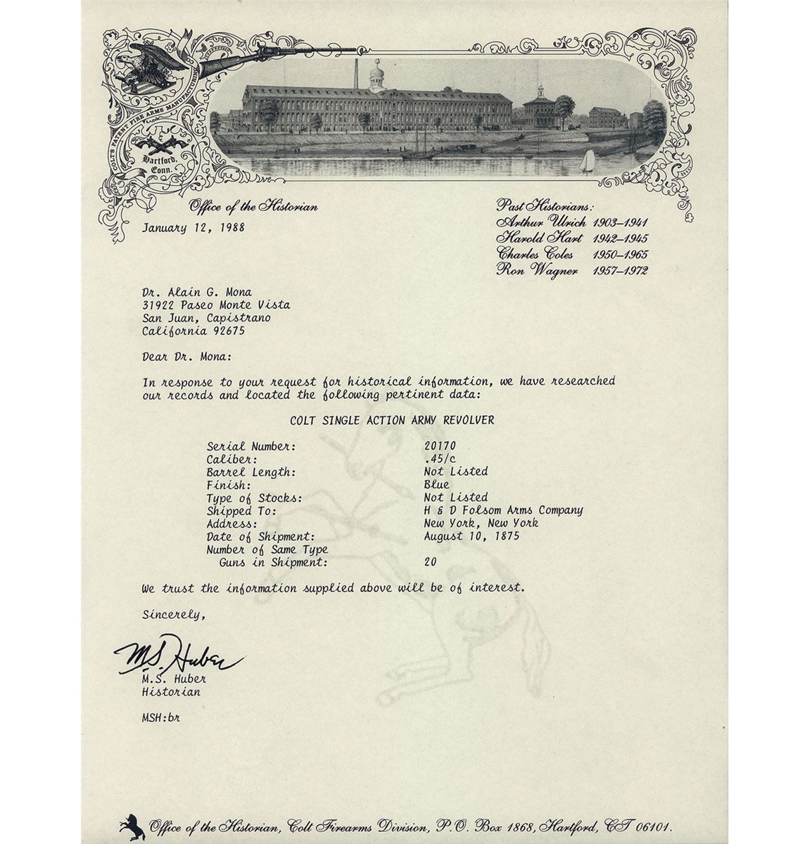 Manufactured in 1875. Factory letter confirms configuration with barrel length and type of stocks as "Not Listed" and that it was shipped to New York on August 10, 1875.