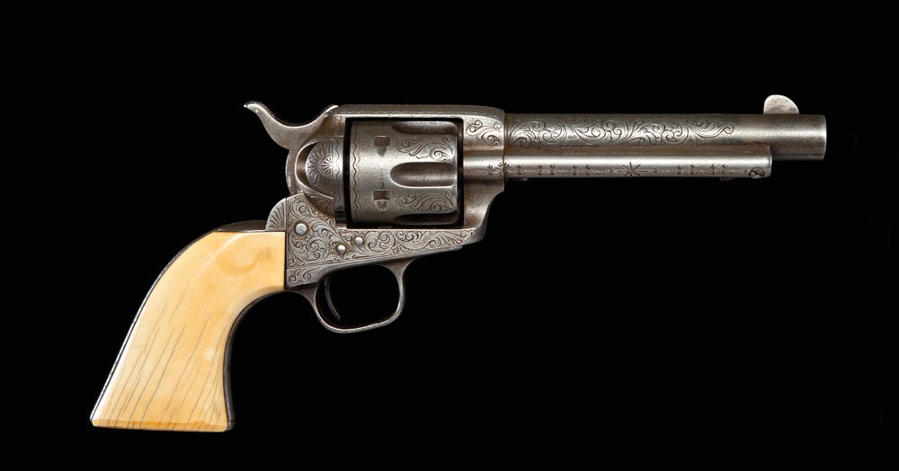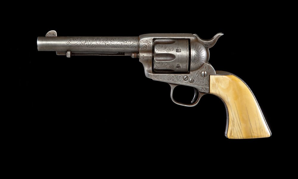 New York style engraved, .45 caliber, 5 1/2” with 1-piece ivory grips. According to factory letter, gun was shipped in nickel to Hartley & Graham in New York, Feb. 5, 1883. All grey with sharp clear markings on barrel and frame, matching numbers show light wear. Grips show normal shrinkage.