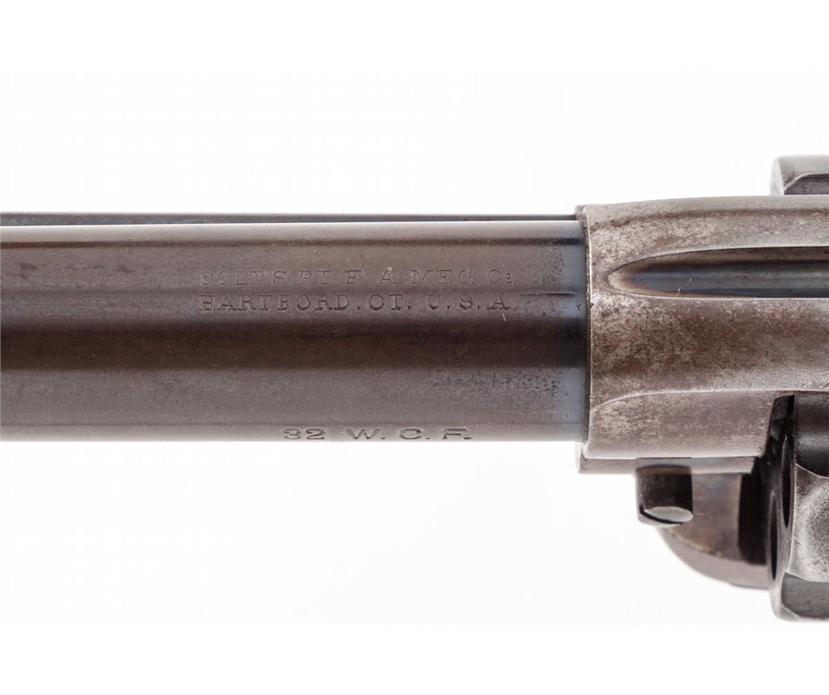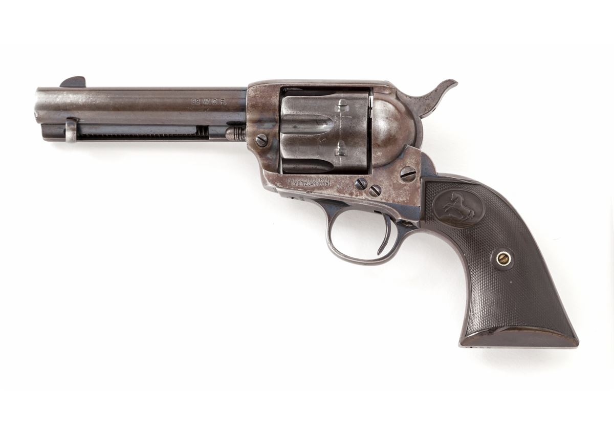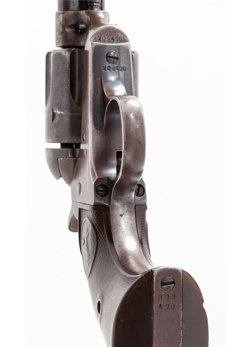 Colt Single Action Army Revolver, #209470, .32-20 cal., 4-3/4'' barrel, blue and case hardened finish, factory checkered hard rubber grips. Mfg'd 1901. Condition is very good to fine. Barrel and cylinder retain approx. 40% toning blue. Frame with 20% case colors; backstrap and front strap have toned a mellow brown color. Grips with moderate to just heavy flattening, with replaced grip screw. Good action, very good bore. Est.: $1,800-$2,400. (C&R/PPT)