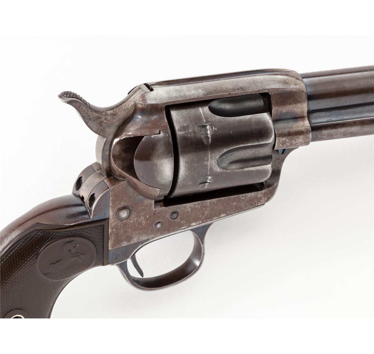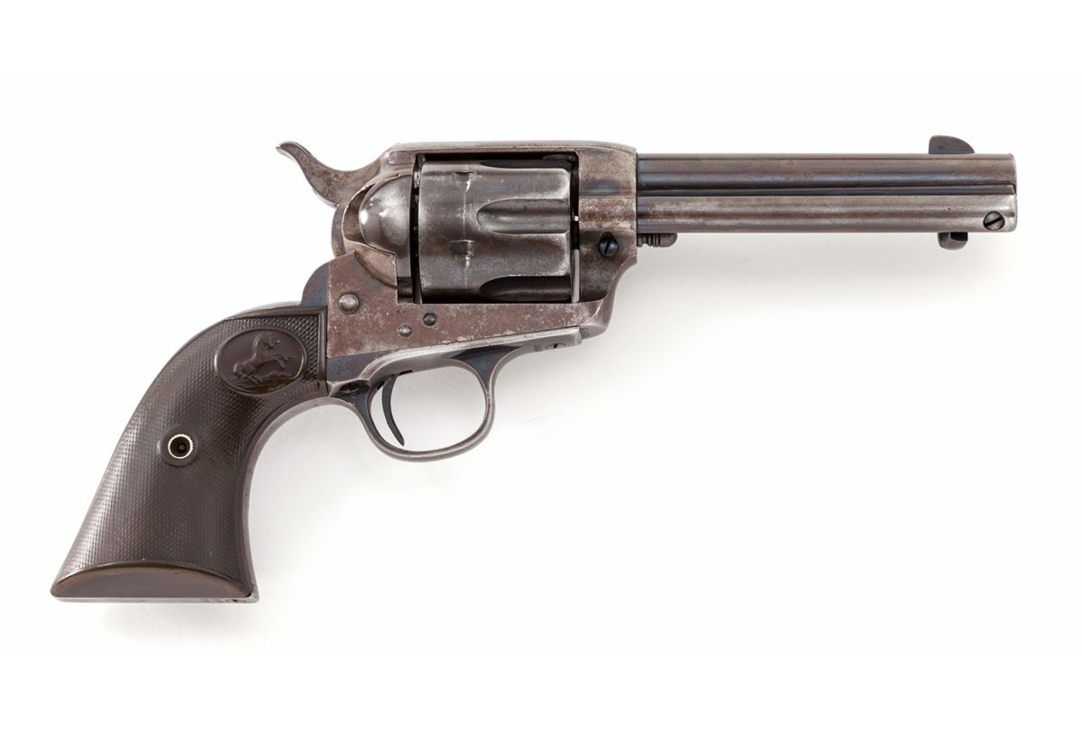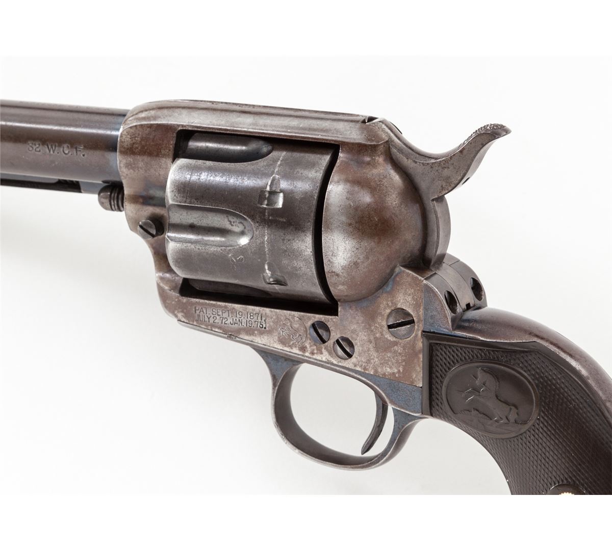 Colt Single Action Army Revolver, #209470, .32-20 cal., 4-3/4'' barrel, blue and case hardened finish, factory checkered hard rubber grips. Mfg'd 1901. Condition is very good to fine. Barrel and cylinder retain approx. 40% toning blue. Frame with 20% case colors; backstrap and front strap have toned a mellow brown color. Grips with moderate to just heavy flattening, with replaced grip screw. Good action, very good bore. Est.: $1,800-$2,400. (C&R/PPT)