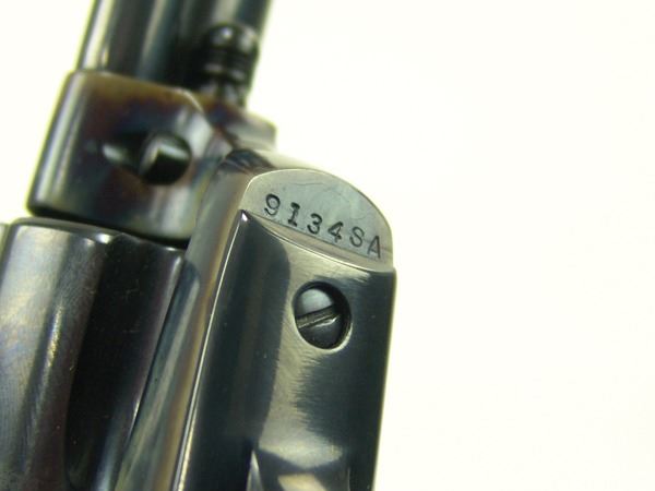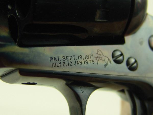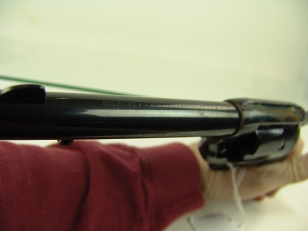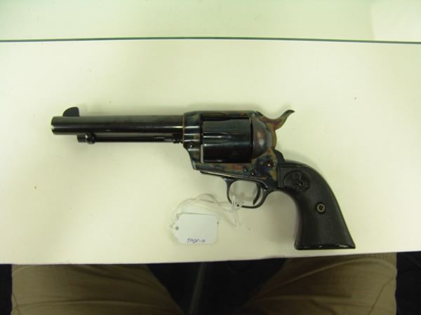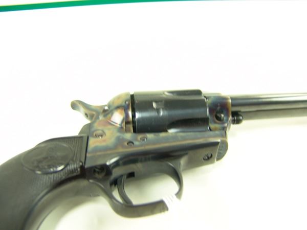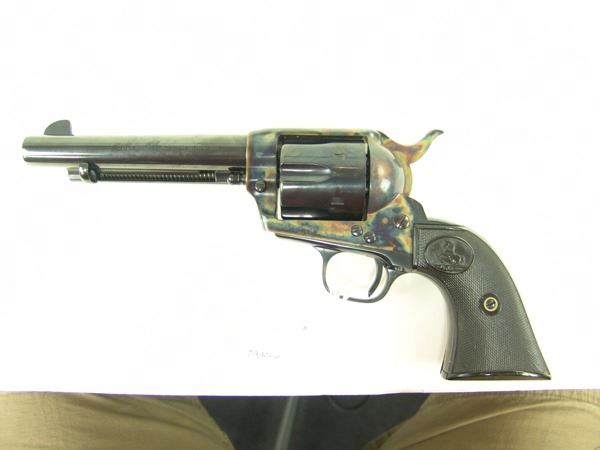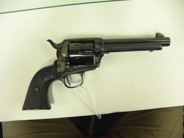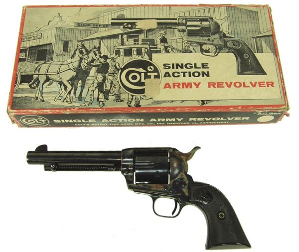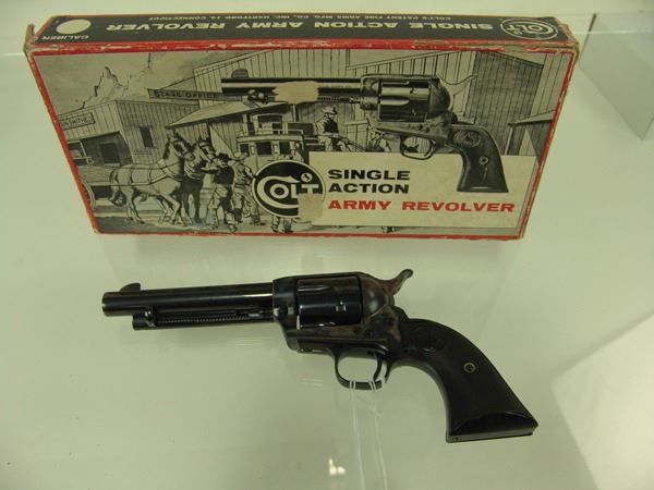 Fine, .45 caliber six-shot, SAA revolver with colorful case hardened frame, blued barrel and cylinder, and checkered rubber grips with Rampant Colt logo. NIB in original box! Very good condition, S/N 91345A *FFLMid/Late 1900s5-1/2" barrel