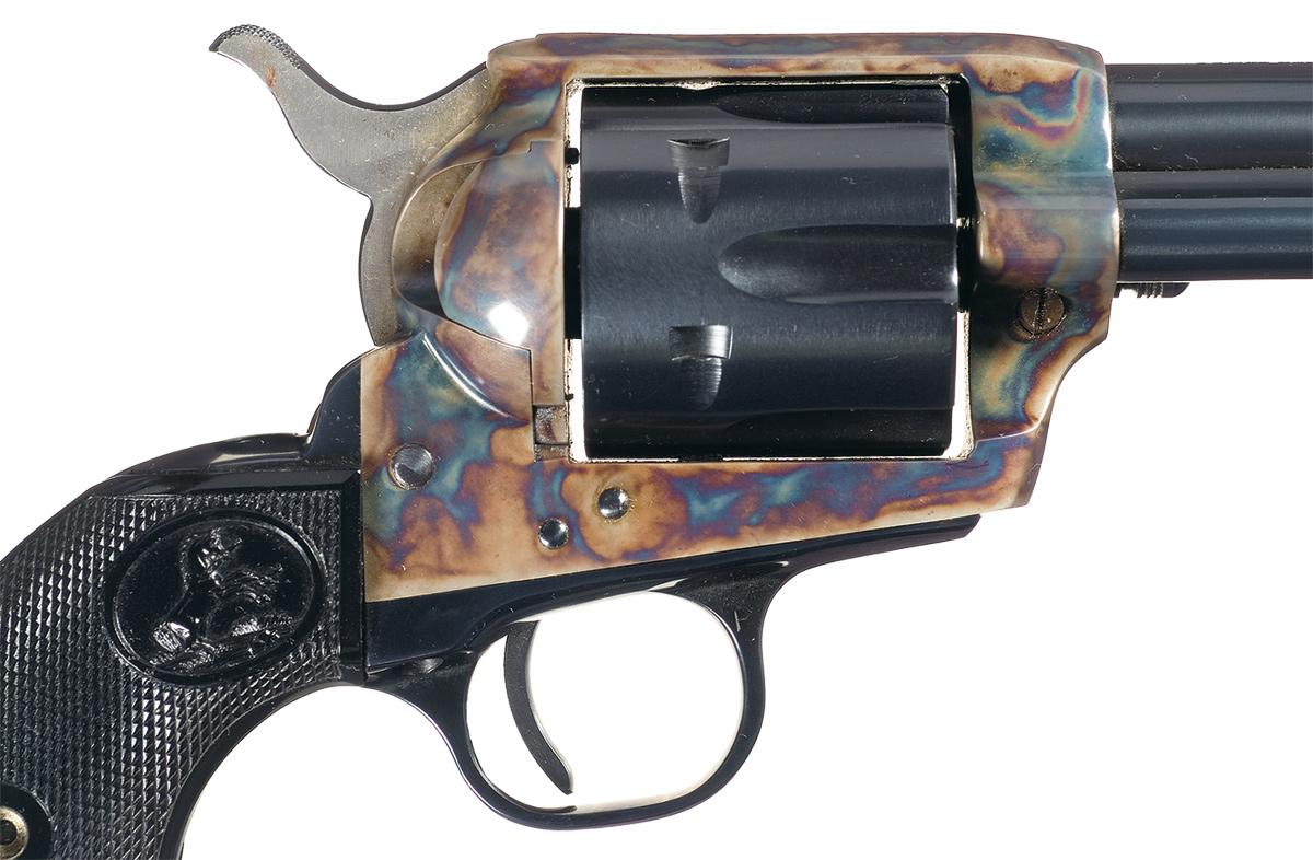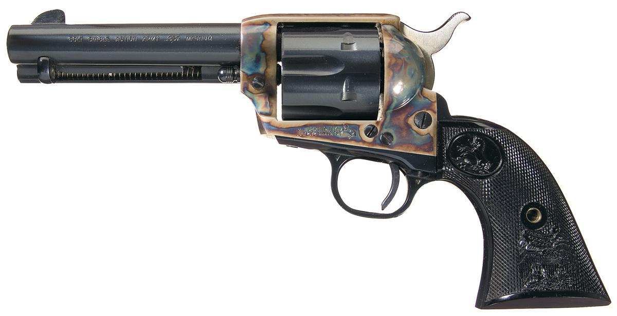 Manufactured in 1970, features the one line Colt address on the top of the barrel with the left side marked "COLT SINGLE ACTION ARMY .357 MAGNUM". The left side of the frame is marked with the two line, three patent date marking followed by the Rampant Colt. The matching serial number is marked on the bottom of the frame and on the left side of the front and back straps under the grip. Each grip panel is marked "367" on the inside. Casehardened frame and blue remaining parts. Fitted with Rampant Colt/Federal Eagle checkered grips.