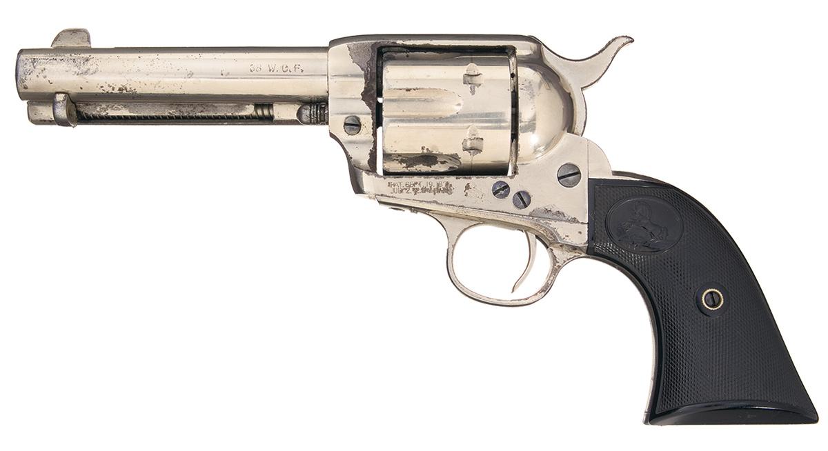 Manufactured in 1903. Fixed blade front sight and frame notch rear sight. The top of the barrel is marked "COLT'S PT. F. A. MFG. CO. / HARTFORD CT. U.S.A.", "38 W.C.F." on the left side and the left side of the frame is marked with the two line, three patent dates followed by the circled Rampant Colt. The matching serial number is stamped on the bottom of the frame, trigger guard, and backstrap. Fitted with checkered hard rubber grips with the Rampant Colt in an oval at the top. Consignor notes on tag say that the nickel finish will letter. Writer believes it to be correct, but has no letter to verify.