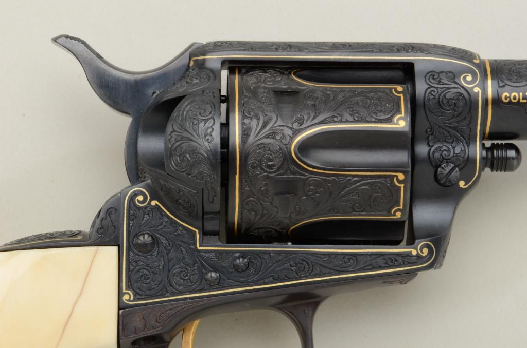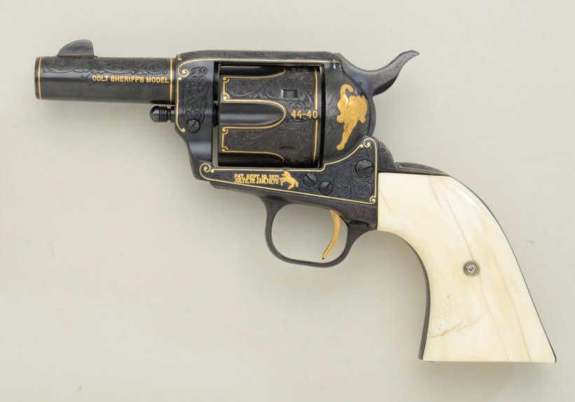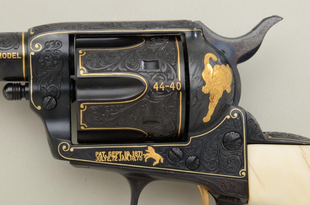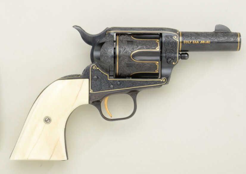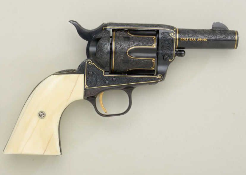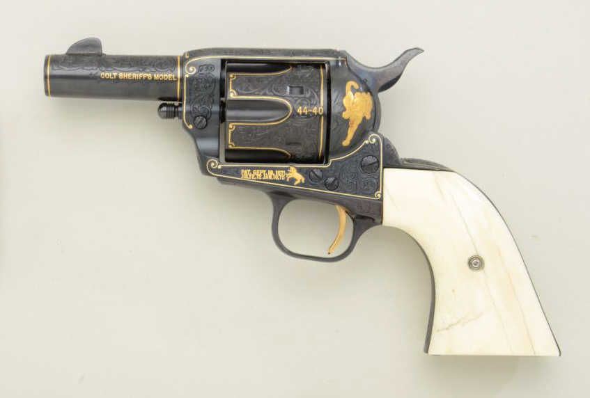 Colt Single Action Army Sheriffs Model .44-40 cal., 3" barrel, fully and finely gold inlaid by Angelo Bee with marine ivory grips, serial #SA40506. The left side of the recoil shield shows Angelo Bee's stampedsignature. The pistol is finely engraved in European scroll with flush gold inlaid borders and lettering, mountain lion or cougar on left side of recoil shield with rampant colt and patent dates also goldinlaid. The condition is fine to excellent as refinished at time of engraving; the marine ivory grips are from a walrus tusk and show some age cracking and yellowing. One of a series executed for noted SouthernCalifornia collector Dr. Barnes. Est.: $2,500-$5,000