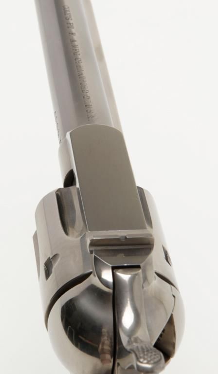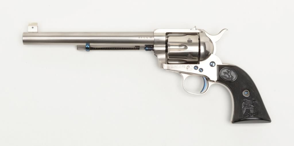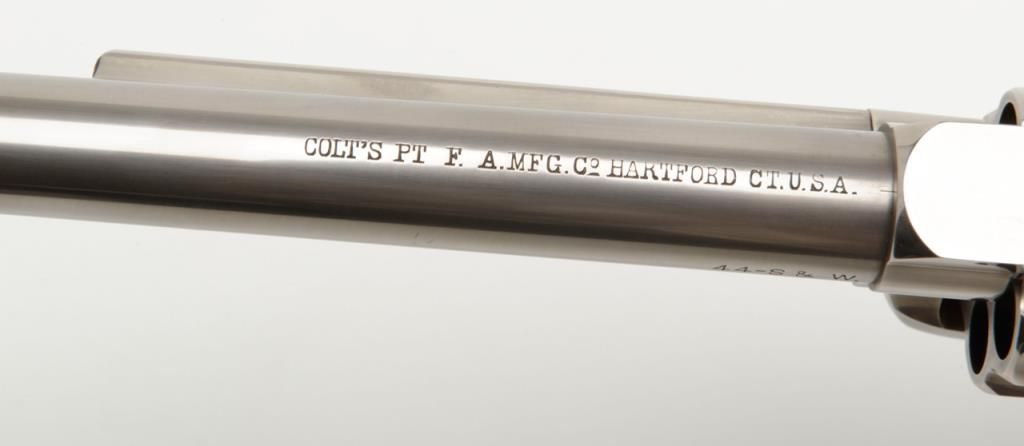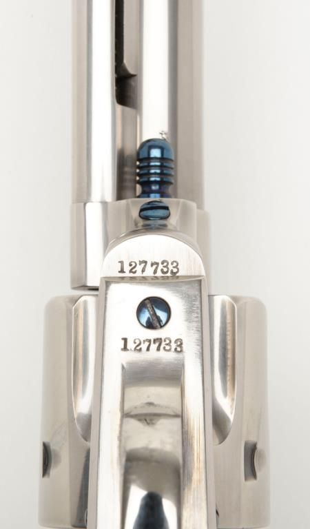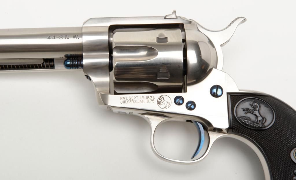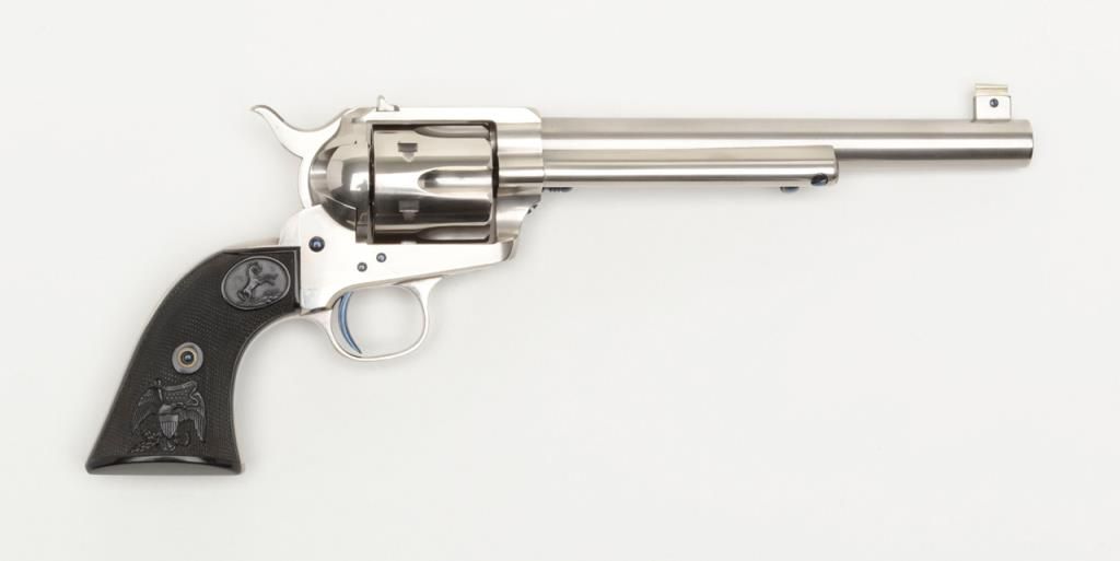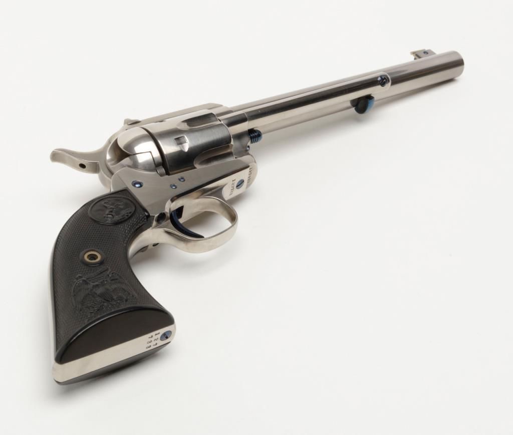 Colt Single Action Army flattop target model in .44 S&W caliber with 7 ½” barrel, nickel finish, hard rubber grips, serial number 127733. This target model was restored by Tom Haas Sr. for a prominent Salt Lake City, Utah collector manydecades ago and according to consigner's note “it letters as nickel, 7 ½” barrel, adjustable sights” but no factory letter available at time of cataloging and shipment date and destination not known. The lot includes an x-ray of the framedocumenting it to be an original flattop target model. The quality of the restoration is excellent and was probably accomplished in the 1960s or 70s when Mr. Haas did excellent work and was considered the finest restorer of Colts. Est.:$5,000-$10,000
