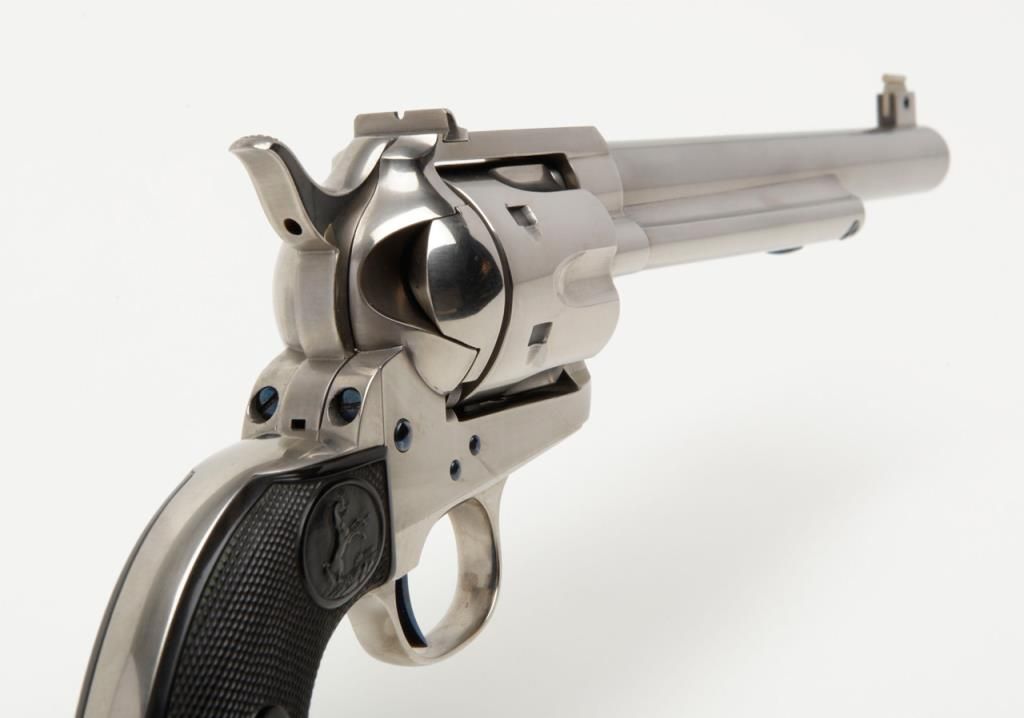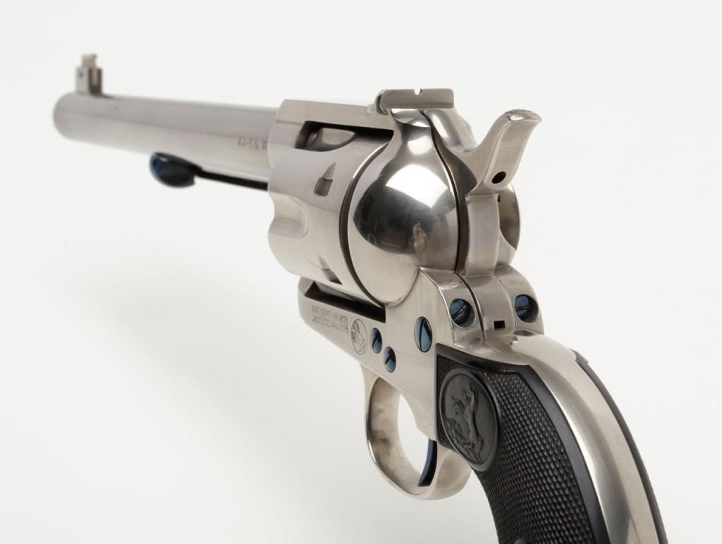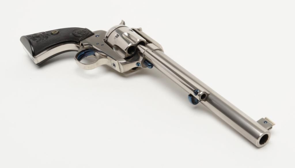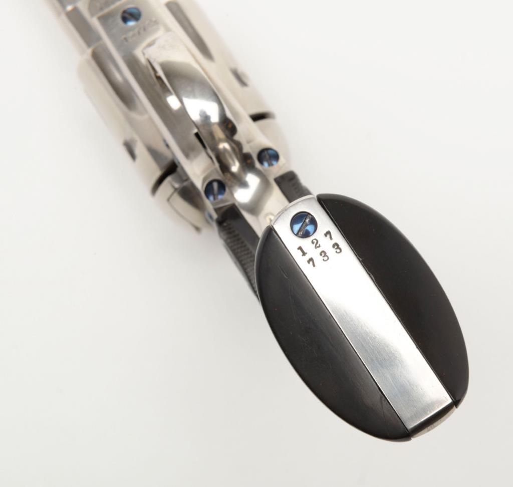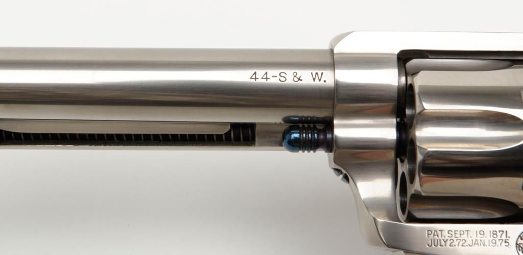 Colt Single Action Army flattop target model in .44 S&W caliber with 7 ½” barrel, nickel finish, hard rubber grips, serial number 127733. This target model was restored by Tom Haas Sr. for a prominent Salt Lake City, Utah collector manydecades ago and according to consigner's note “it letters as nickel, 7 ½” barrel, adjustable sights” but no factory letter available at time of cataloging and shipment date and destination not known. The lot includes an x-ray of the framedocumenting it to be an original flattop target model. The quality of the restoration is excellent and was probably accomplished in the 1960s or 70s when Mr. Haas did excellent work and was considered the finest restorer of Colts. Est.:$5,000-$10,000