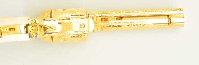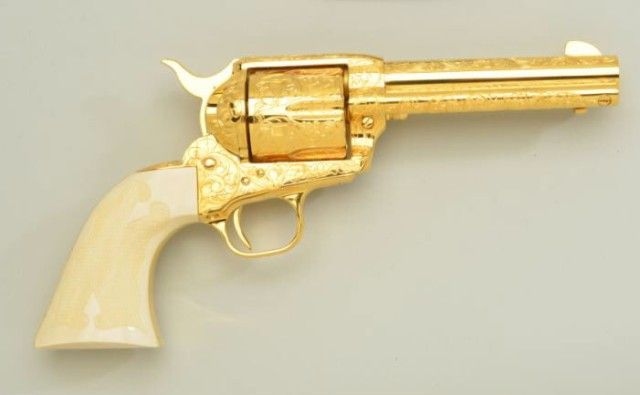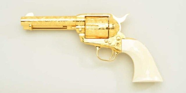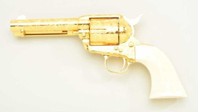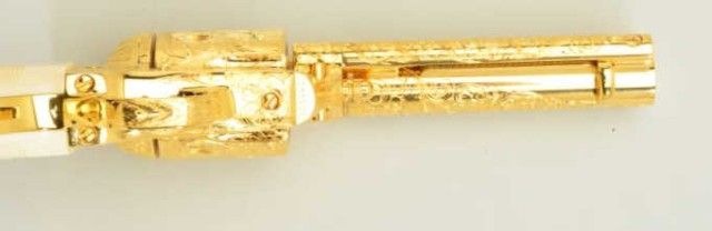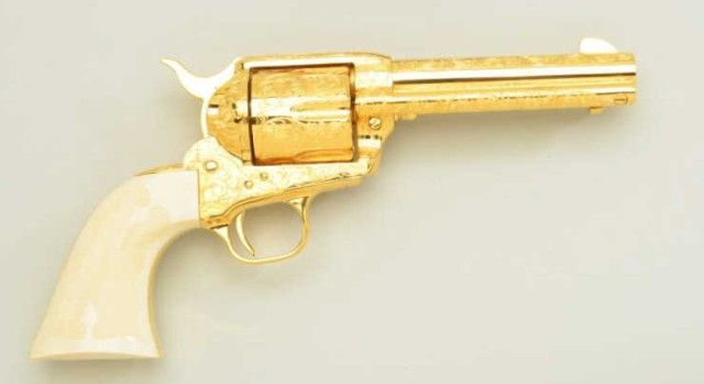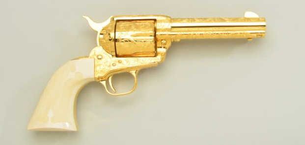 Colt Single Action Army revolver 357 magnum caliber 4-3/4” BBL, fully factory “D” engraved by master Colt engraver Jan Gwinnell, full gold plate, one piece fleur-de-lis checkered grips shipped to North Texas Wholesale July 30th 1992. One gun in shipment serial #TEXAN357. As new in original cardboard box with correct end label from Colt custom workshop. David Tate collection. Est.;$2,500-$5,000.