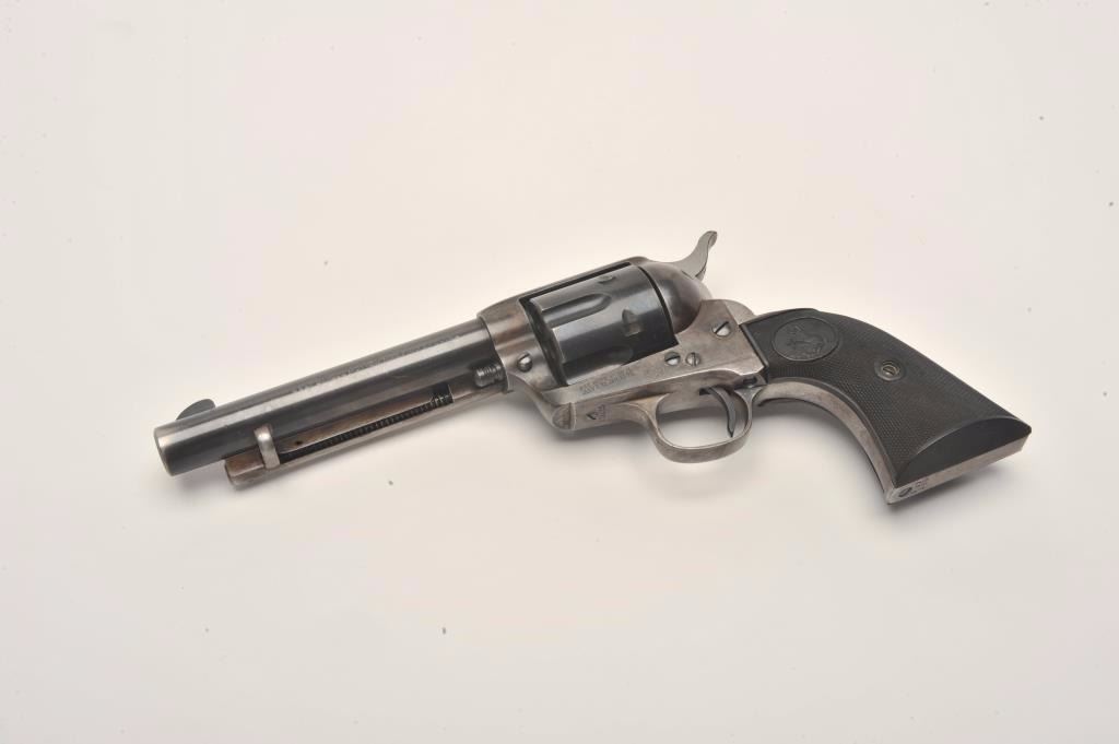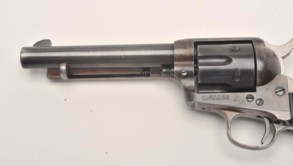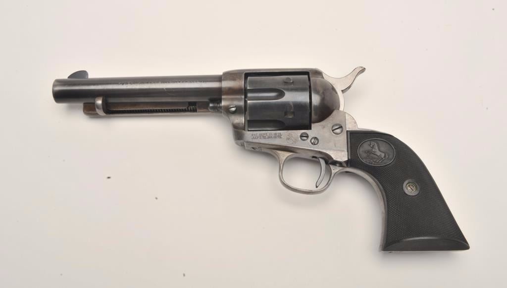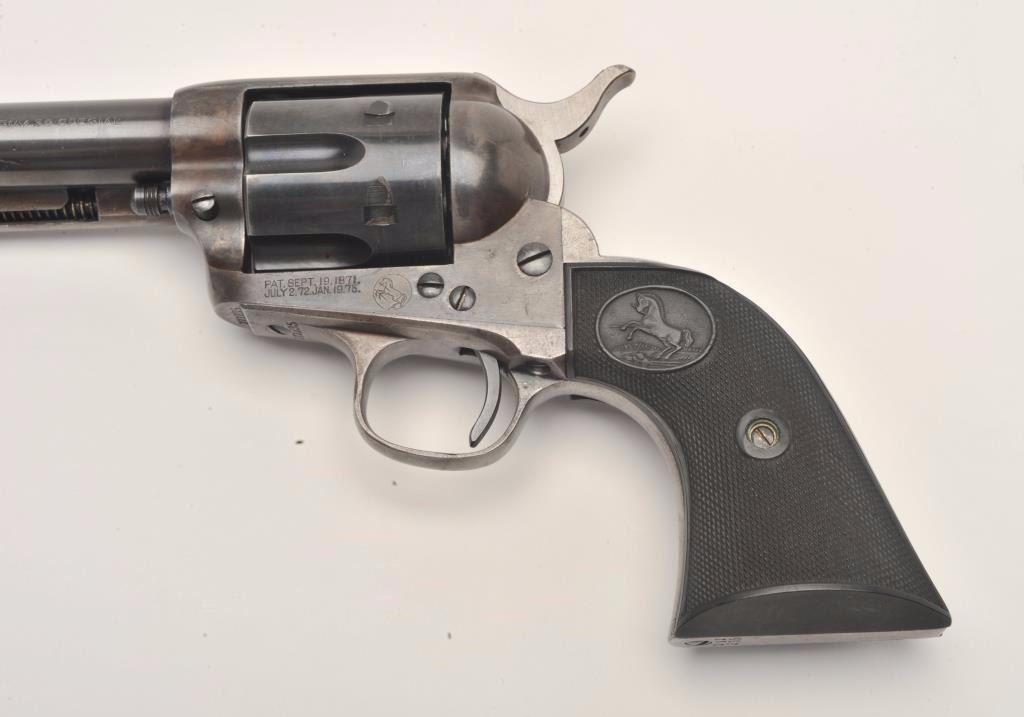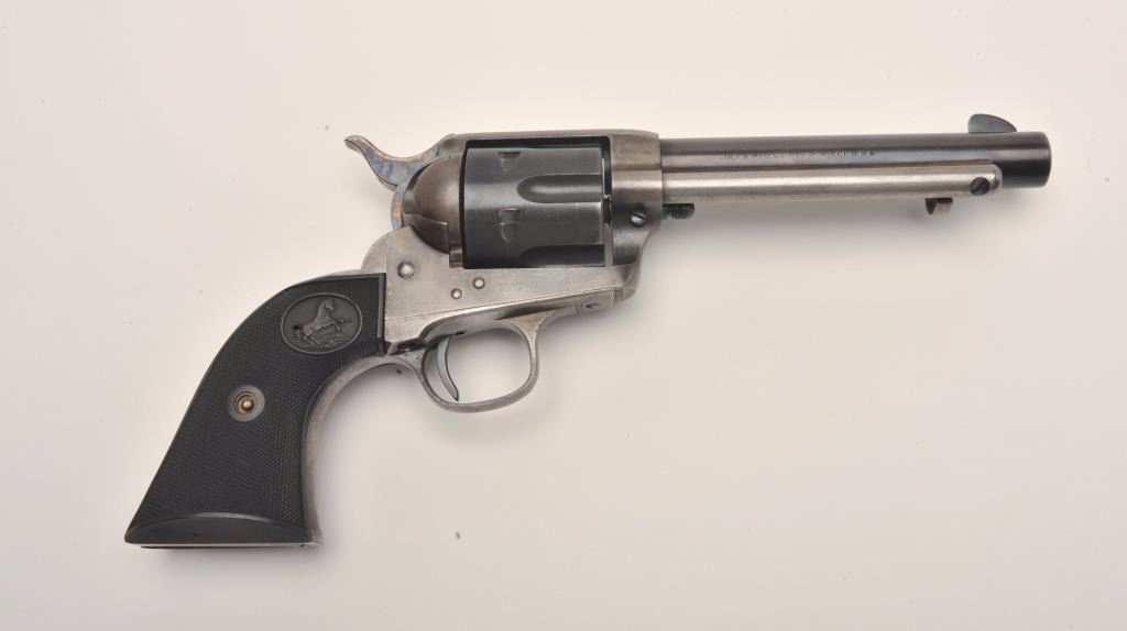 Colt Single Action Army revolver, .38 Special caliber, Serial #171235. The pistol is in very good to nearly fine overall condition with a 5 ½” barrel. The pistol has been re-barreled to .38 Special during the periodof use. The barrel retains nearly all of its blued finish as does the cylinder, while the front sight is full height. The frame shows significant muted case hardening while the hammer shows vivid color. The checkeredrubber grips are in very good condition showing little use while fitting very well. The bore is good, the action is crisp and markings are sharp. The pistol includes a factory letter indicating a manufacture dateof July 1, 1897, shipped to Simmons Hardware of St. Louis, Missouri with all features as described with the exception of the re-barreling. The pistol left the factory with a 4 ¾” .38/40 barrel. From the estateof Larry Gaertner. Est.: $1,200-$2,400. (Modern)