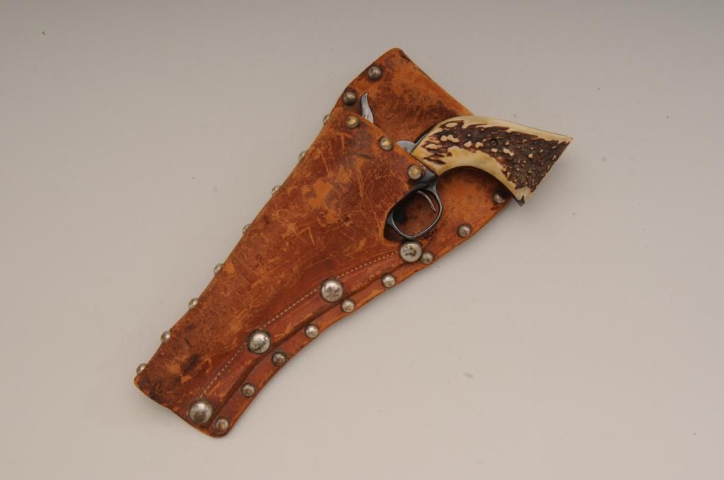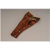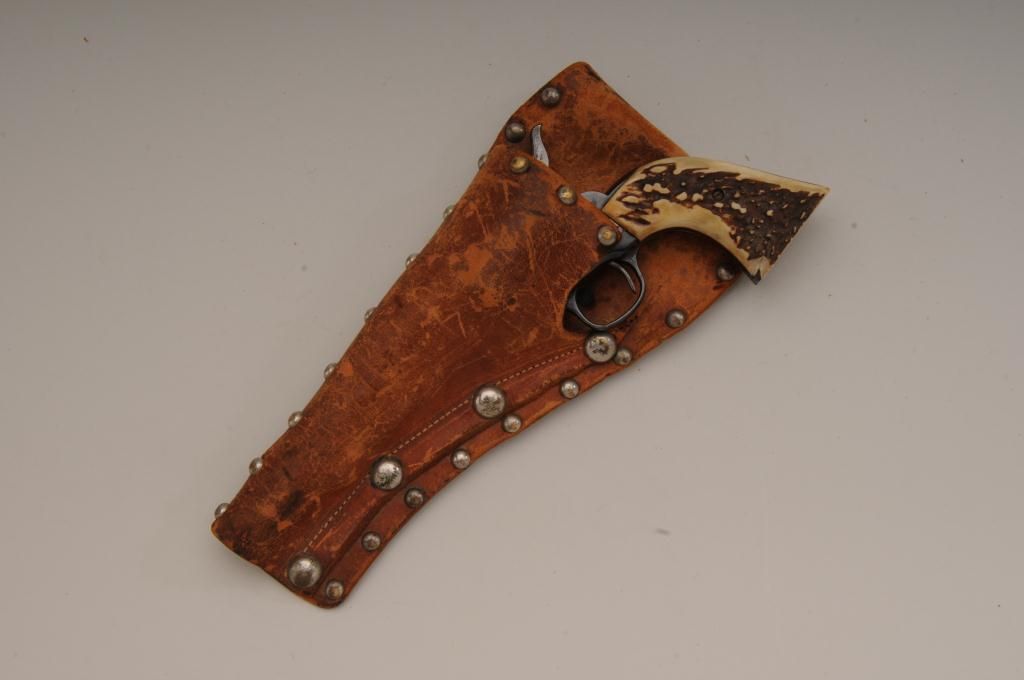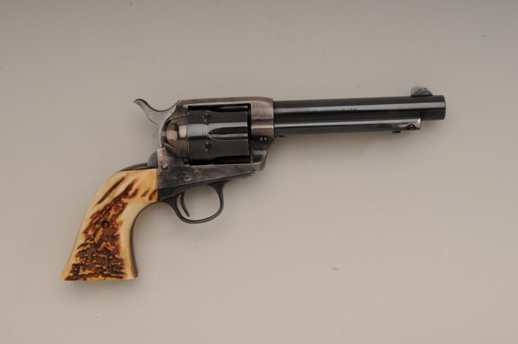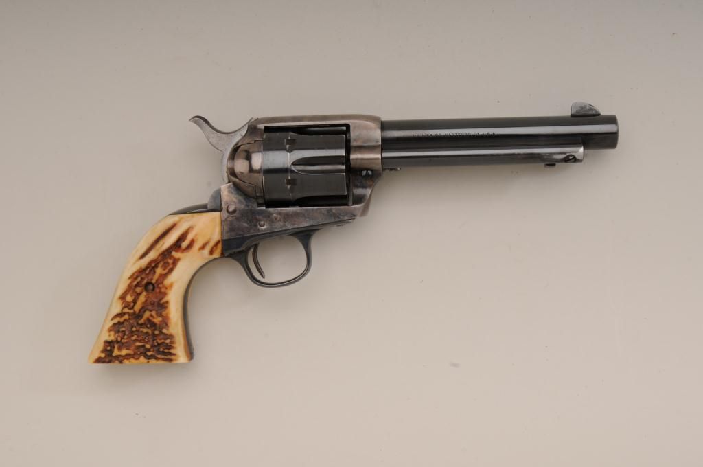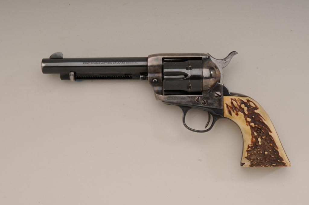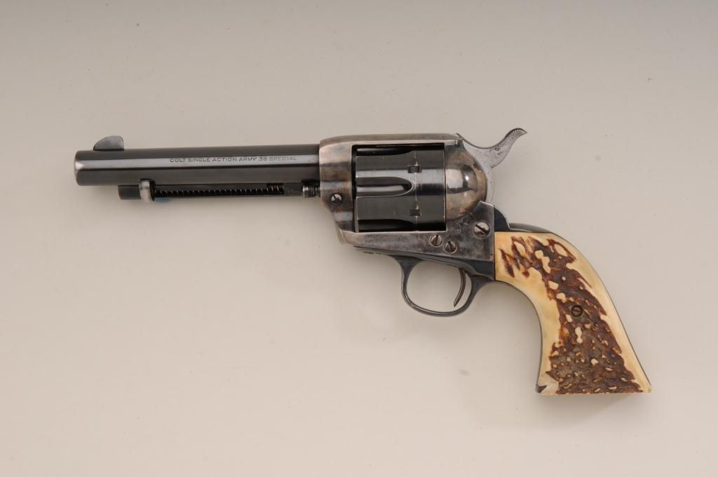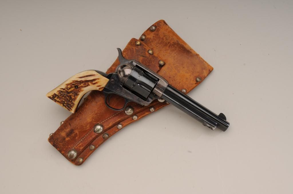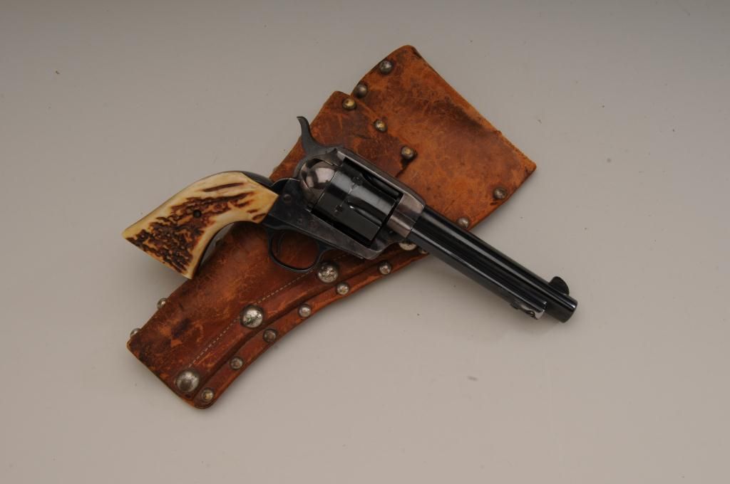 Colt Single Action Army revolver .38 special caliber with 5 ½” barrel, blue and case hardened finish, stag grips, serial number 325440. Factory letter indicates originally shipped as .32-20 caliber with a 4 ½” barreland blue finish, sold to Biddle P. Company shipped to Anaconda Copper Mine Company, Butte, Montana, October 12, 1910, 3 guns in shipment. This Colt revolver was returned to the factory shortly after World War II andshows the side barrel address and postwar cylinder. Approximately 90% to 95% of what appears to be a factory refinish is retained and the hammer is also post war style. The markings are good, the action is good, andthe bore is fine to excellent. The frame, trigger guard, and back strap numbers are all matching. A classic Western-style holster with nickel plated brass studs is also included. Seldom are single actions foundwith Montana mining history documented by factory letter. Est.: $1,000-$2,000.