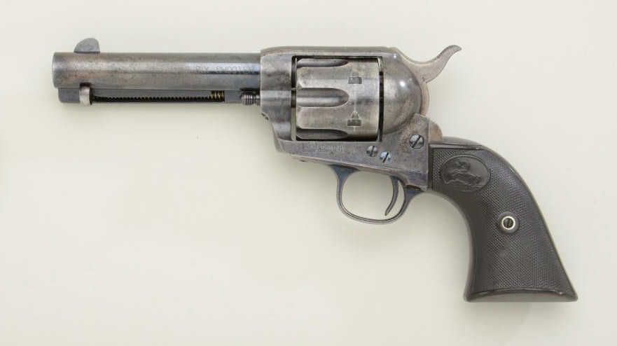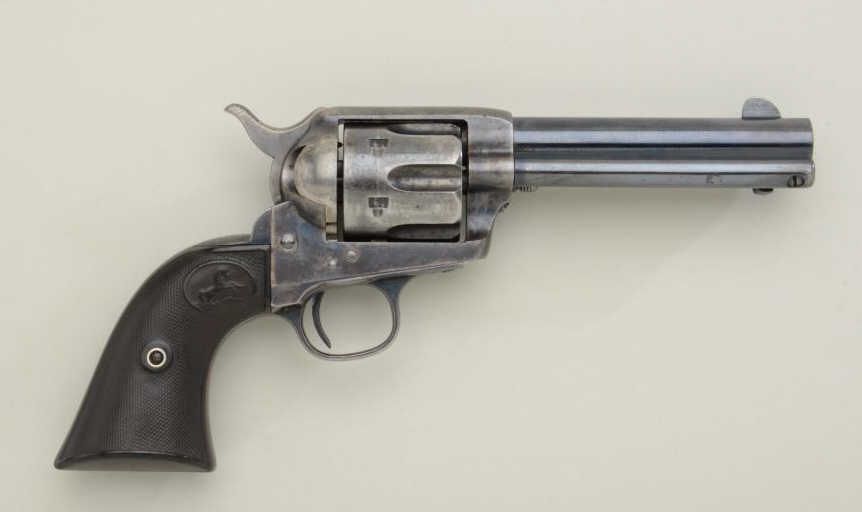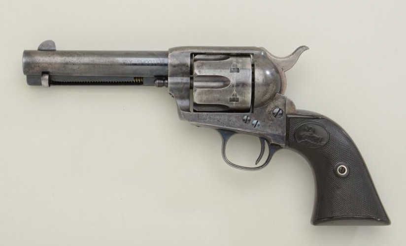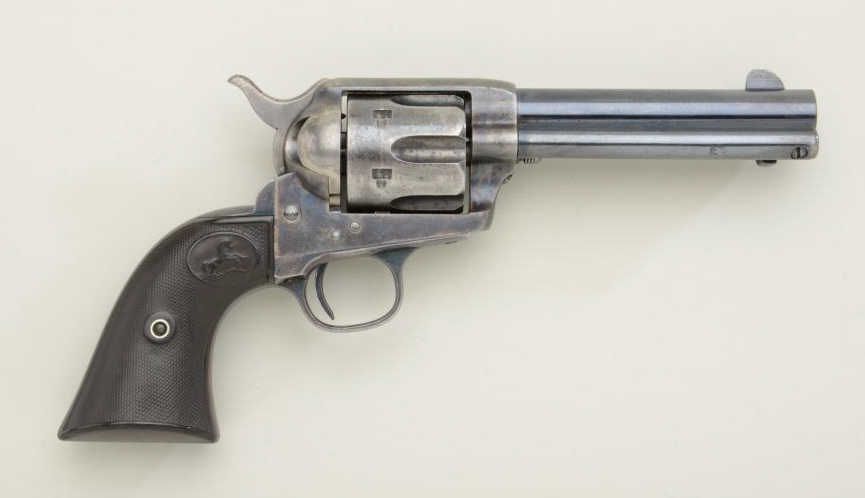 Colt Single Action Army revolver, .44-40 cal., 4-3/4" barrel, blue and case hardened finish, hard rubber grips, in very good original condition retaining considerable original finish, serial #145203. Colt wasshipped 3/15/1892 to Simmons Hardware in St. Louis with all features verified except grips not listed as per consigner's notes, who called the factory and received the information from Marty Huber long ago, but no letter at time of cataloging. The pistol retains approximately 50-70% original bright blue on barrel with good address and sharp roll die marked Colt Frontier Six Shooter. The loss of blue on left side from beingcarried in a right hand holster (the right side of the barrel is near mint). The ejector rod housing shows 90-95% original blue, the cylinder shows 40-60% blue drifting on the edges to a light patina. The frameshows 60-70% case hardening that is dulling and toning on the left, still colorful on right. The backstrap and trigger guard show 30-60% original blue; the grips fit impeccably and are at least very good with