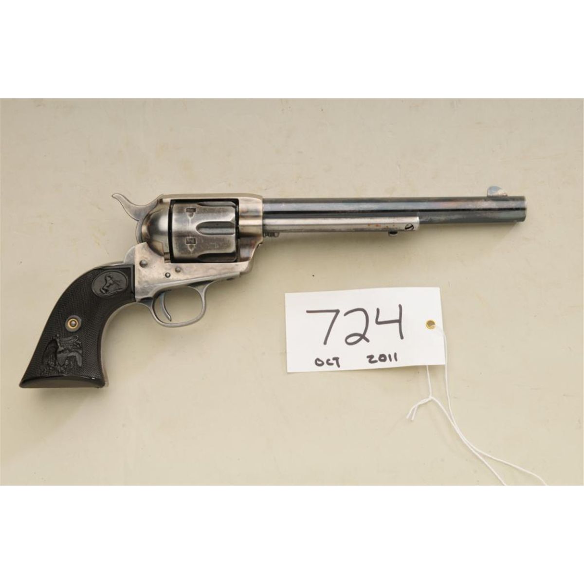 Colt Single Action Army revolver, .44-40 caliber, 7-1/2” barrel, blue and case hardened finish, hardrubber eagle grips, serial #155857. Shows Colt Frontier Six Shooter large roll die marking on left sideof barrel. The barrel shows 40-60% bright original blue finish that is drifting and toning with some areas of inky blue finish retained. The front slight is very slightly slimmed at its top edge and shows most of its original blue. The muzzle and markings are sharp. The ejector rod housing shows 50-60% original blue drifting on the edge but bright in the groove. The cylinder shows 20-30% original blue, mostly in the flutes with some scratches and even loss of finish. The frame shows 30-50% case hardening drifting to silvery grey with some rainbow colors showing lightly. The backstrap and triggerguard show traces of blue above 10%. The hard rubbereagle grips fit well and are very good with some slight edge wear. The hammer shows 30-50% case hardening. The small parts and screws show original finish. The action is good, the bore is good and generally good