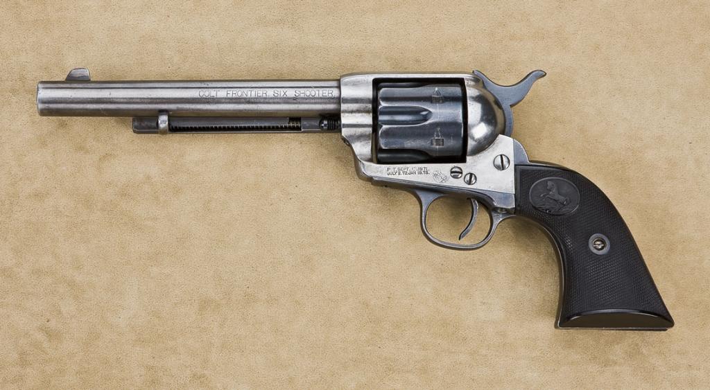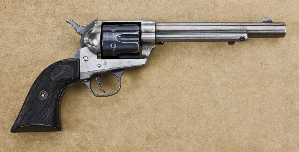 Colt Single Action Army revolver, .44-40 caliber, blackpowder era, barrel reduced to 6-1/2”, traces of blue and case hardened finish, hardrubber grips, serial #162082. The revolver shows approx. 20-40% of an old reblued finish which has been cleaned to bright over most of the Colt’s surface. The front sight has been set back to the shorter barrel length and reshaped. The barrel shows Colt Frontier Six Shooter markings and barrel address and patent dates are visible. The hardrubber grips are from a later Colt and have been fitted. Some small parts are replaced including cylinder pin. Action good, bore fair to good. The numbers on the frame, backstrap, and triggerguard are matching. Est: $900 - $1,800