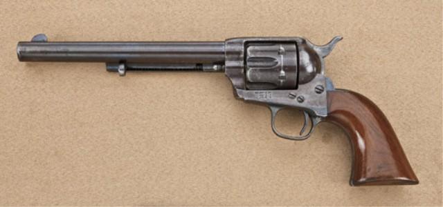 Colt Single Action Army revolver, .44-40 caliber, blue and case hardened finish, varnish wood grips, serial #40956. The rear of triggerguard bow is stamped .44 CF and the barrel appears to have never been etched. The barrel retains 20-30% original blue within a browning patina with some very bright blue on the sight and where protected. The front sight has been slimmed just slightly. The barrel address is sharp, the ejector rod housing shows 40-60% original blue, mostly in the groove and bottom, thinning on the edge and also bright. The cylinder shows 20-30% dulling blue drifting to brown. The frame shows traces of case hardening going to browning patina with some case color near the hammer where protected and in the groove on top of frame. The cylinder shows an index line between the cylinder stops. Dates are sharp and crisp. The triggerguard and backstrap show 10-20% blue where protected, the varnish wood grips show 80-90% varnish with some small losses and wear at the edges. The hammer shows 20-30% case hardening and is its correct early type. The action is type, the bore is very good plus. The cylinder pin and early ejector rod head are retained. A collector’s grade early .44-40. Refer