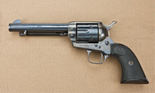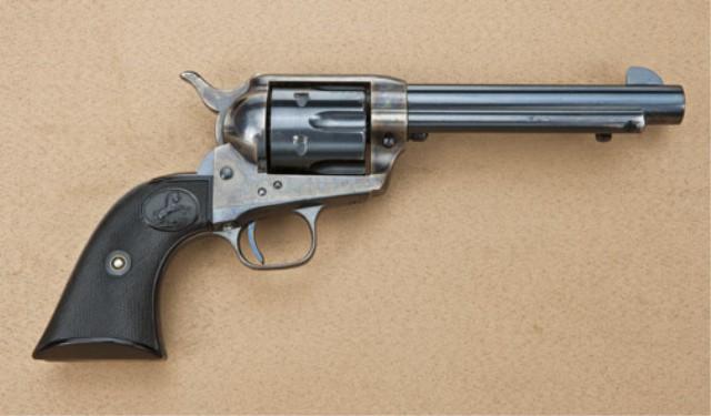 Colt Single-Action Army revolver, .44 S&W special and Russian dual caliber, 5-1/2” barrel, blued and case hardened finish, shipped to Tufs-Lyon Arms Co, Los Angeles, CA, October 1928, one gun in shipment, factory letter confirms all features, serial #352740. The revolver remains in fine to near excellent original condition showing 90-095% original blue on barrel, some slight loss at the muzzle, a couple of minor scratches and marks on the left side, but generally crisp and still inky and bright. The front sight has been slimmed just a hair at the top. The ejector rod housing shows 90% blue with some loss at the front edge. The cylinder show 85-95% blue, some slight losses at the edges, feint index line, normal aging. The frame show 80-90% case hardening, still very colorful, some minor erosion and drifting just starting. The backstrap and triggerguard show 75-85% original blue with some loss on the backstrap from sweat and handling and some minor light erosion. The grips show a small chip from left bottom edge, some slight edge wear, normal use, and at least very good and would be near fine other than the chip. The hammer, 85% plus original case hardening. The action is tight, the