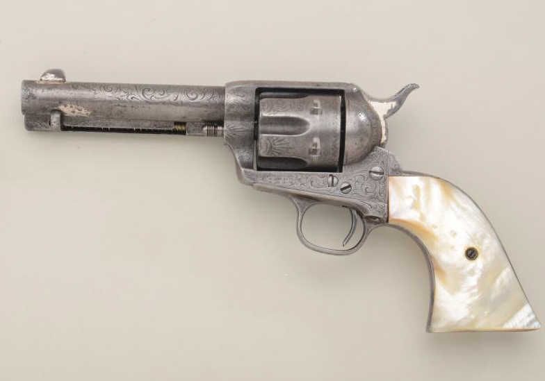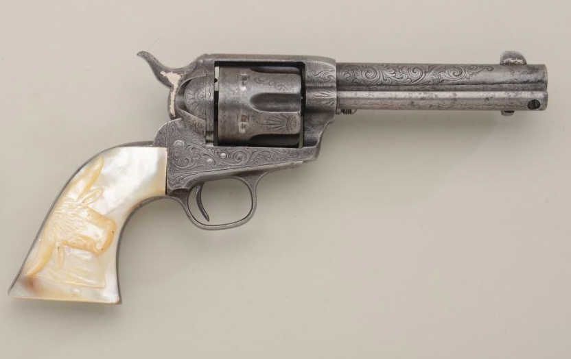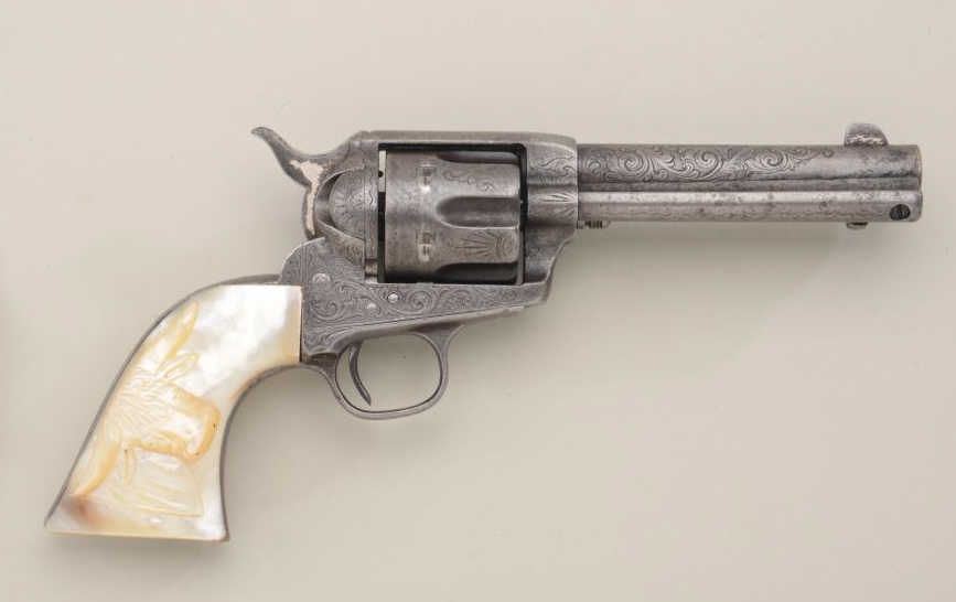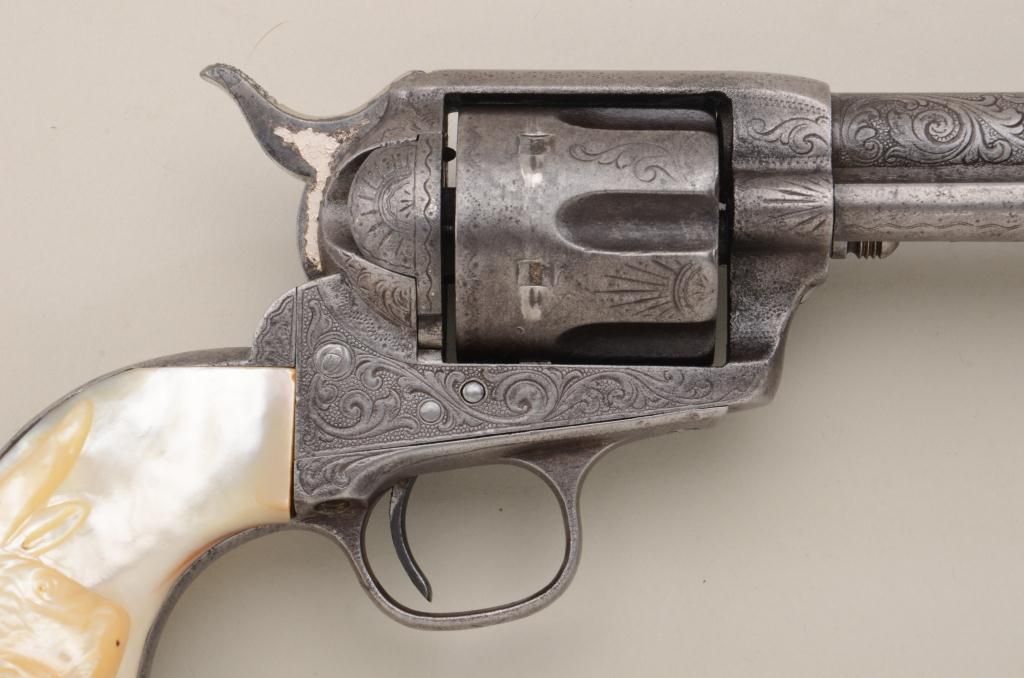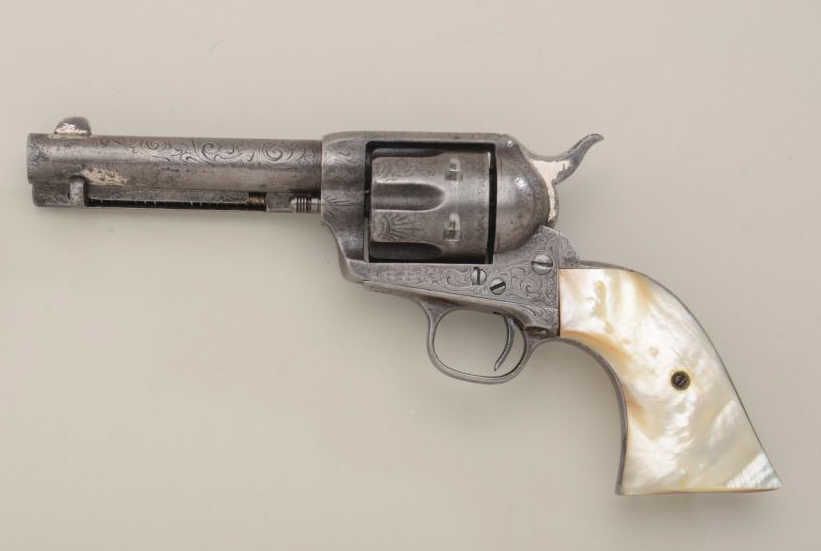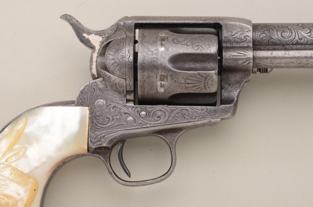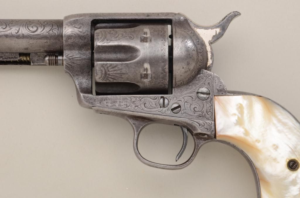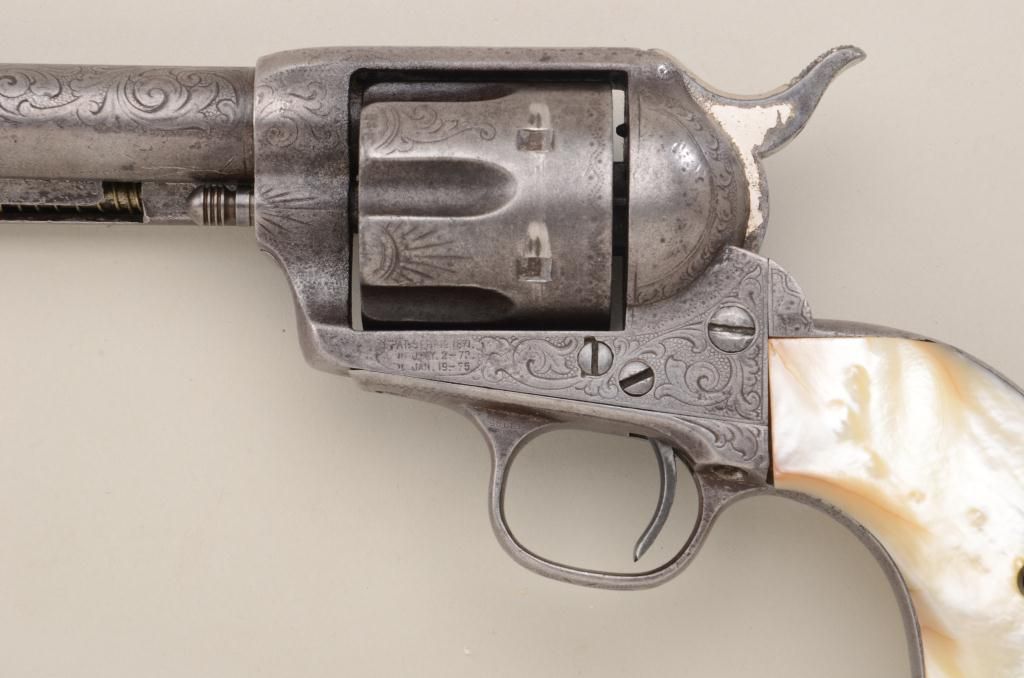 Colt Single Action Army revolver, .45 Colt cal., 4-3/4" barrel, factory engraved, nickel finish, raised carved pearl grips, shipped to Simmons Hardware St Louis MO November 3, 1889, 2 guns in shipment, all featuresconfirmed by factory letter except barrel length not listed and stocks listed as rubber (Colt allies like Simmons often added aftermarket pearl grips to increase their margin of profit). The revolver shows traces of original nickel drifted to gray brown with scattered light to moderate pitting and some slightly heavier pitting at the muzzle. The metal surfaces show a little wear at the edges, the markings are slightly light,engraving also slightly worn from being carried in a holster. The grips are nicely carved in high relief with a great steer's head and fit well. The front sight has been trimmed slightly, the action good, the borefair. An attractive factory engraved black powder that shows honest use and was carried a long way in a holster from the pattern of wear. Est.: $7,000-$14,000