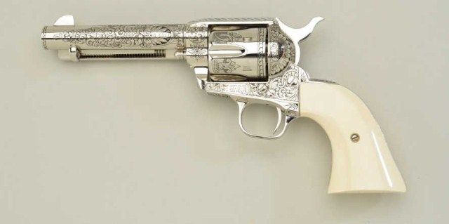 Colt Single Action Army revolver 45 Colt cal 5-1/2” barrel, factory master engraved by Robert Burt and factory inscribed on inside of strap “made EXPLY for DAVID K. TATE, Amarillo, Texas- May 3rd ‘95” The revolveris class “C” engraved with Helfricht influence and baked black accents on nickel finish. With factory ivory grips and special serial number assigned “TEXAN1” all features confirmed by factory letter on a one guncustom order, shipped 1995 it includes Colt factory display case and photographs of work in progress and display case. Est.;$3,500-$7,000.