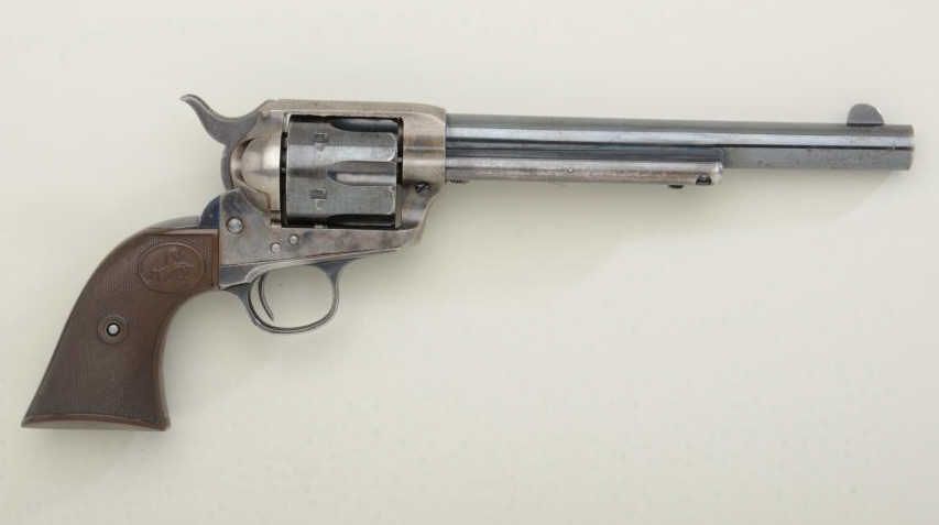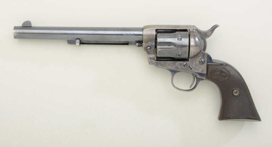 Colt Single Action Army revolver, .45 Colt cal., 7-1/2" barrel, blue and case hardened finish, hard rubber grips, serial #240658, made shortly after turn of century. The pistol remains in very good+ to near fineoriginal condition, showing 85-95% original blue on barrel, with some slight thinning at the muzzle and edges, some minor scratches and just beginning normal age. The ejector rod housing shows 50-60% bright blue,drifting on the edge and mostly retained in the groove. The cylinder shows 75-85% blue with an index line, some scratching. The frame shows 60-70% case hardening drifting to silver and patina with some very colorfulrainbow areas still prominent. The hammer shows 50-70% mottled case hardening with some browning and patina. The backstrap and trigger guard show 30-50% bright blue drifted at the gripping area. The hard rubber grips fit impeccably, and show a nice brownish patina and remain in very good condition. All matching serial numbers, crisp markings, front sight slimmed minutely at the top, sharp markings, good action, fine bore. A