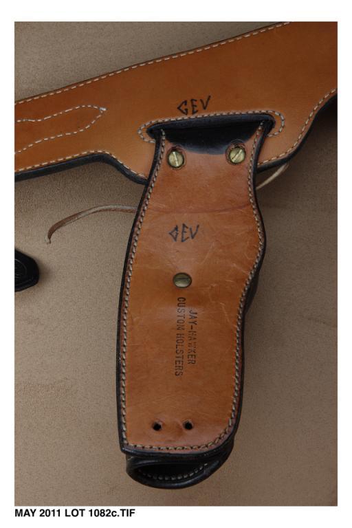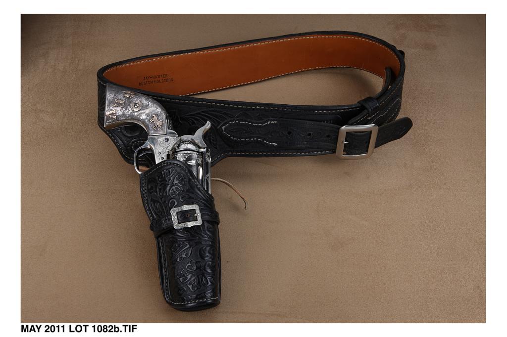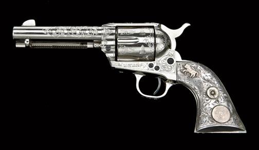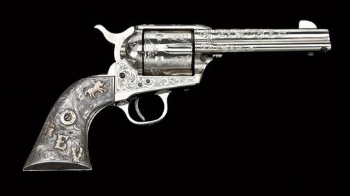 Colt Single Action Army revolver, .45-caliber, 4-3/4” barrel, 2nd Generation. Finely engraved by Bill Johns, serial #57327SA, nickel plated, gold and silver handmade ornate grips with carved and tooledquickdraw holster. Pictured on page 520 of Colt Engraving. This revolver was made on custom order for George E. Virgines, author of Saga of the Colt Six-shooter and other books and articles on Colt Single Actions.Virgines was a old-time collector, quickdraw artist, and exhibition shooter who was also an active member of The Westerners group. Pistol shows approx. 98% to 99% plus original finish, some slight handling and minor use.The left grip is nicely engraved with gold inlays of Rampant Colt, Aztec calendar, and fancy escutcheon around screw. Right grip also shows Rampant Colt, fancy escutcheon, and initials, “GEV”. The holster is marked“J. Hawker Custom Holsters” and shows two Western-type buckles. Initials “GEV” penned on interior. With display case. A very fancy single action by a well known engraver that is well documented in the most recognized