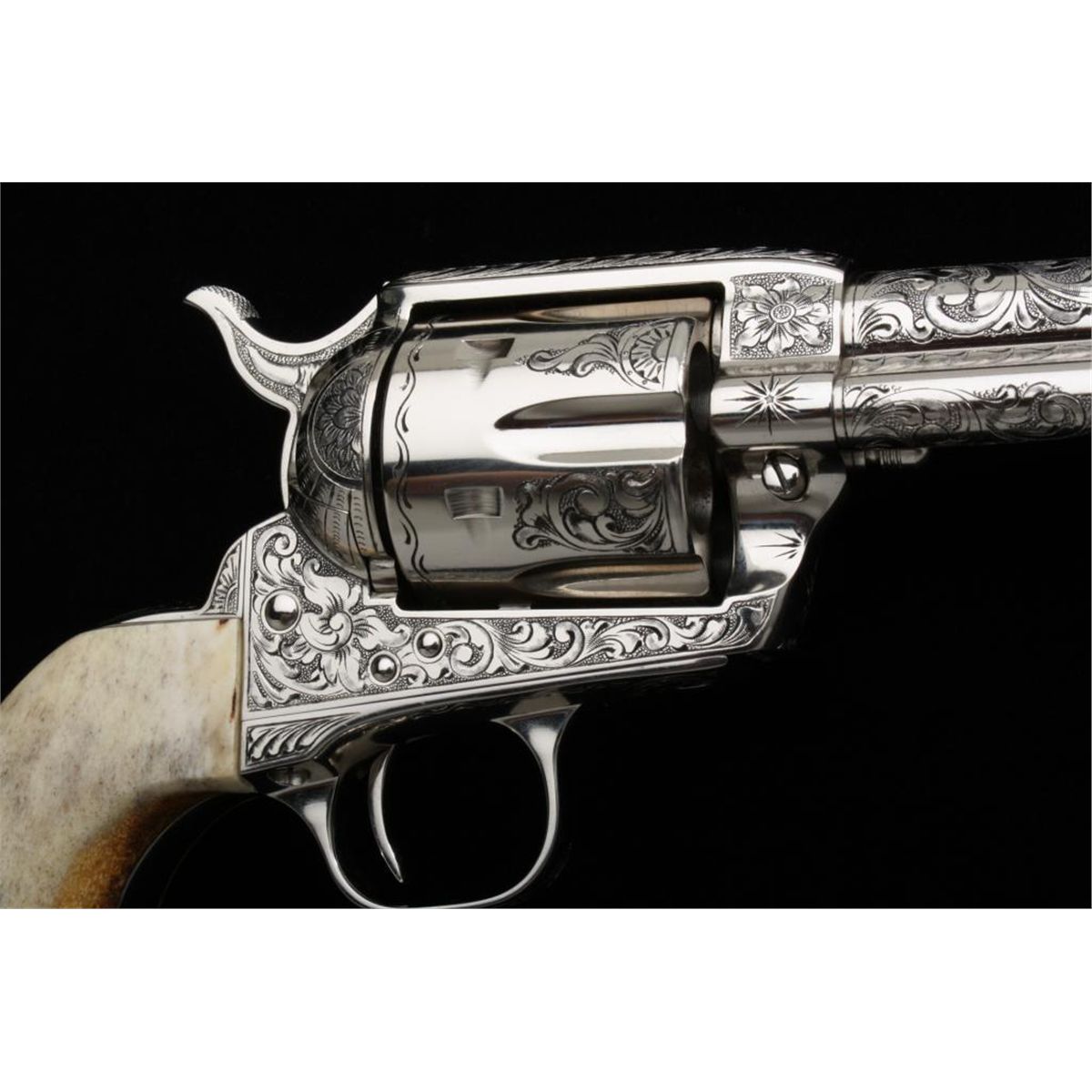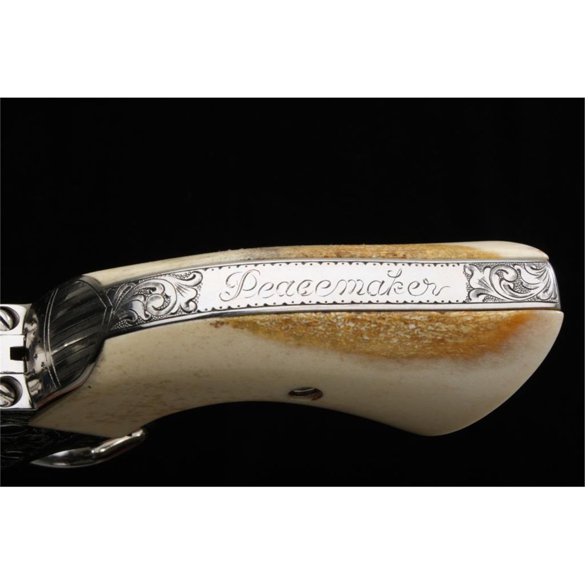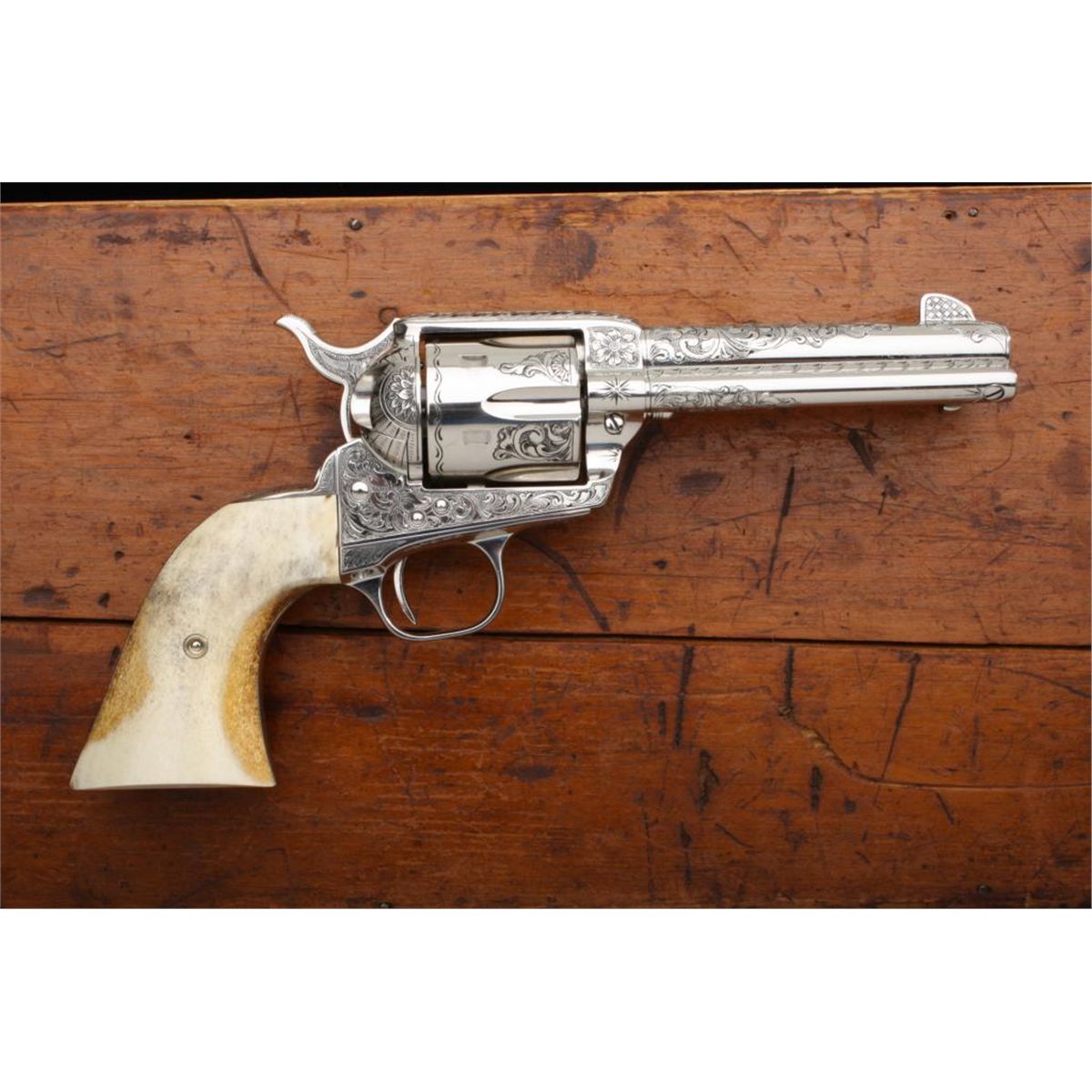 Colt Single Action Army revolver, .45 caliber, 4-3/4” barrel, finely engraved by John J. Adams Sr., nickel plated, bone grips, serial #S18135A. The revolver shows finely executed scrolls with cross-hatch engravedfront sight, “Peacemaker” engraved in script on backstrap, union shield on top of strap behind hammer, and a mixture of 19th century and Helfrict style scrolls. The condition is fine to excellent and shows no use sinceengraving, just possible handling. Marked under grips “Eng. J. A. Sr. 1998”. Includes a letter on Adams & Adams Custom Engravers stationary, signed by John J. Adams Sr. confirming his work. Est: $2,500 - $5,000