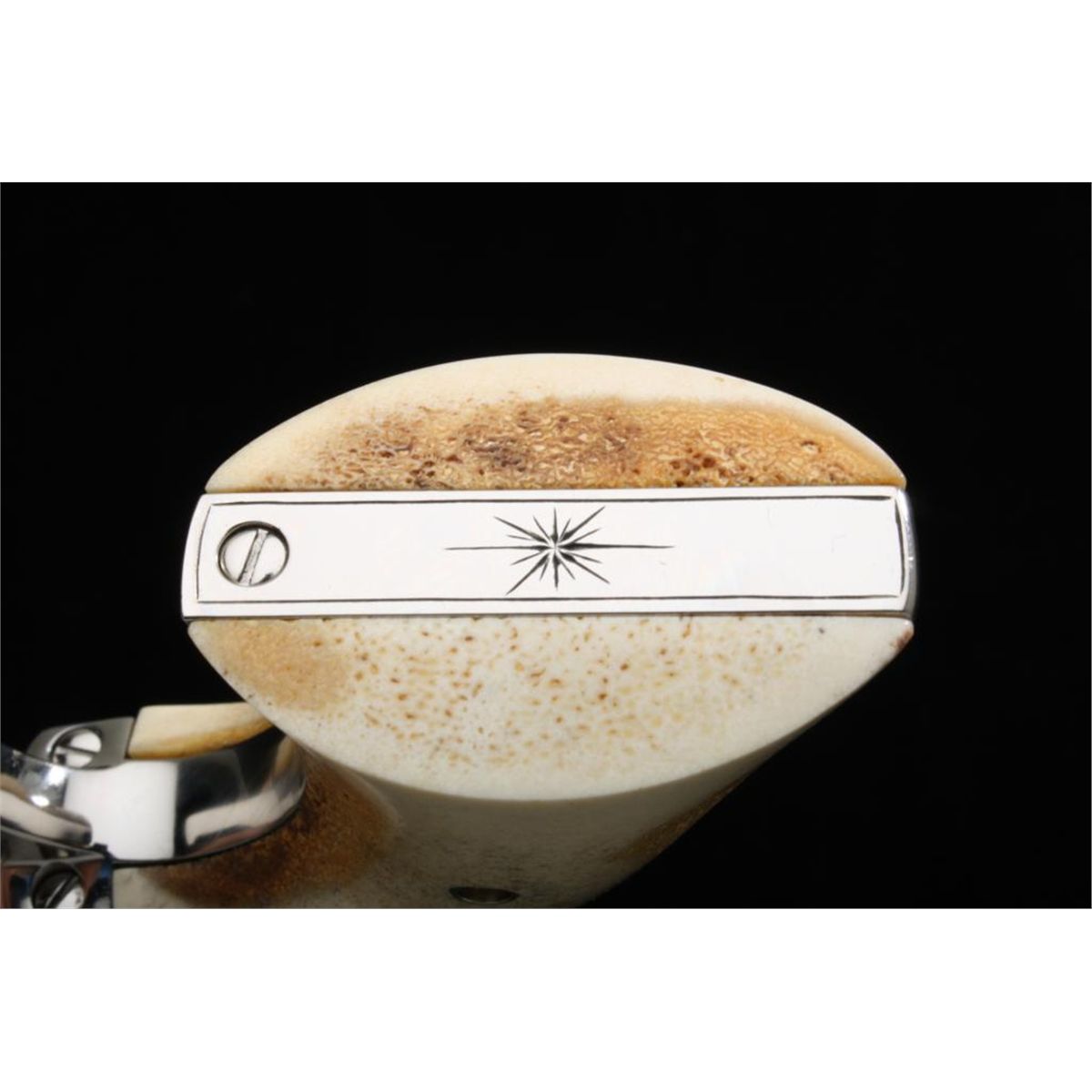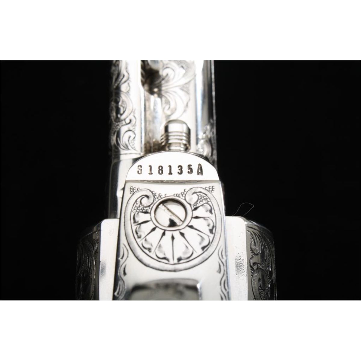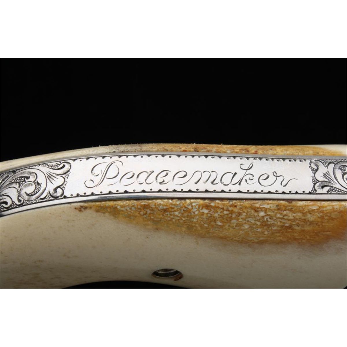 Colt Single Action Army revolver, .45 caliber, 4-3/4” barrel, finely engraved by John J. Adams Sr., nickel plated, bone grips, serial #S18135A. The revolver shows finely executed scrolls with cross-hatch engravedfront sight, “Peacemaker” engraved in script on backstrap, union shield on top of strap behind hammer, and a mixture of 19th century and Helfrict style scrolls. The condition is fine to excellent and shows no use sinceengraving, just possible handling. Marked under grips “Eng. J. A. Sr. 1998”. Includes a letter on Adams & Adams Custom Engravers stationary, signed by John J. Adams Sr. confirming his work. Est: $2,500 - $5,000