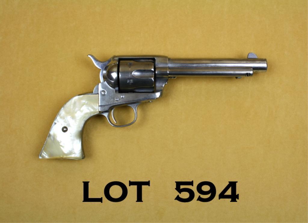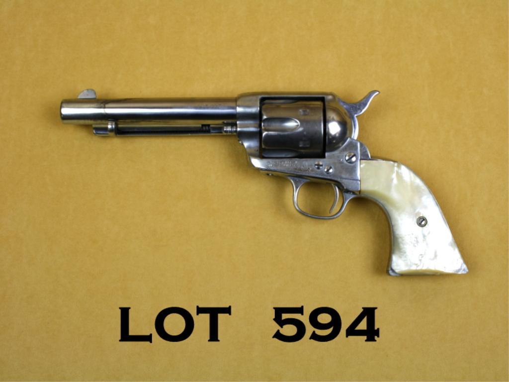 Colt Single Action Army revolver, .45 caliber, 5-1/2” barrel, old resilvered finish, pearl grips, #150480. The revolver shows approx. 60-80% old silver finish, which is starting to drift and wear. Some erosion and pinprick pitting where lifted. The front sight is slimmed slightly. The markings are good, all matching visible serial numbers. Good action, good bore, good overall. The original to the period pearl grips show several chips and losses and are fair only. Action good, markings good, bore good. The silver was applied to the revolver long ago and would be interesting to research factory letter to see if it was originally silver plated and just resilvered. Est: $1,500 - $3,000