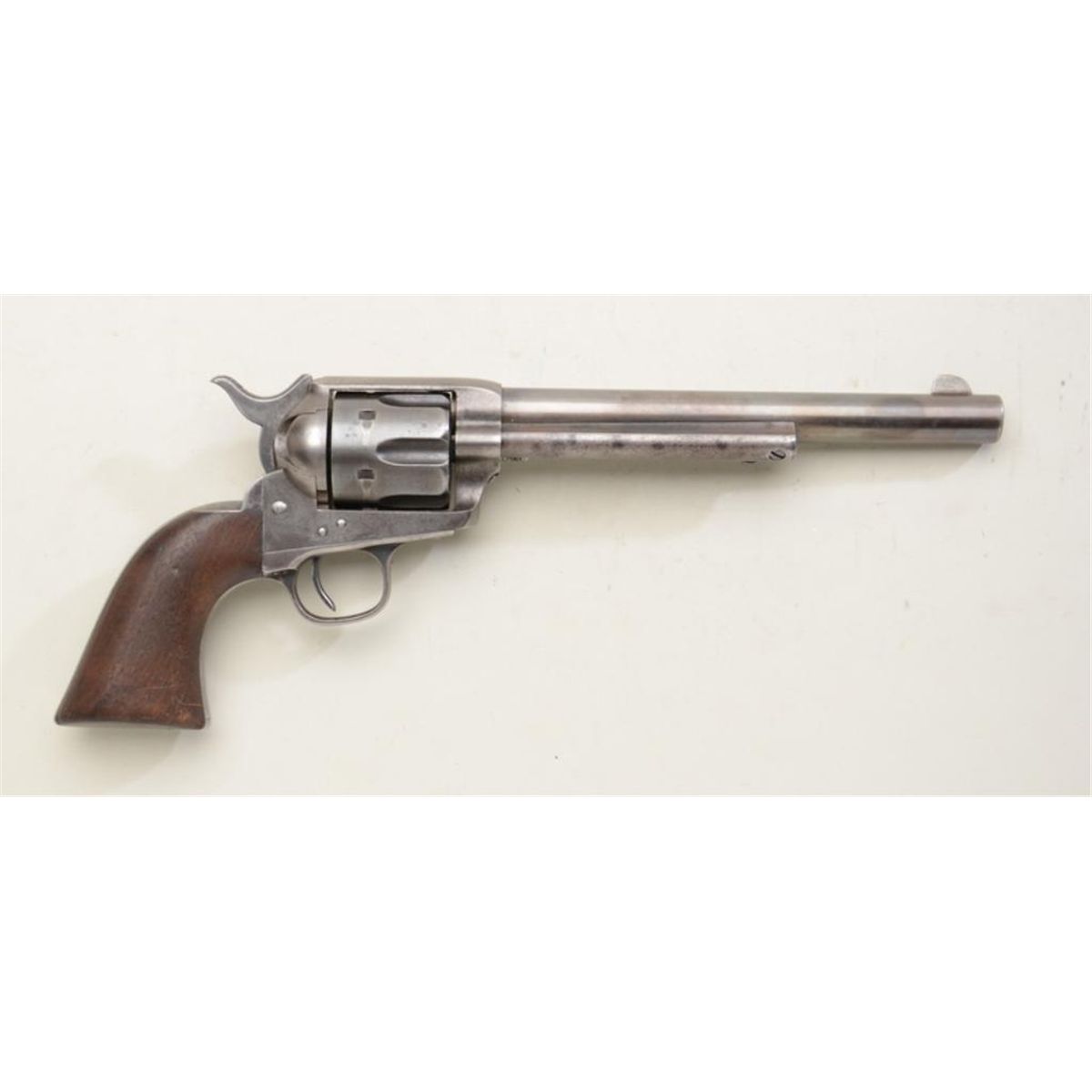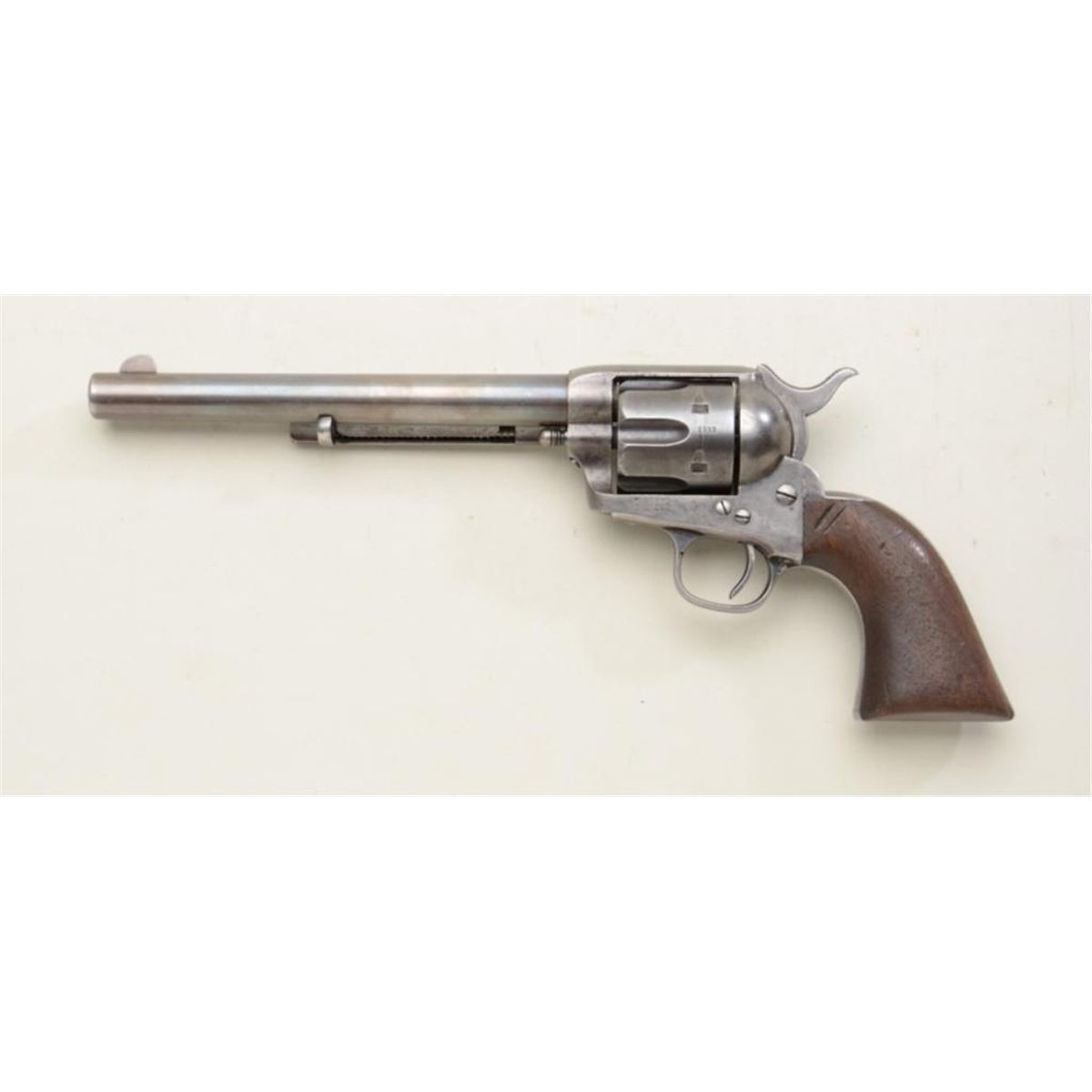 Colt Single Action Army revolver .45 caliber, 7-1/2” barrel, blue and case hardened finish, wood grips, serial #107333. Factory letter confirms features except barrel and stocks “Not Listed”. Shipped to Harley &Graham, New York, NY. July 18, 1884. 50 guns in shipment. The revolver remains in original good to very good condition showing a strong 10-20% original blue and case hardening drifting to patina with some light cleaninglong ago in period of use. Some very light scattered erosion and pinprick pitting. Good markings, good edges. Front sight slimmed slightly. Grips show a few dings, mars, scratches, but are also good. The three-linepatent date, caliber marking, and barrel address are all good and visible. All matching serial numbers. There are two notches cut at the left top grip. The triggerguard and hammer show some brightfinish as does the backstrap where protected. The action is tight, the bore is good to very good. A good example of a frontier era Colt. Dr. Sterling Fenn collection. Est: $3,250 - $6,500